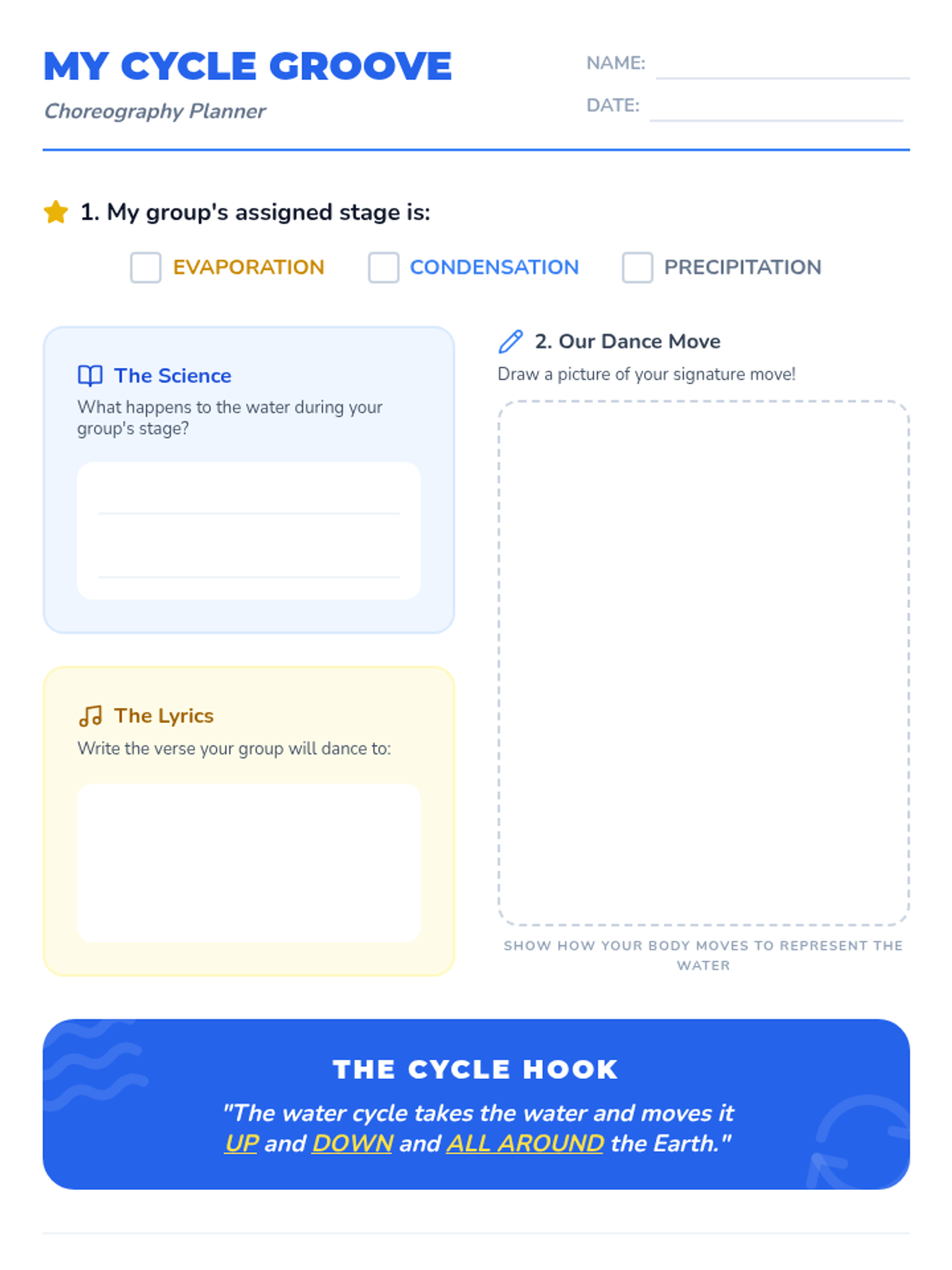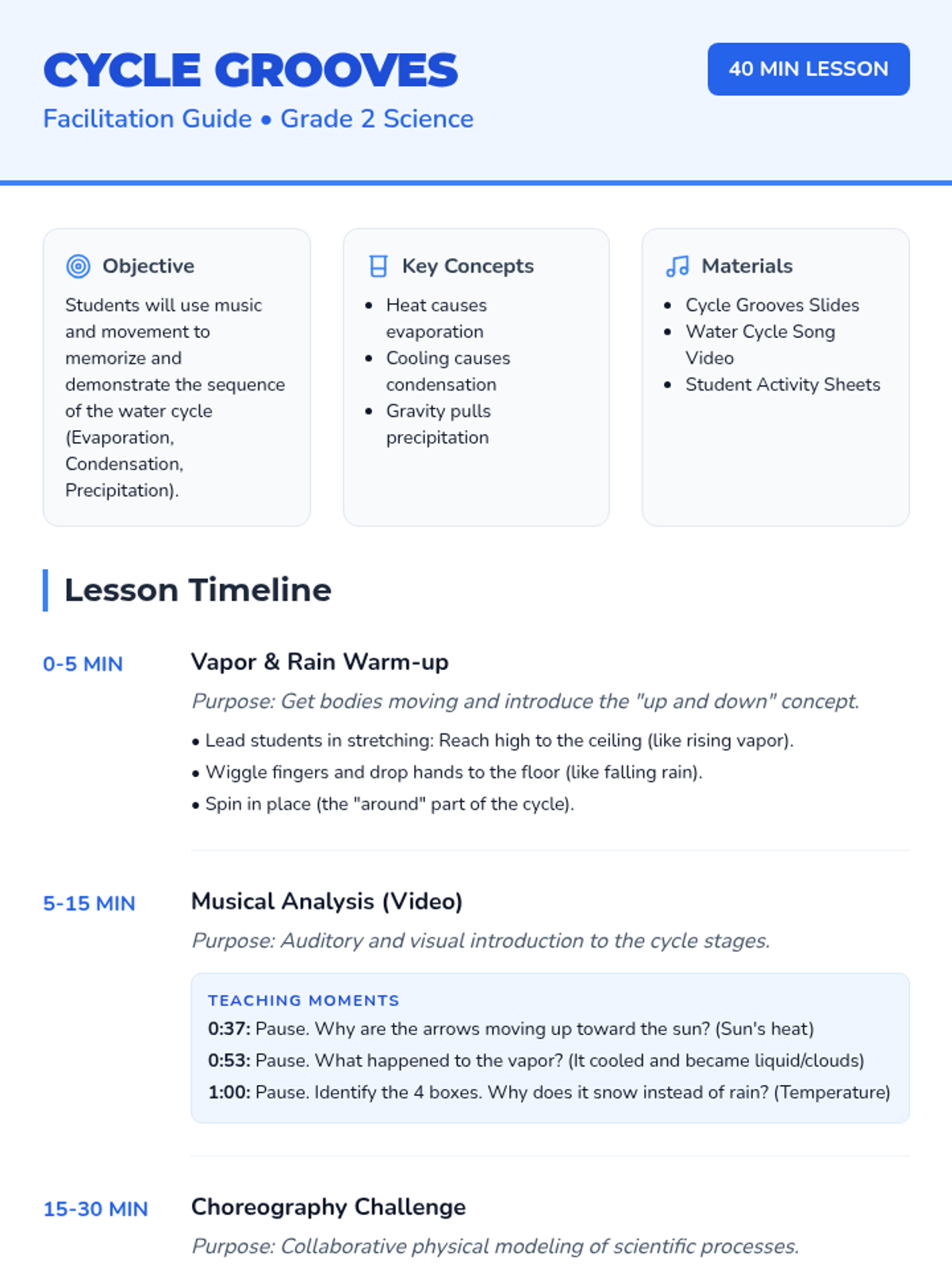 An energetic, music-based lesson where 2nd-grade students learn the water cycle stages through a 'Choreography Challenge' and the 'Water Cycle Song'. Students will translate scientific concepts like evaporation and condensation into physical movements.