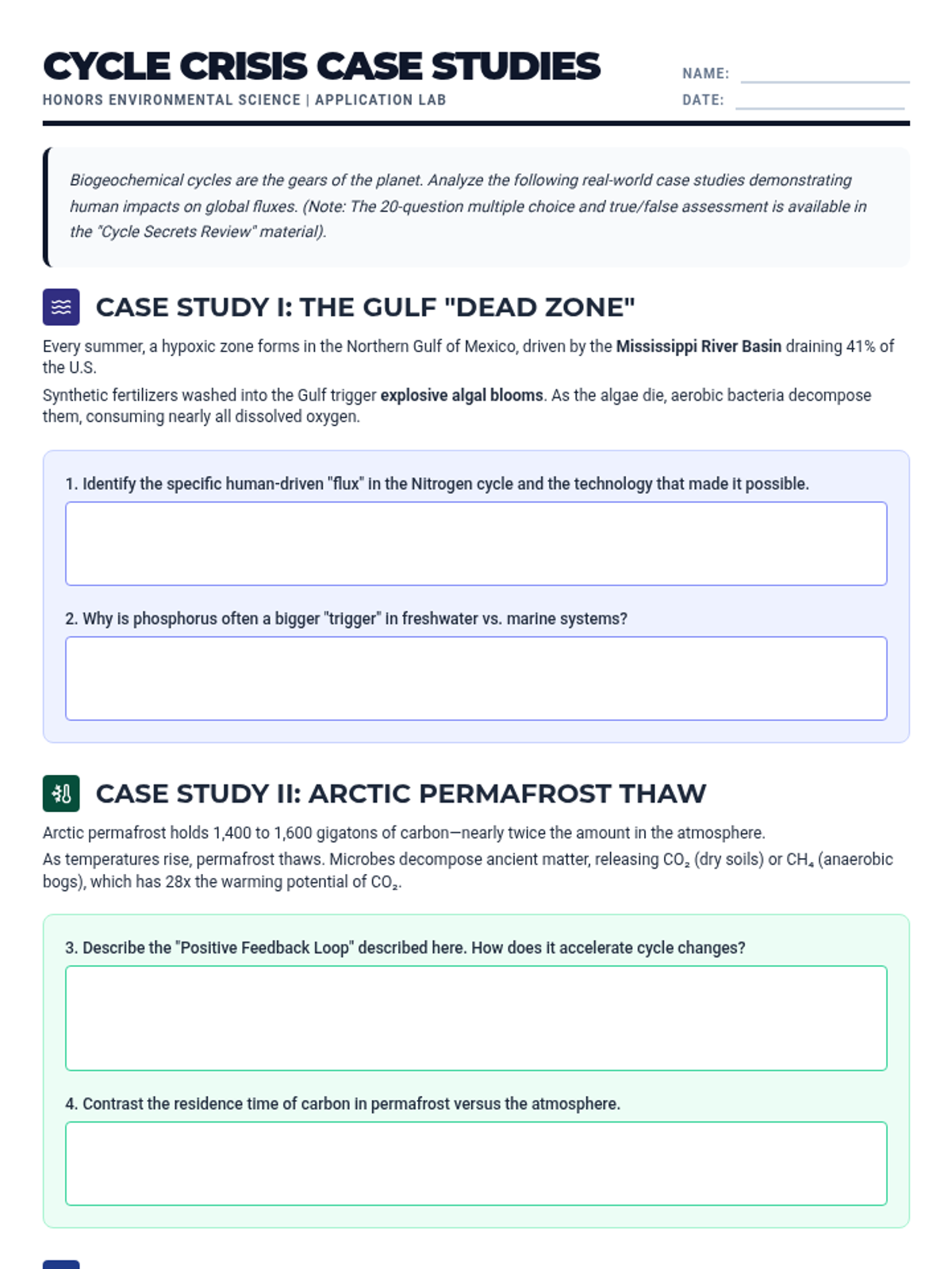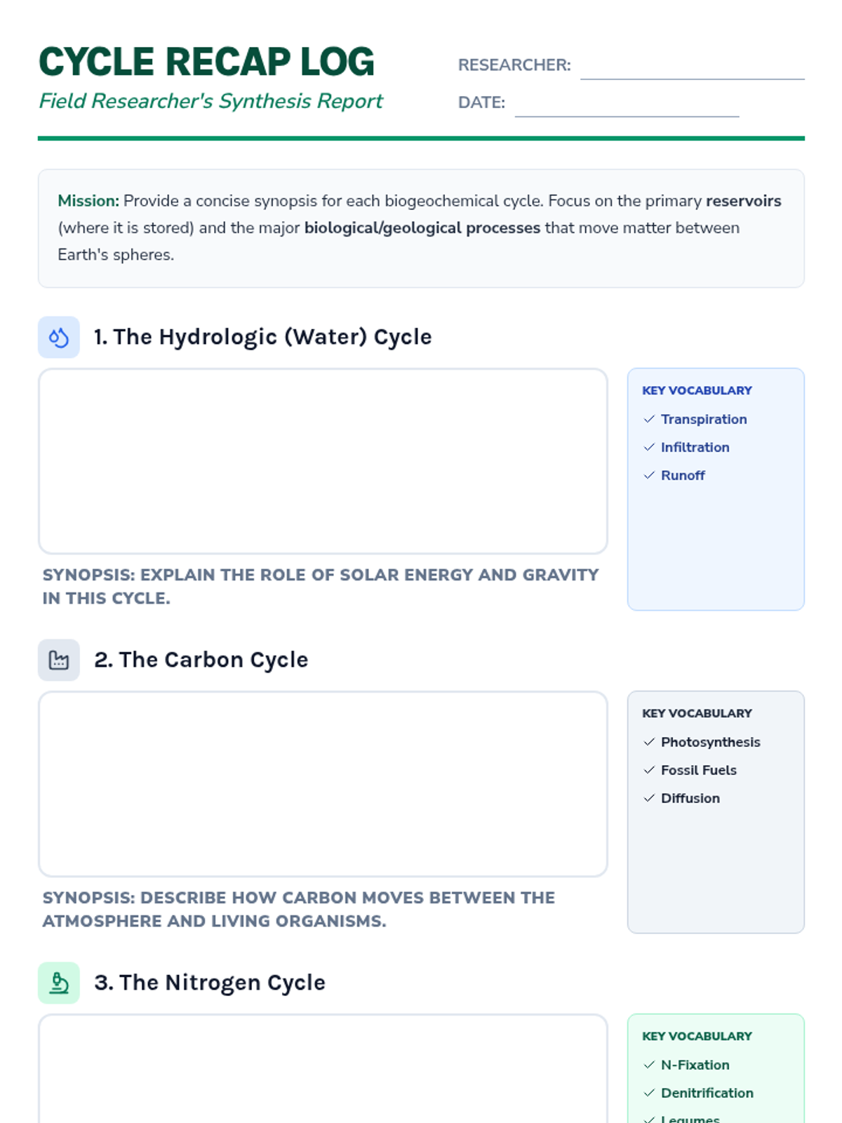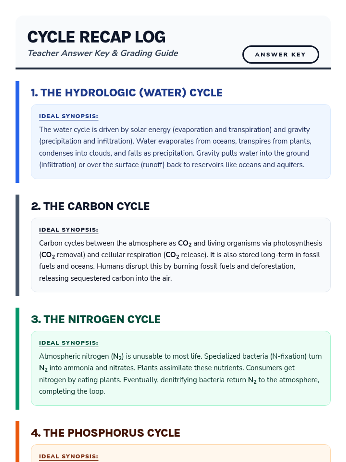 A comprehensive lesson on the four major biogeochemical cycles: Water, Carbon, Nitrogen, and Phosphorus. Students explore how matter moves through Earth's systems using a field-journal-inspired reading passage and differentiated diagram activities.