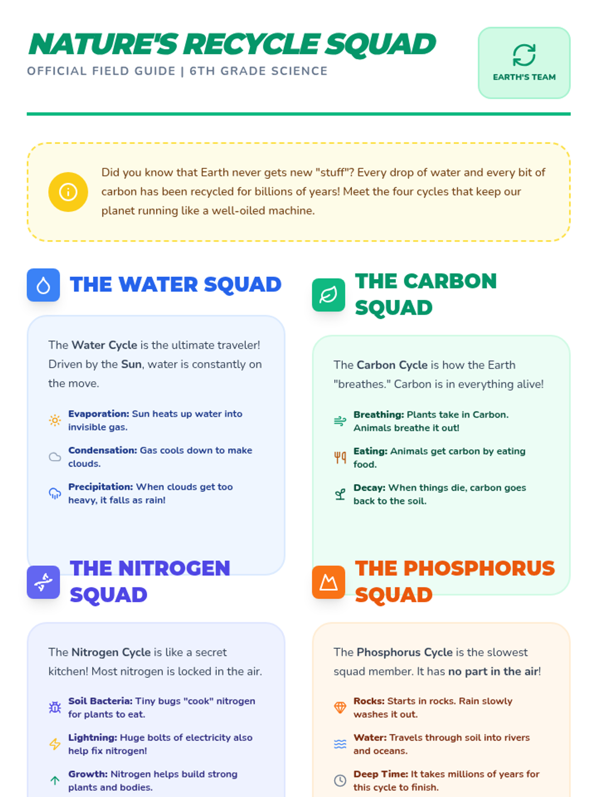 A friendly, middle-school introduction to the four major cycles of nature, focusing on how living things and the Earth work together as a 'recycle team'.