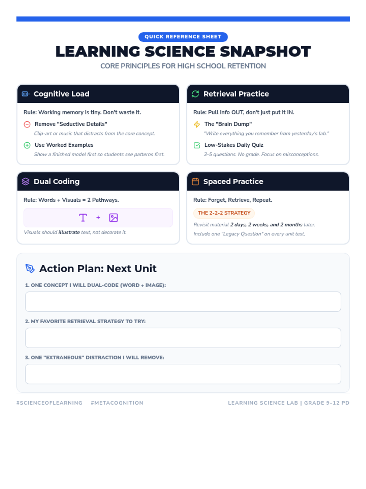 A professional development session for grades 9-12 educators exploring cognitive science principles. Teachers will learn about cognitive load theory, retrieval practice, and dual coding to enhance classroom instruction.
