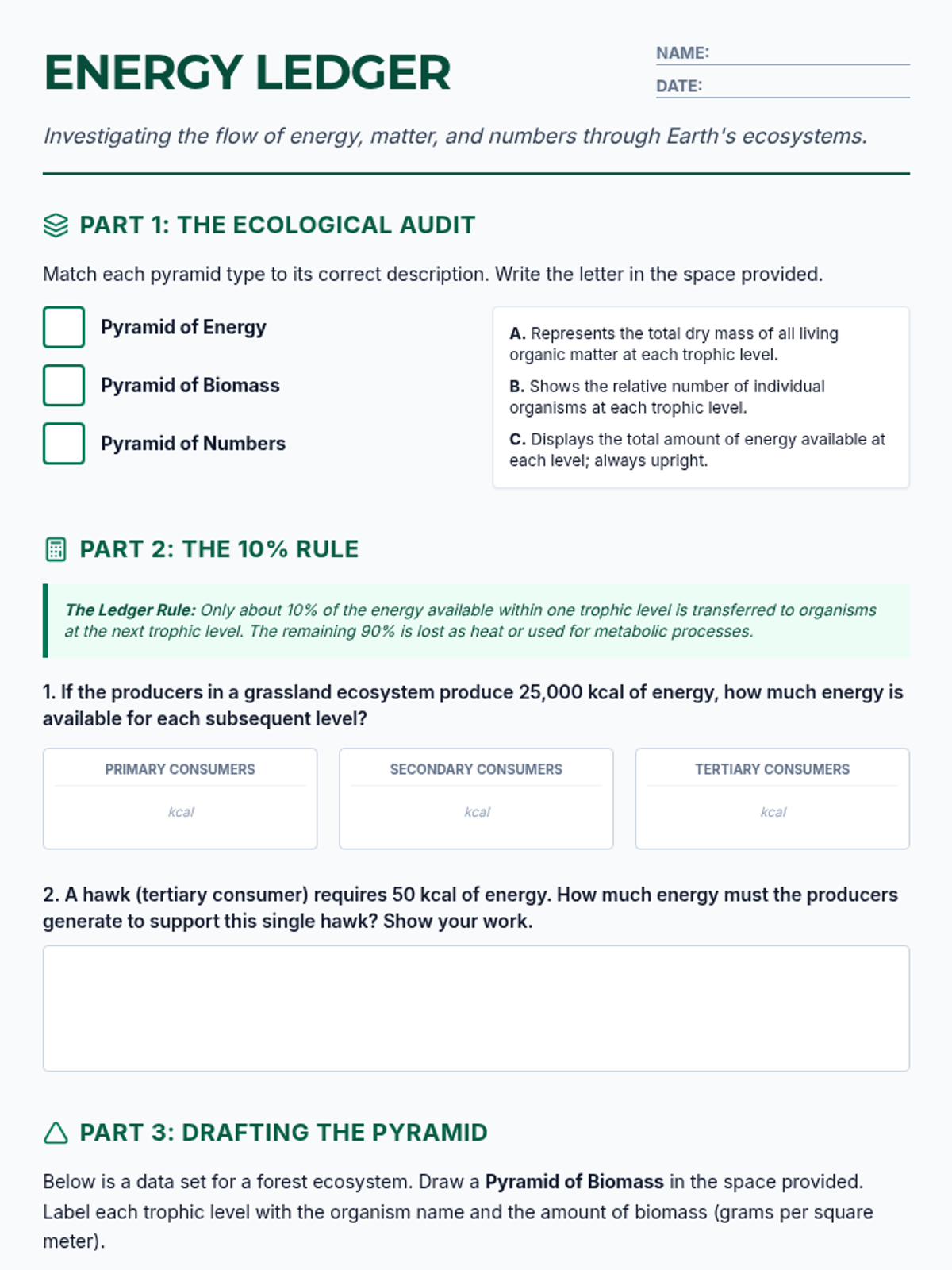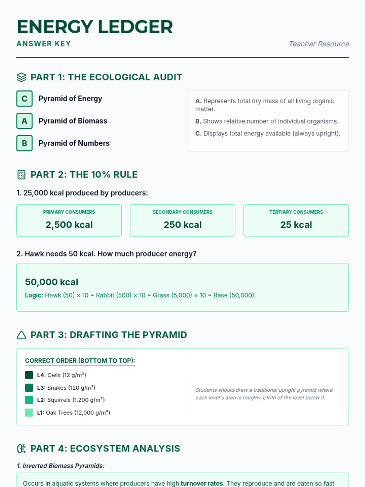 A practice-focused lesson on ecological pyramids, covering energy transfer, biomass, and population numbers using the 10% rule.