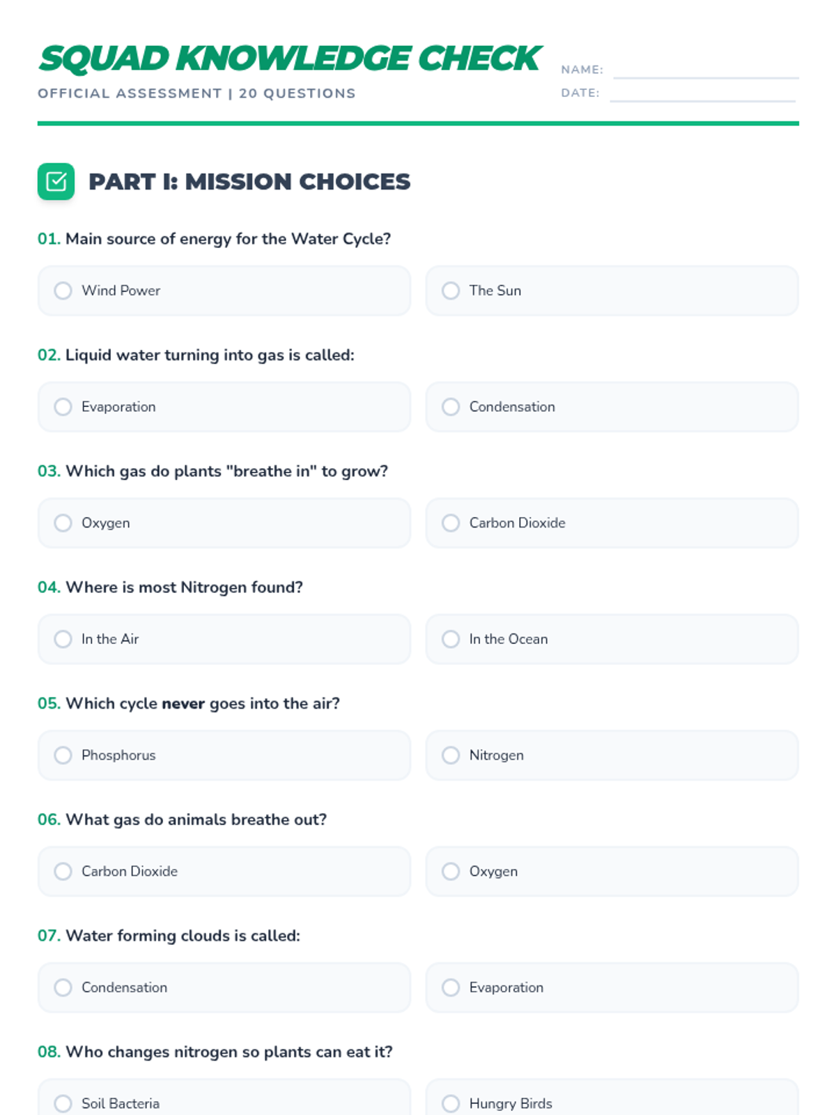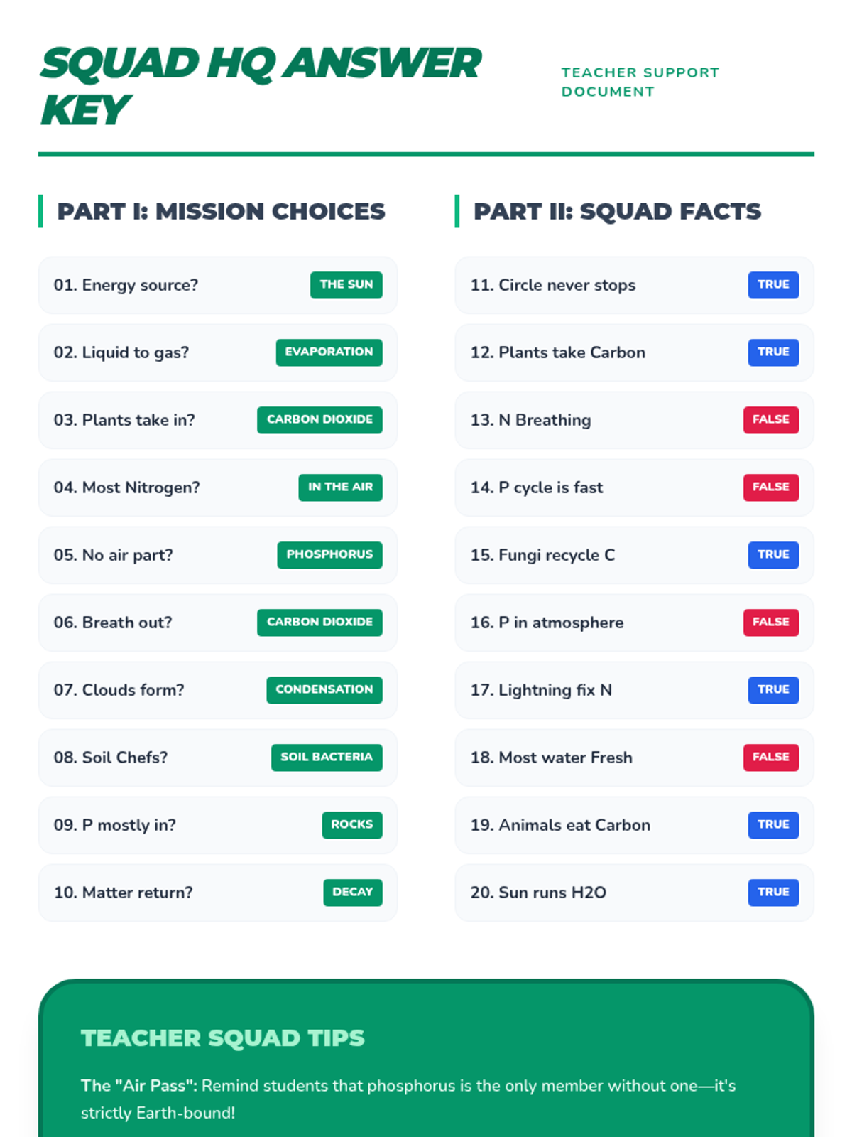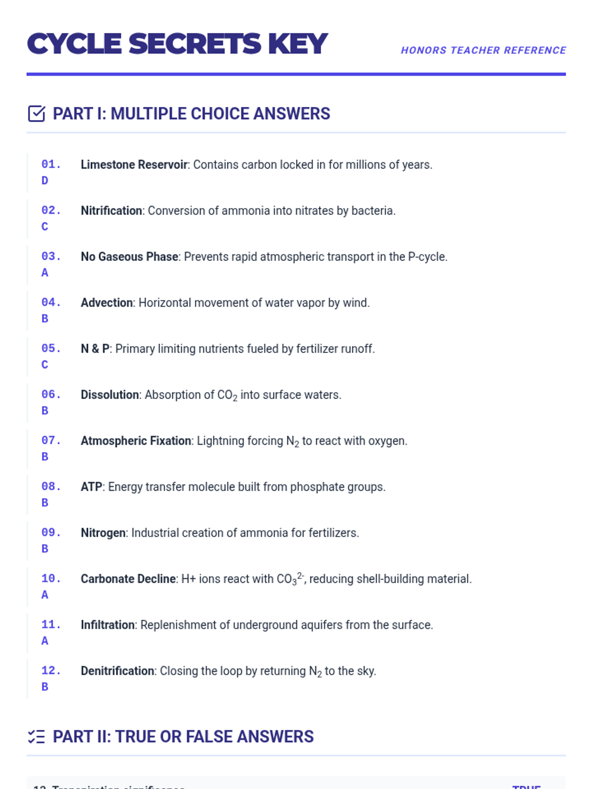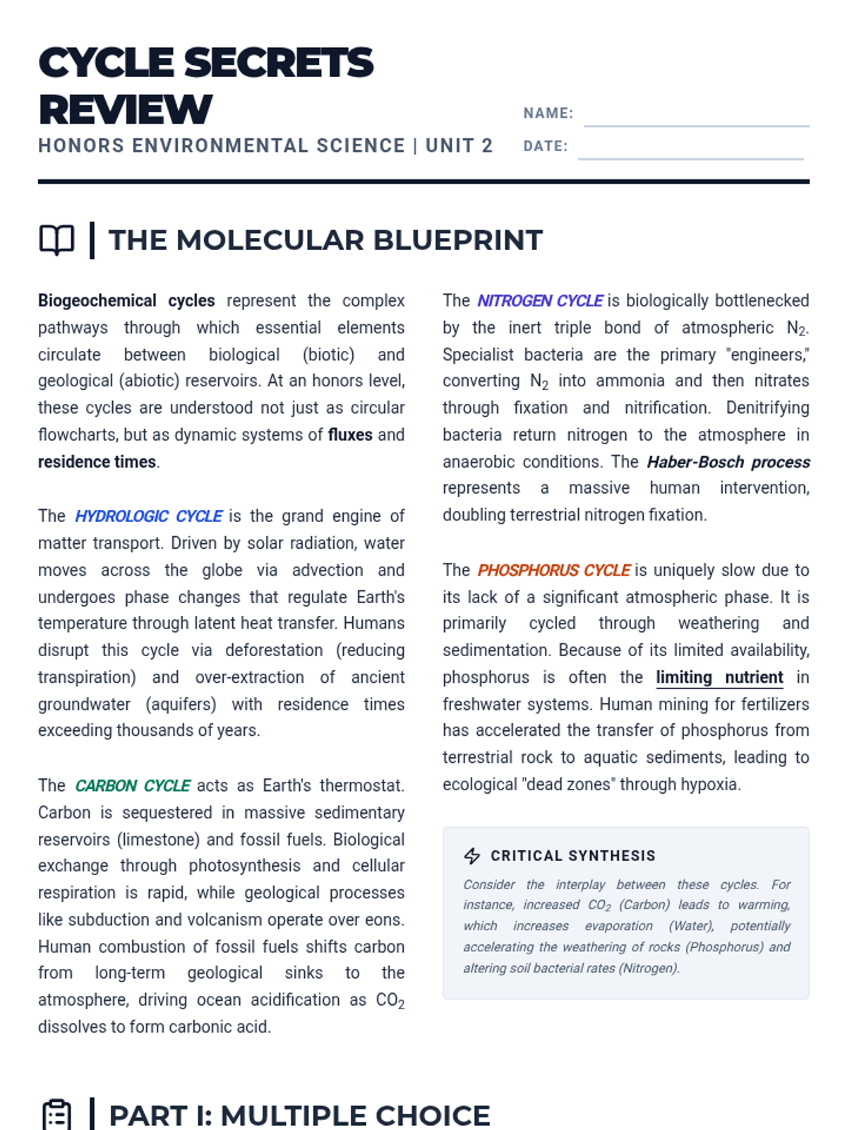A comprehensive review lesson covering the essential biogeochemical cycles and the flow of energy through ecosystems, designed to prepare students for assessments through varied question types and difficulty levels.