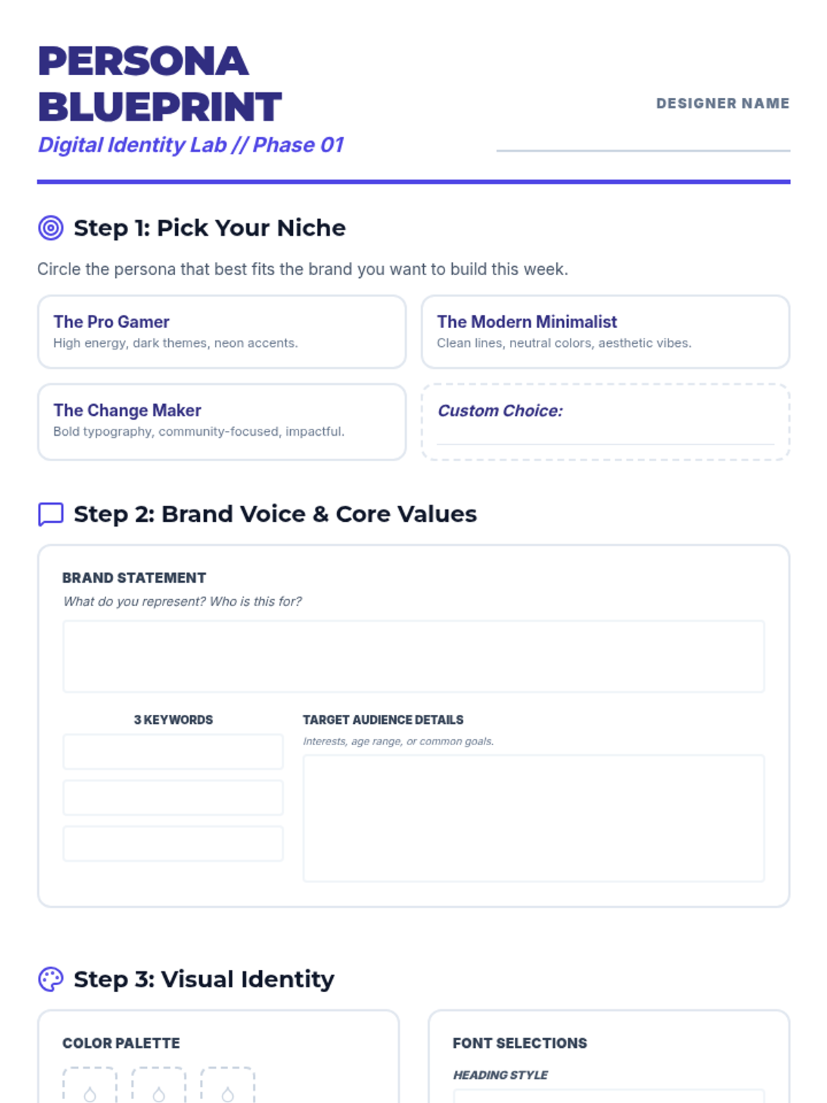 Students define their personal brand identity and create a visual 'Brand Board' using Canva, focusing on color theory, typography, and logo design.