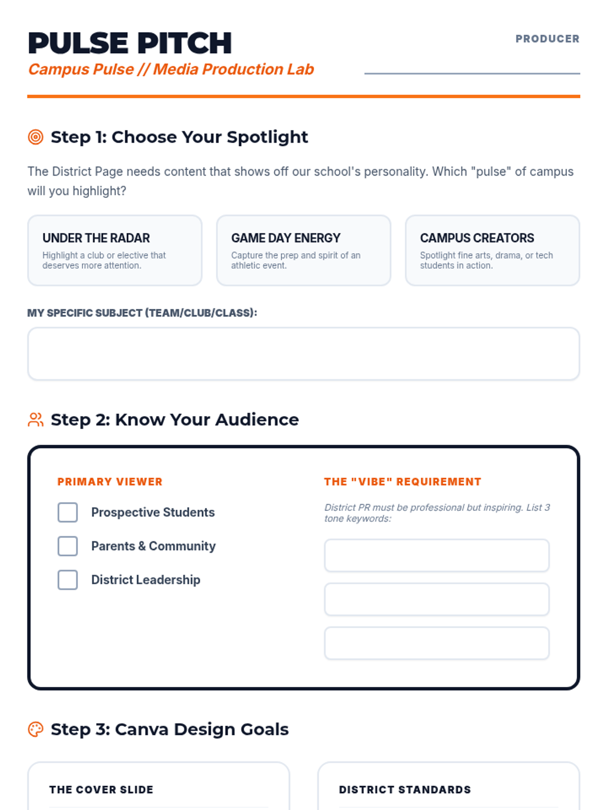 Students define their spotlight subject, research the target audience, and create professional brand assets in Canva, including a video thumbnail and intro graphic.
