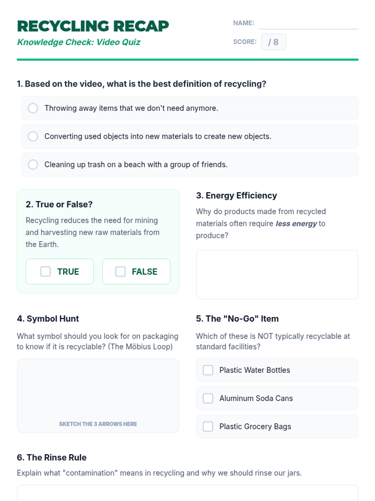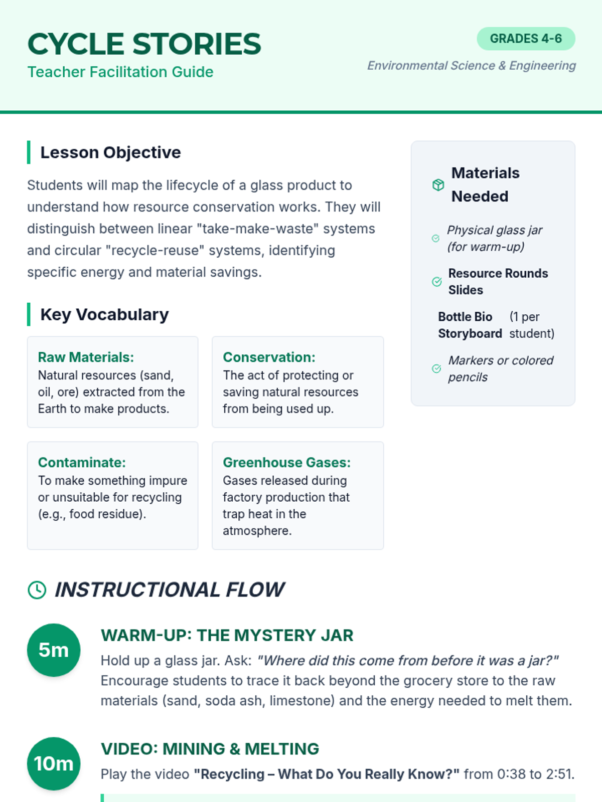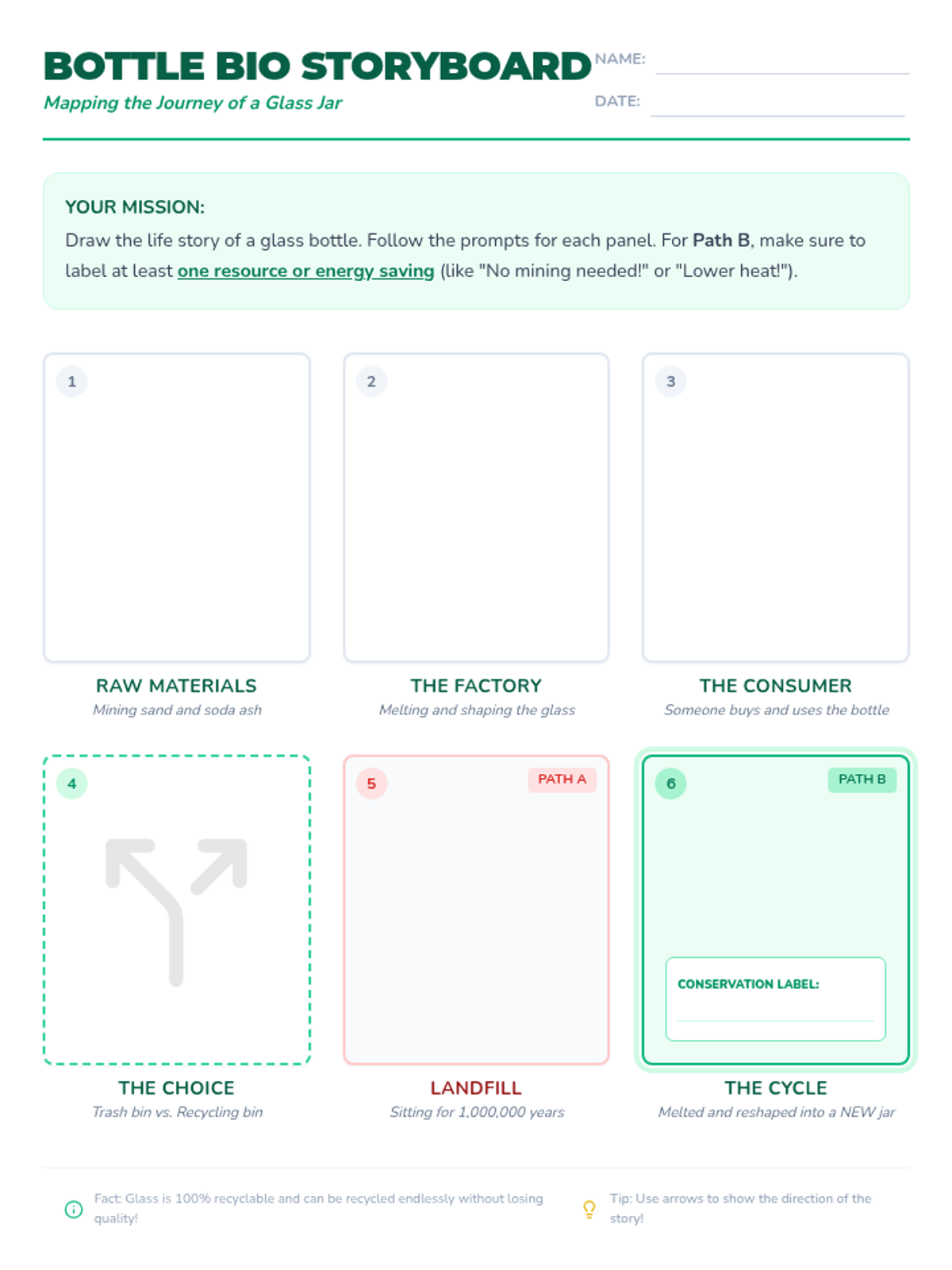 Students investigate the lifecycle of glass products, comparing the linear 'take-make-waste' path to the circular 'recycle-reuse' path. Through video analysis and storyboard creation, they identify how recycling conserves energy and raw materials.