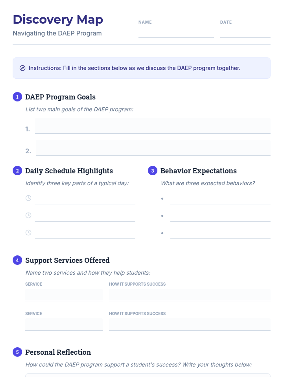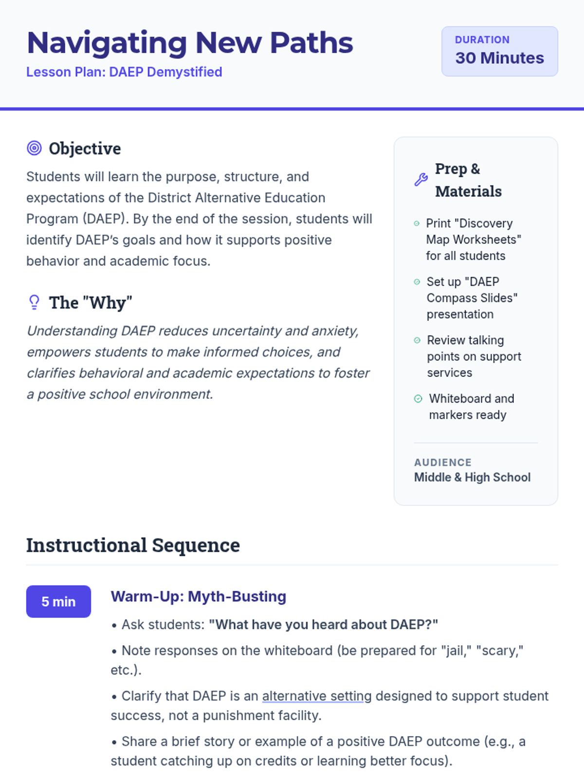 A 30-minute orientation session for students to understand the District Alternative Education Program (DAEP), focusing on its purpose, support systems, and expectations to reduce anxiety and promote positive choices.