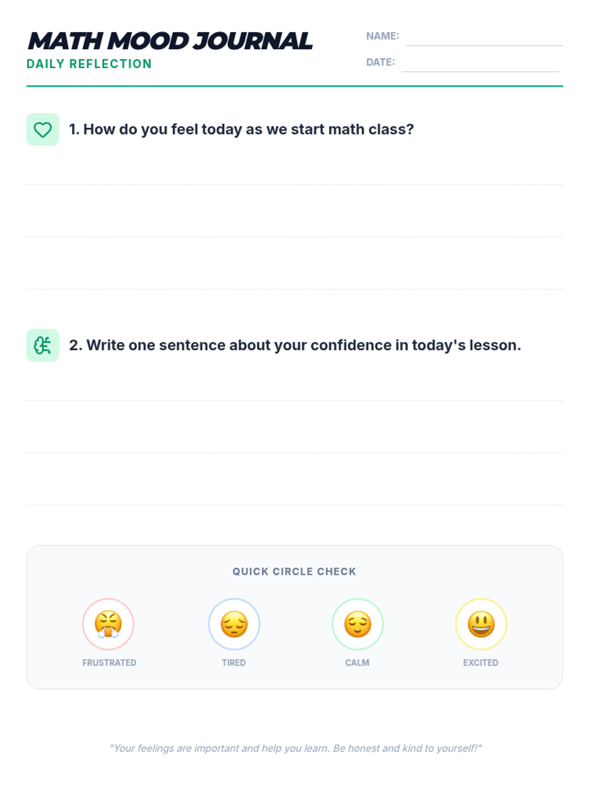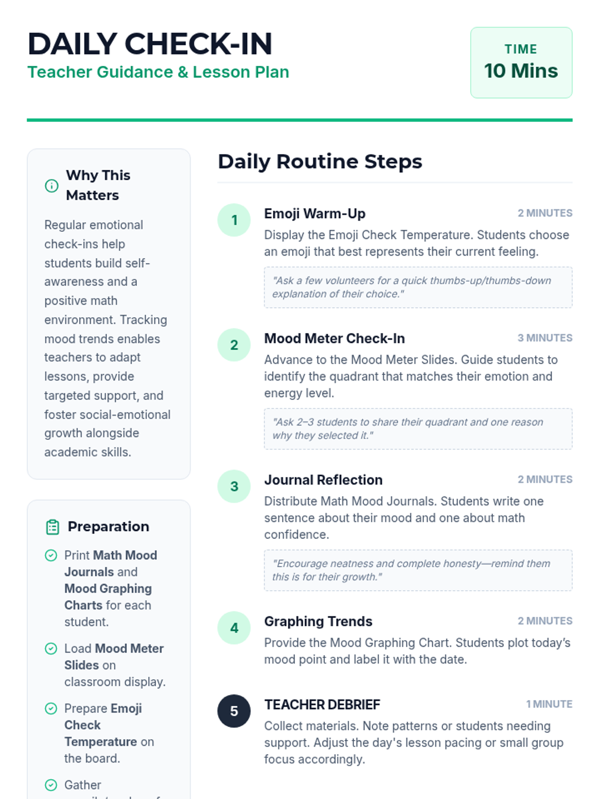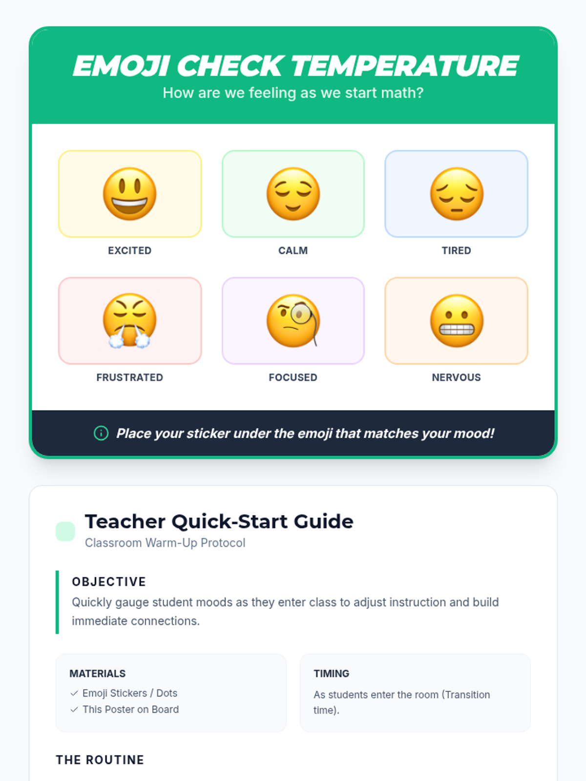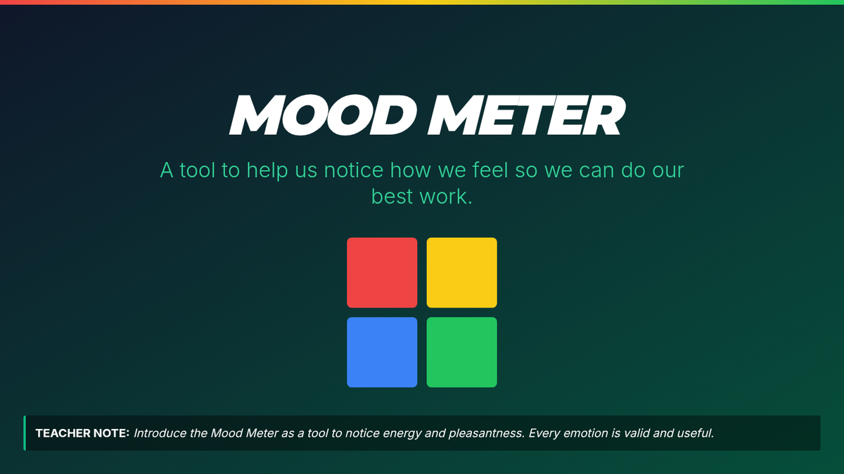 A quick daily routine for 3rd grade math class that integrates emotional self-assessment using the Mood Meter framework to track student well-being and adapt instruction.