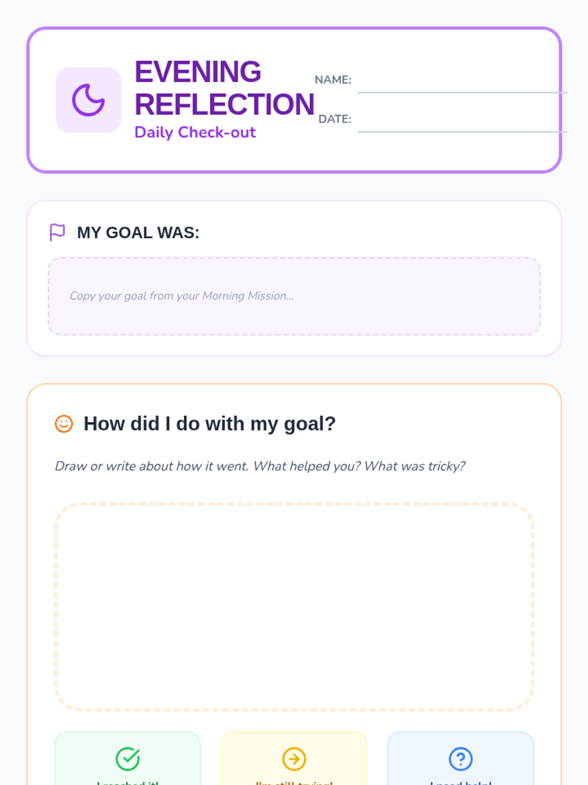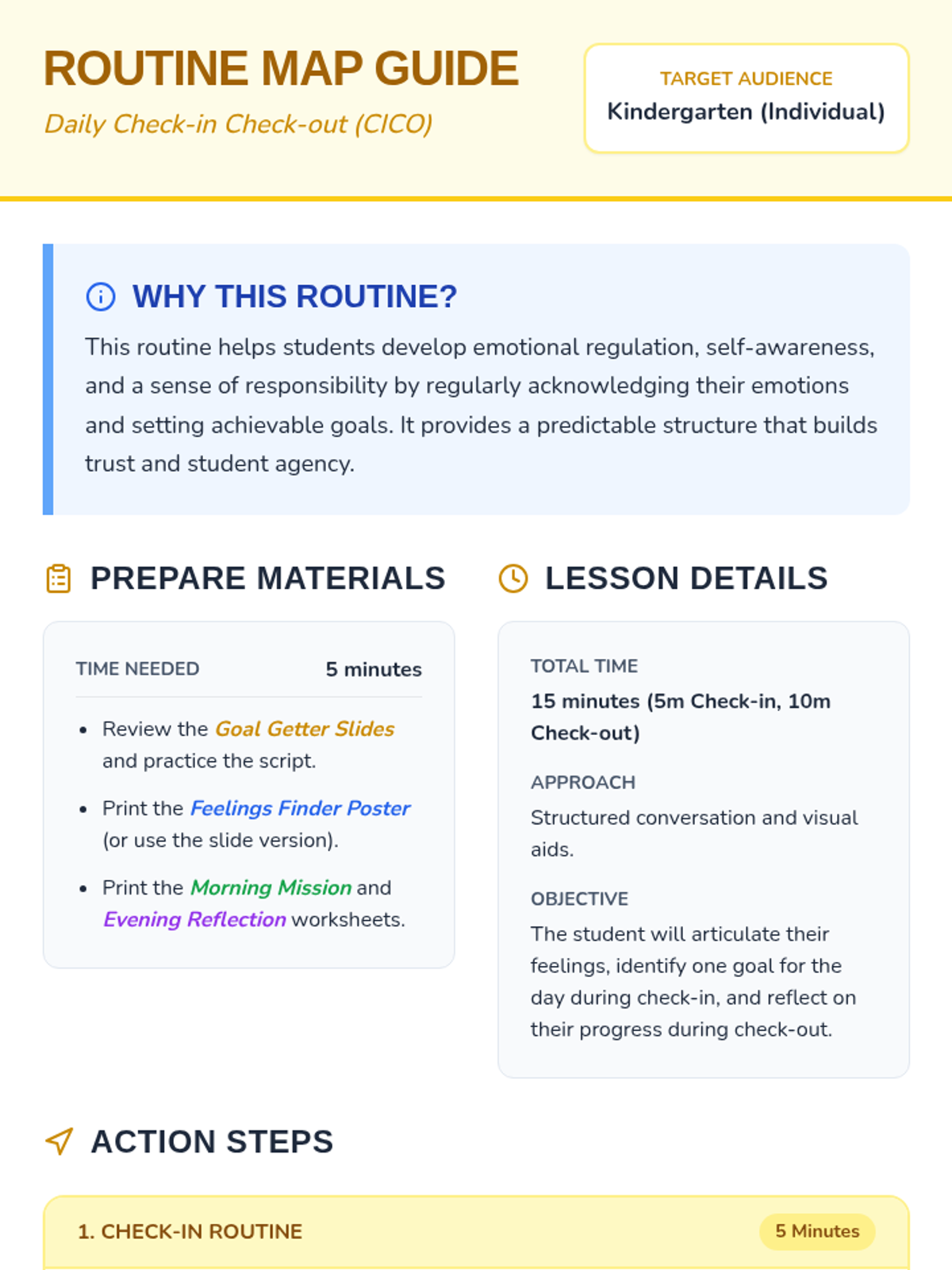 A structured Tier 3 intervention for Kindergarten students to develop emotional regulation and goal-setting skills through a 15-minute daily routine.