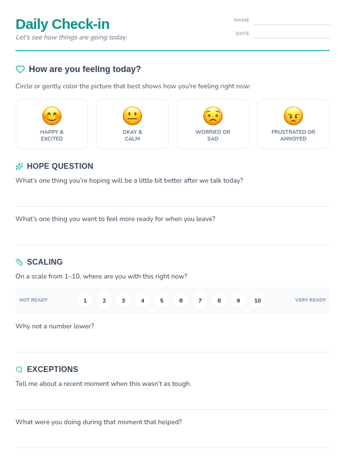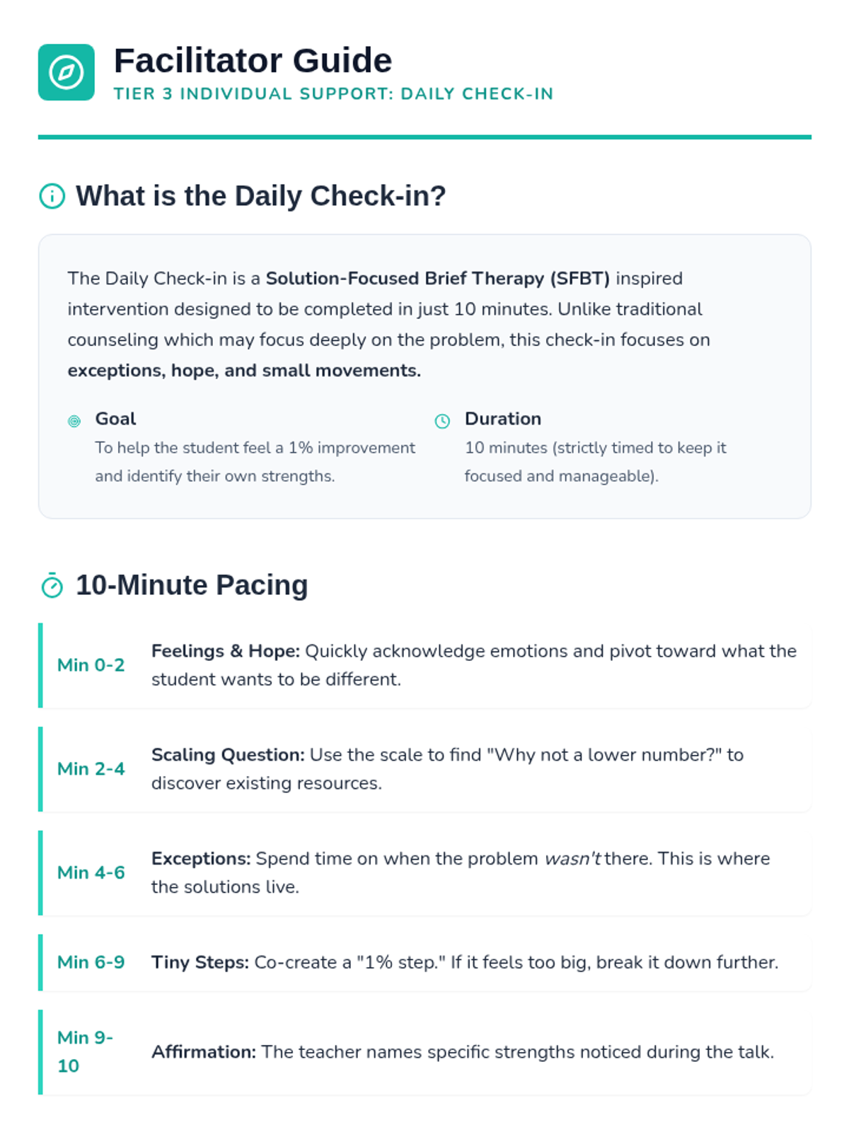A quick 10-minute check-in for 3rd-5th grade students to reflect on their feelings and outlook using solution-focused questions. This Tier 3 intervention helps educators monitor student well-being and co-create small, actionable steps for improvement.