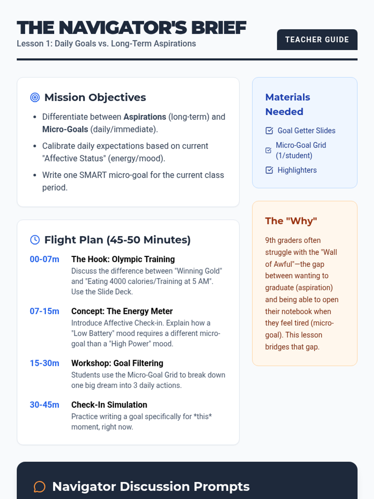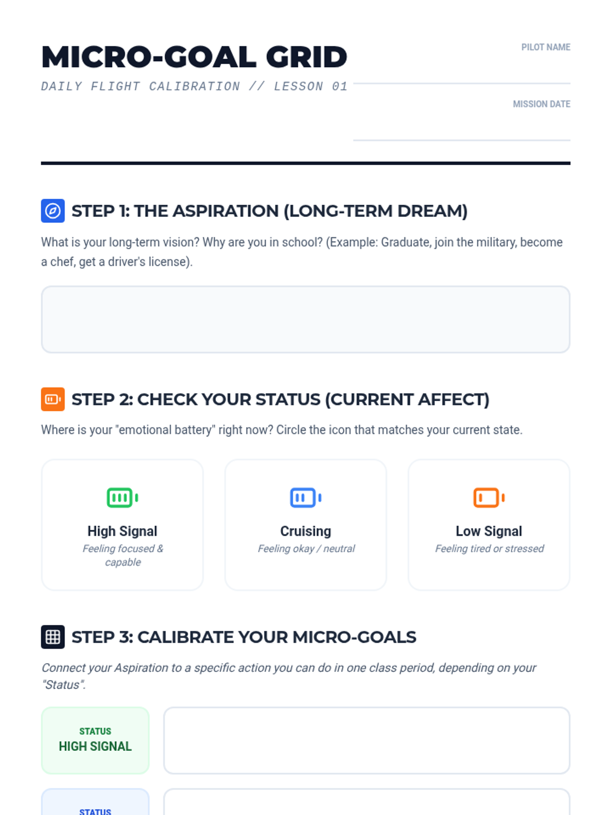 Students distinguish between long-term aspirations and micro-goals, practicing writing manageable daily goals based on their current energy and emotional state.