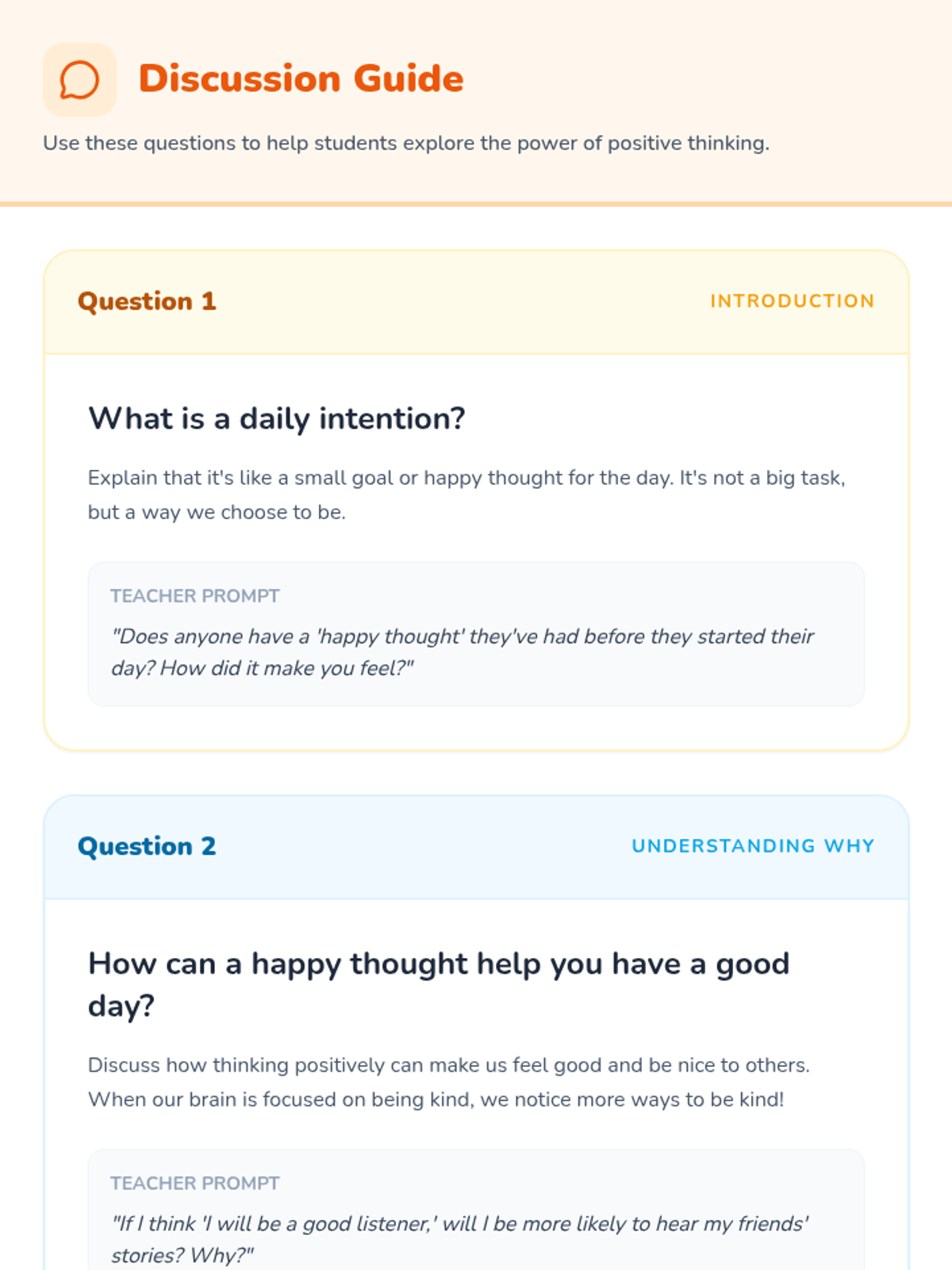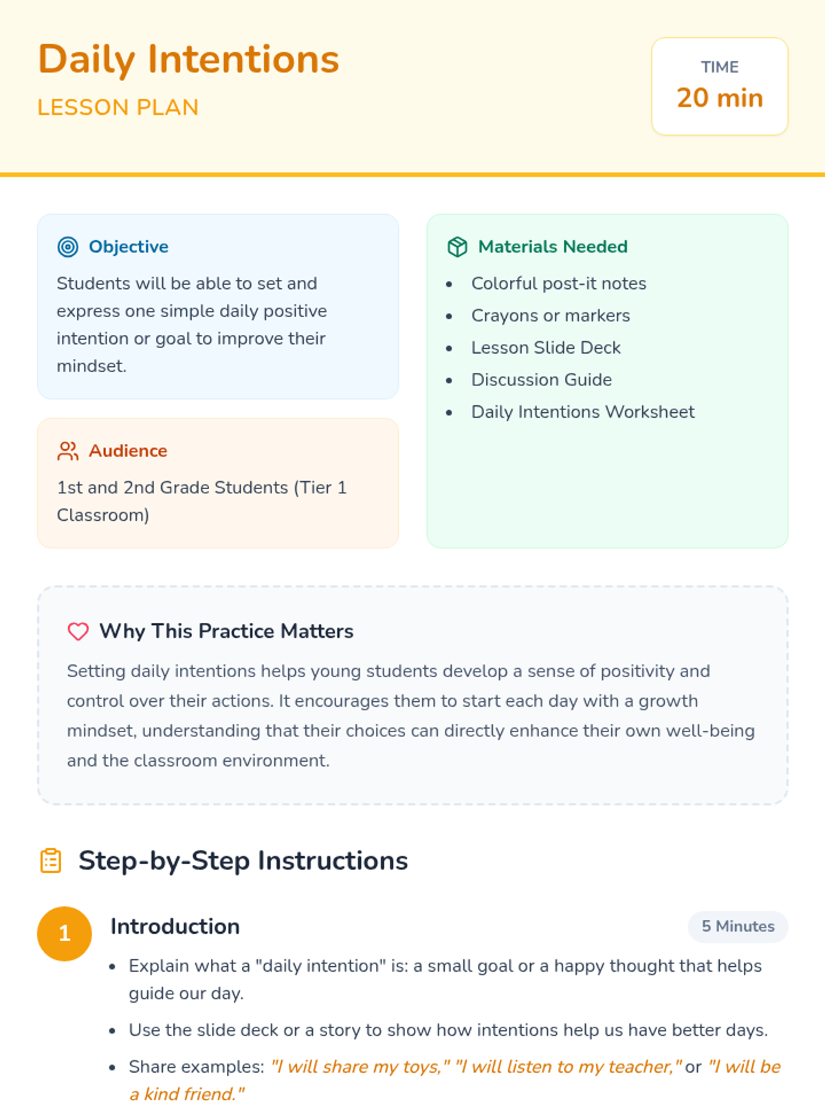 This lesson introduces 1st and 2nd grade students to the practice of setting daily positive intentions. Through storytelling, drawing, and discussion, students learn how small, positive goals can shape their day and improve their well-being.