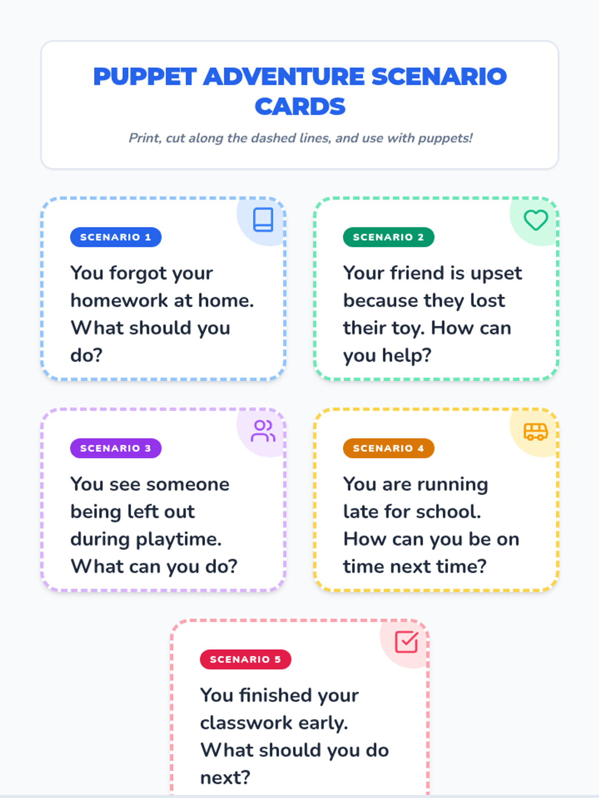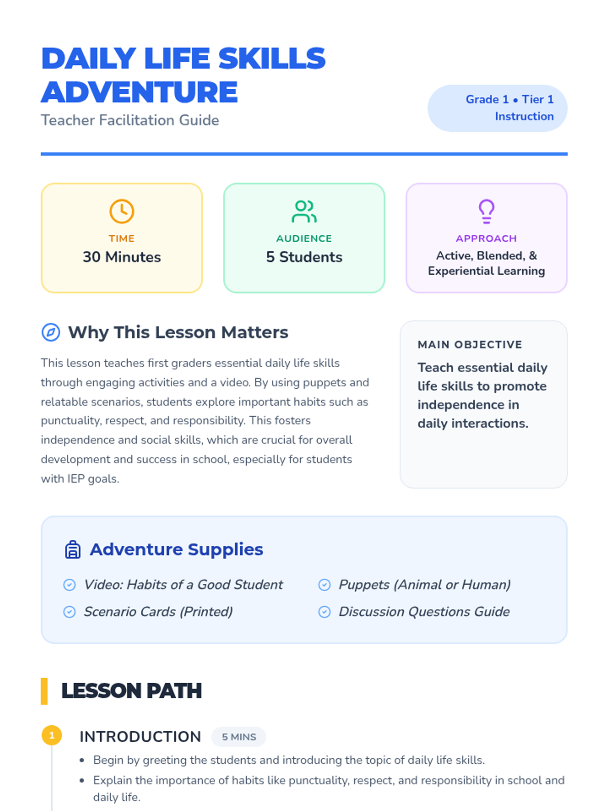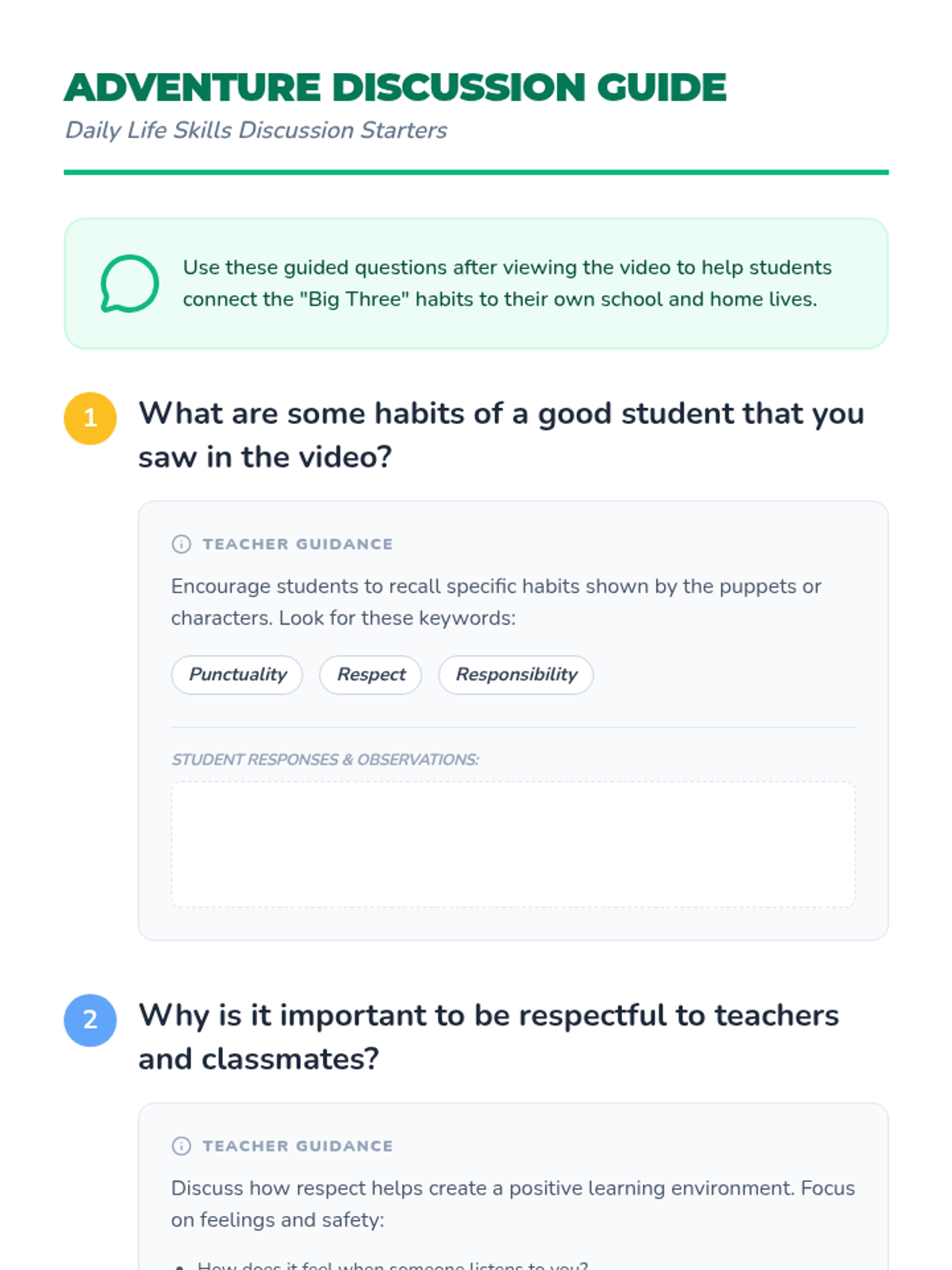 This lesson focuses on teaching first graders essential daily life skills through engaging activities and a video. Students explore habits like punctuality, respect, and responsibility using puppets and role-playing scenarios to build independence and social awareness.