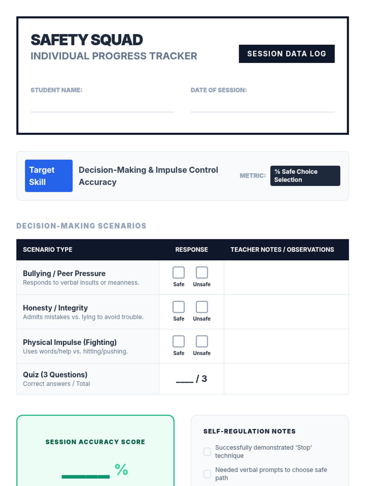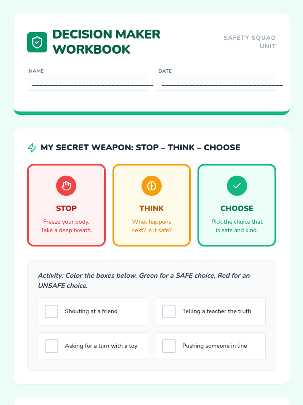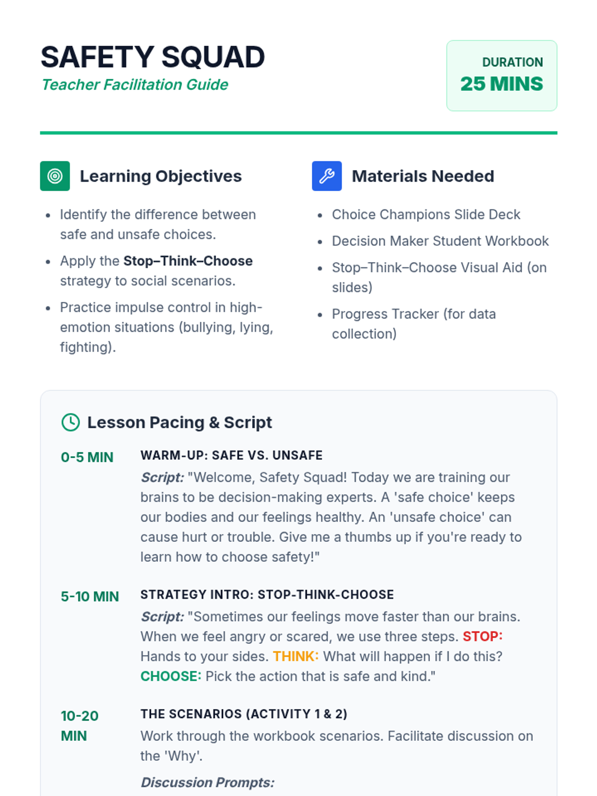 A social-emotional learning lesson focused on developing decision-making skills and impulse control through the 'Stop–Think–Choose' strategy. Students will analyze scenarios involving bullying, lying, and fighting to practice selecting safe alternatives.