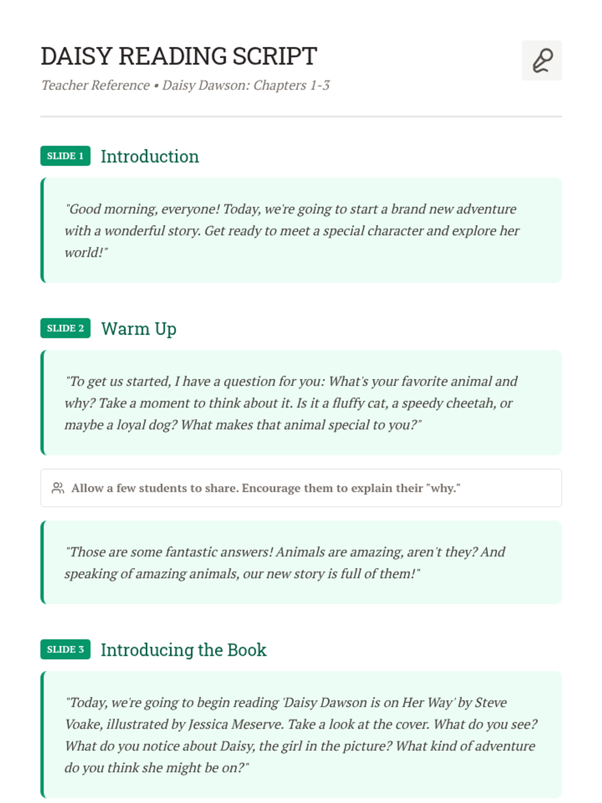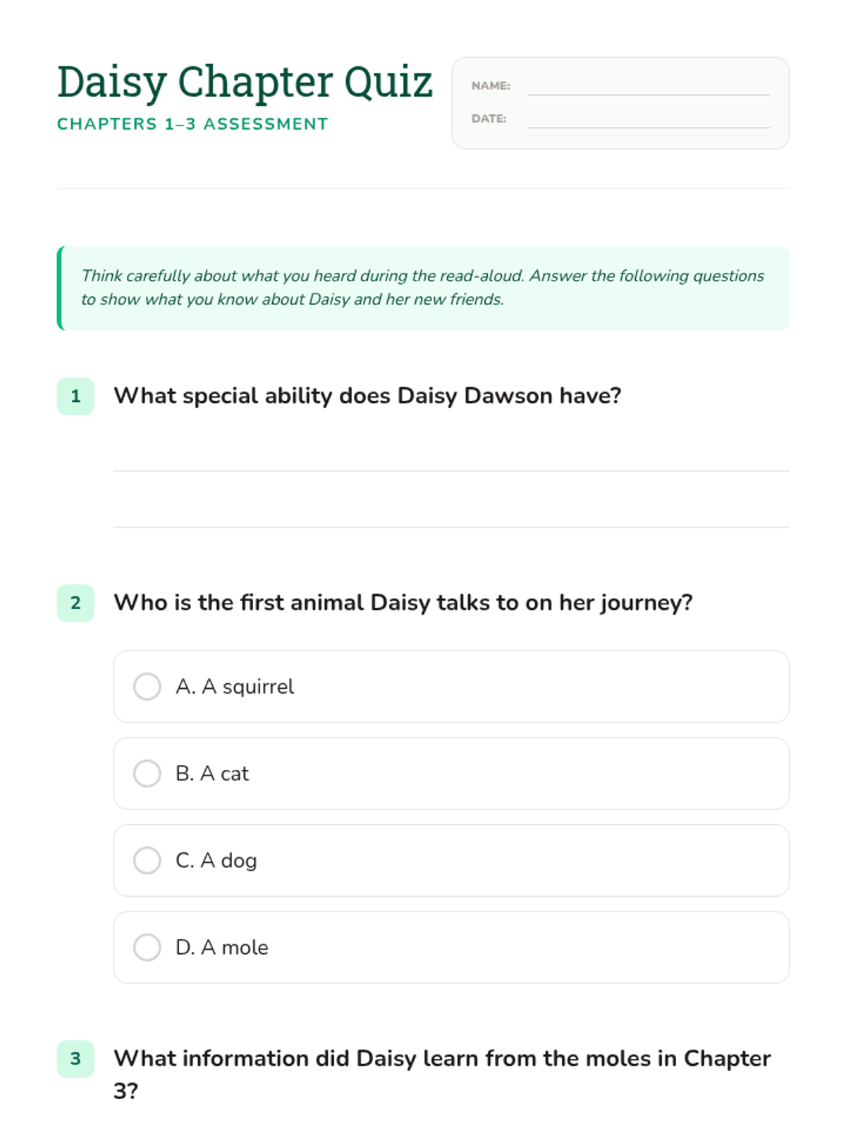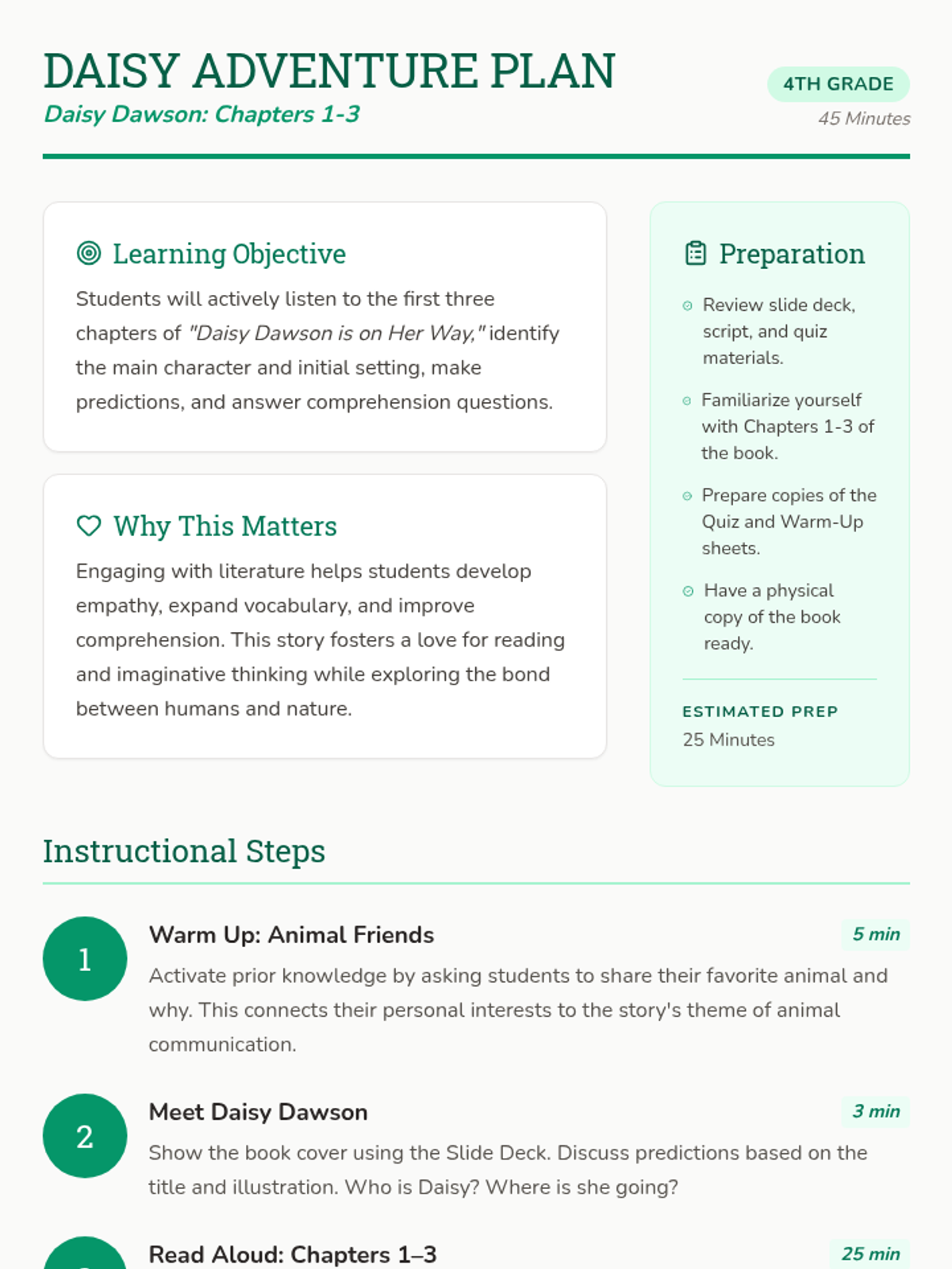 An introductory lesson to 'Daisy Dawson is on Her Way', focusing on Chapters 1-3. Students explore Daisy's unique gift of talking to animals through read-alouds, interactive discussion, and a comprehension check.