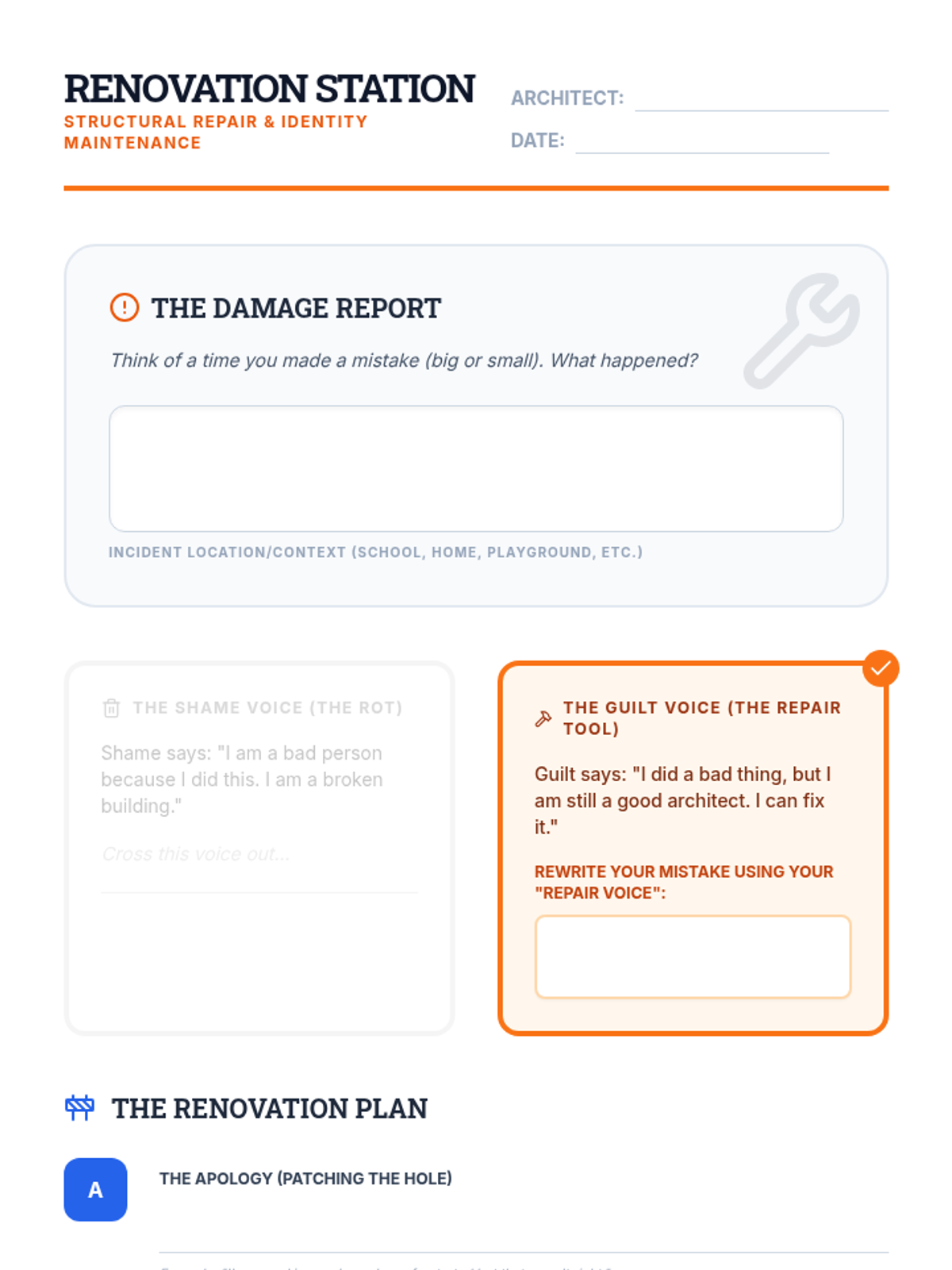 Distinguishes between guilt and shame, teaching students that mistakes are fixable 'structural damage' rather than permanent flaws in the architect.