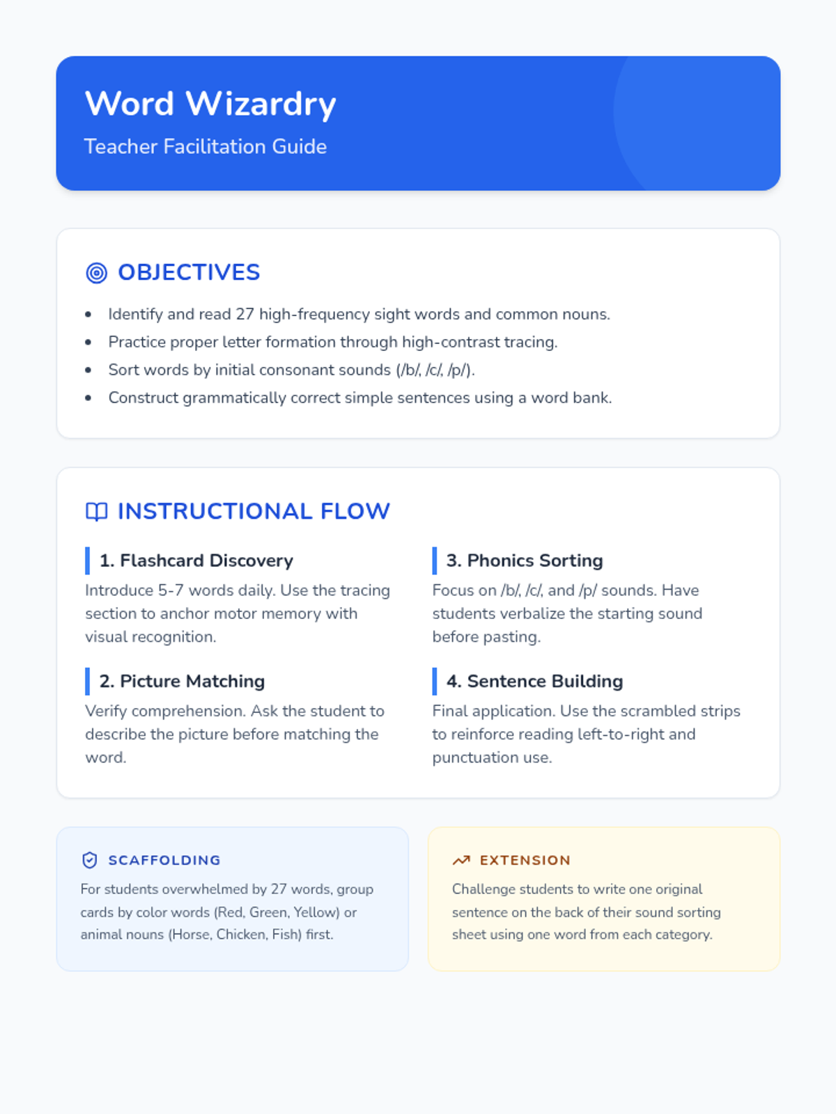 A comprehensive set of foundational literacy materials focused on 27 key sight words and nouns, covering word recognition, handwriting, sentence structure, and phonics.