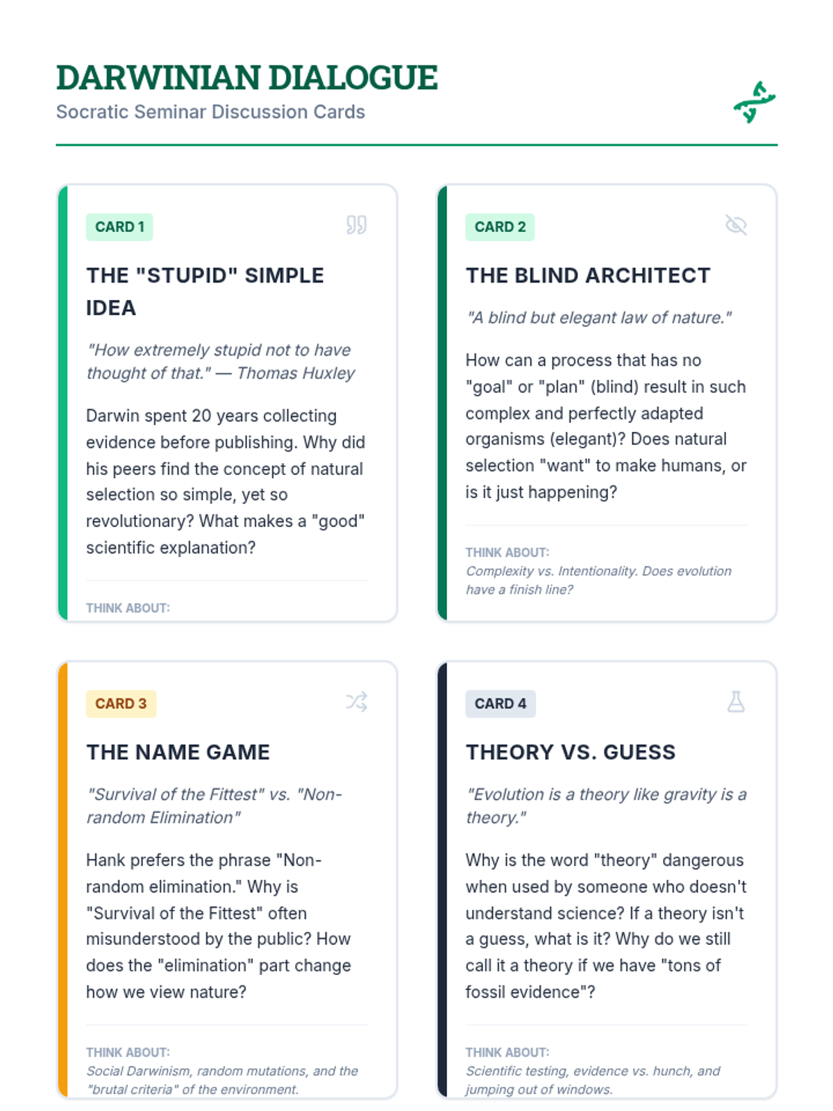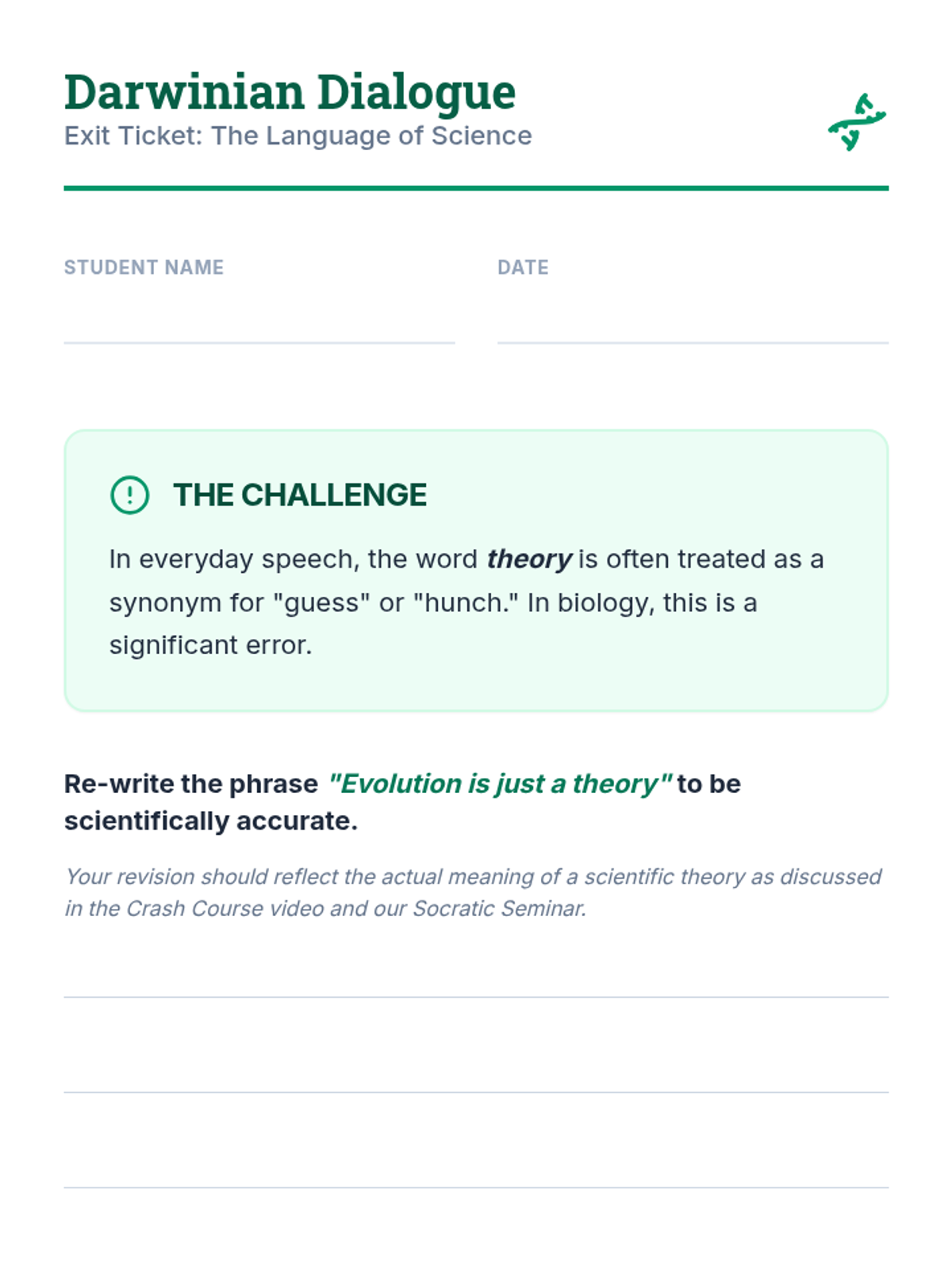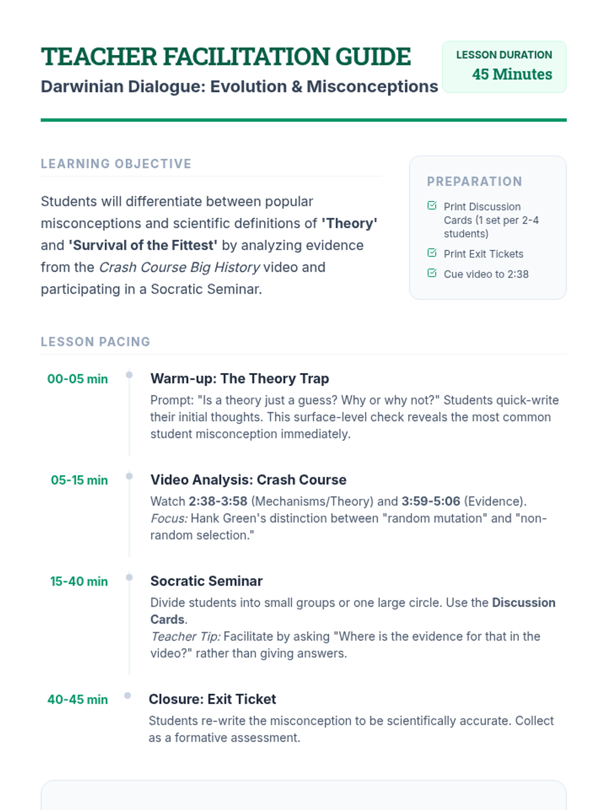 This lesson challenges common misconceptions about evolutionary biology, specifically focusing on the scientific meaning of 'theory' and the mechanics of natural selection versus 'survival of the fittest.' Students engage with a Crash Course video and a Socratic seminar to refine their scientific vocabulary.