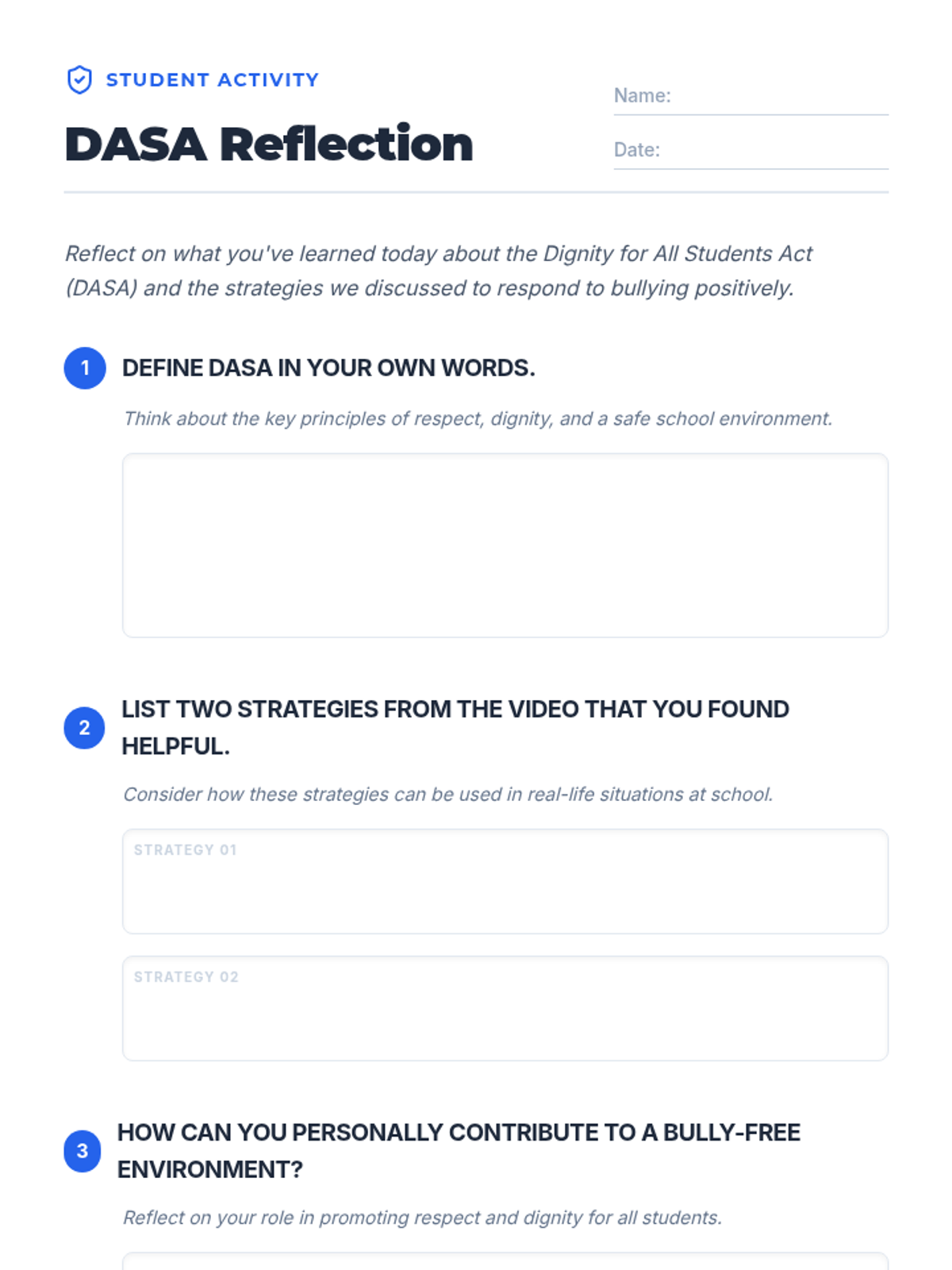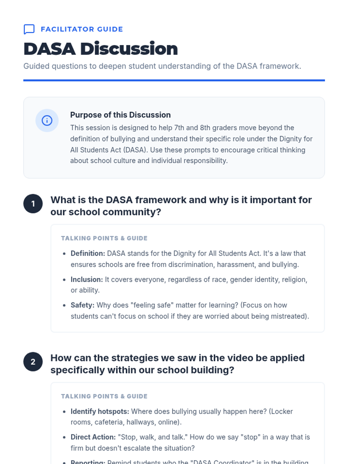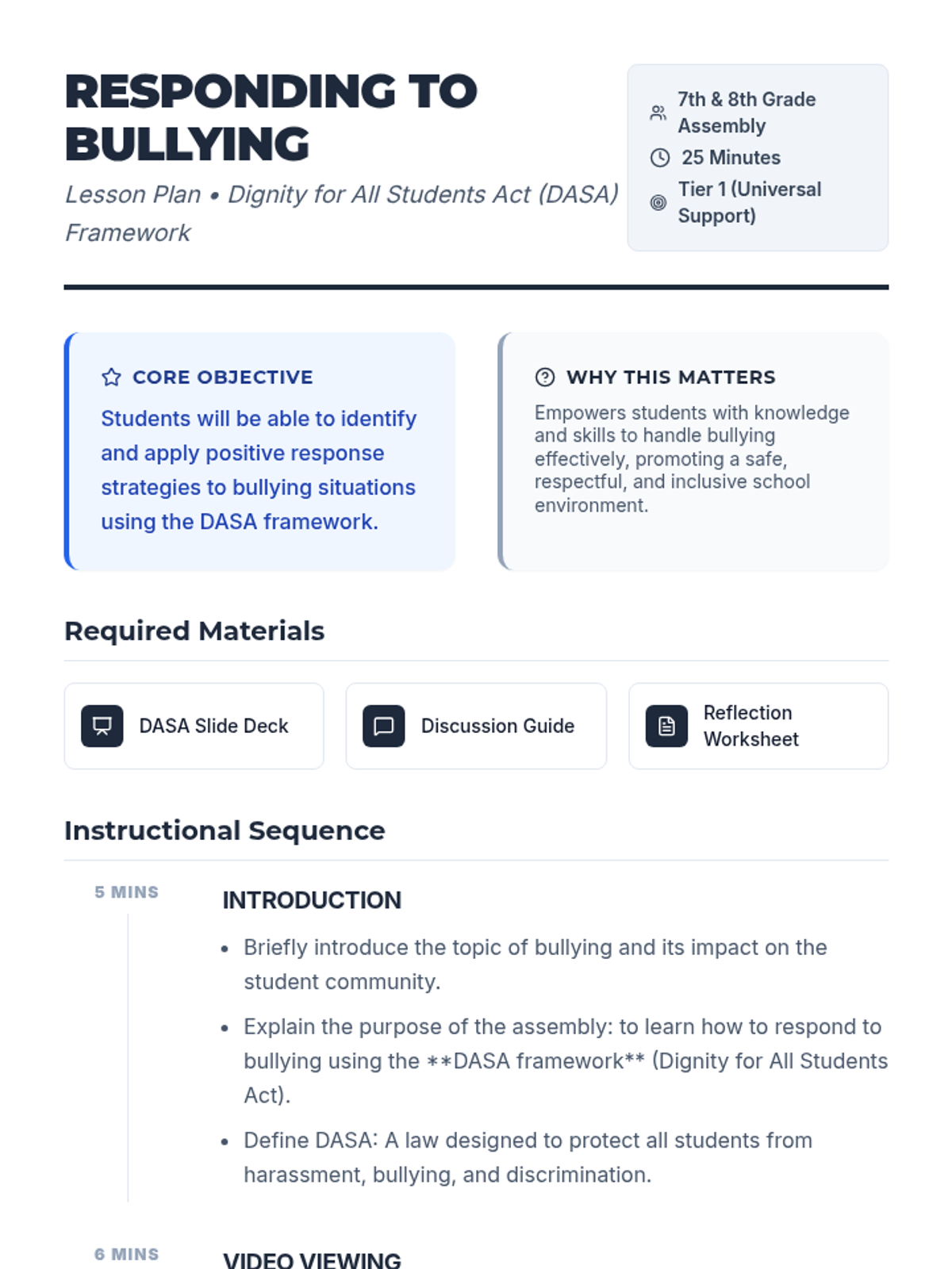 This lesson aims to educate 7th and 8th graders on how to respond to bullying positively using the DASA framework. It includes a discussion on the definition and tenets of DASA, a worksheet for reflection, and a video to illustrate positive responses to bullying.