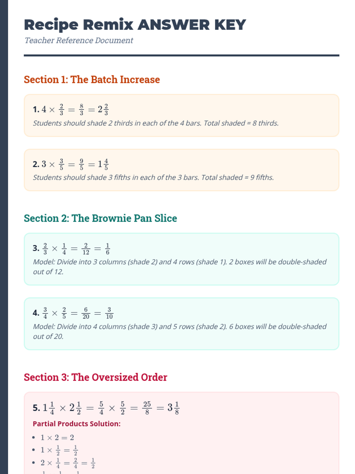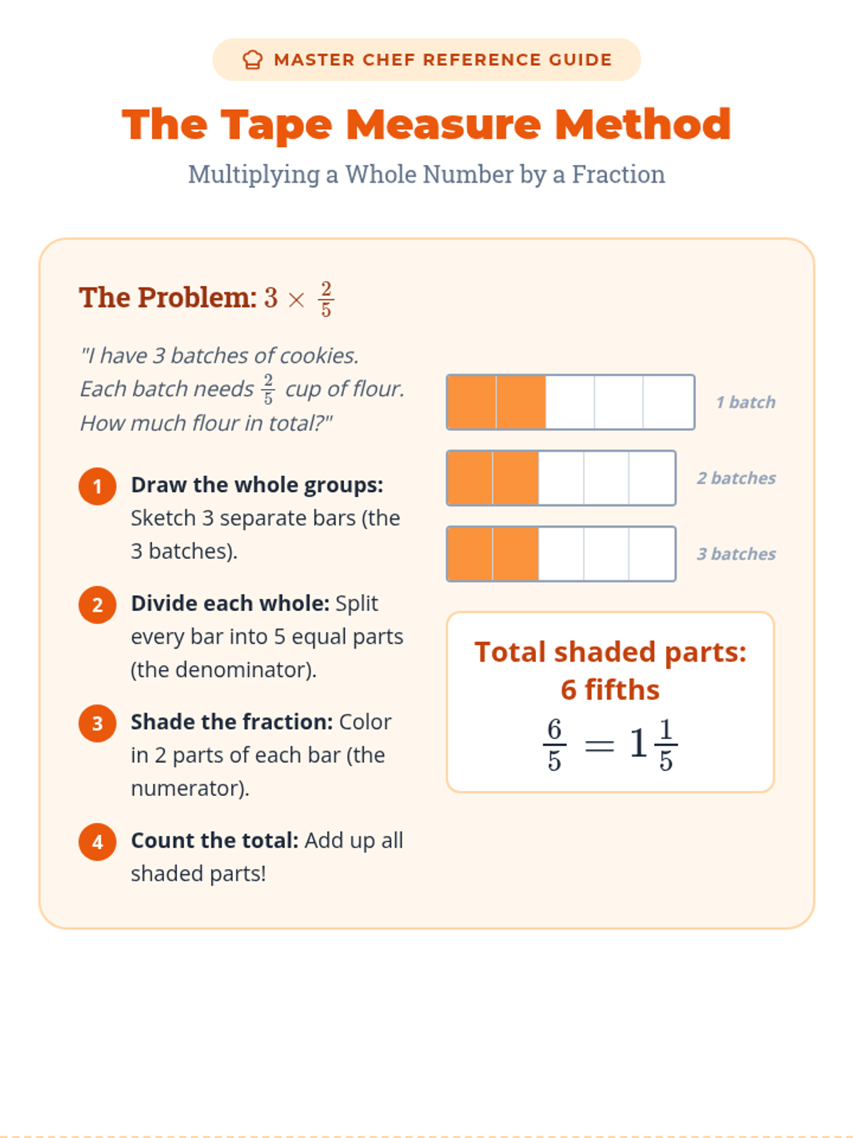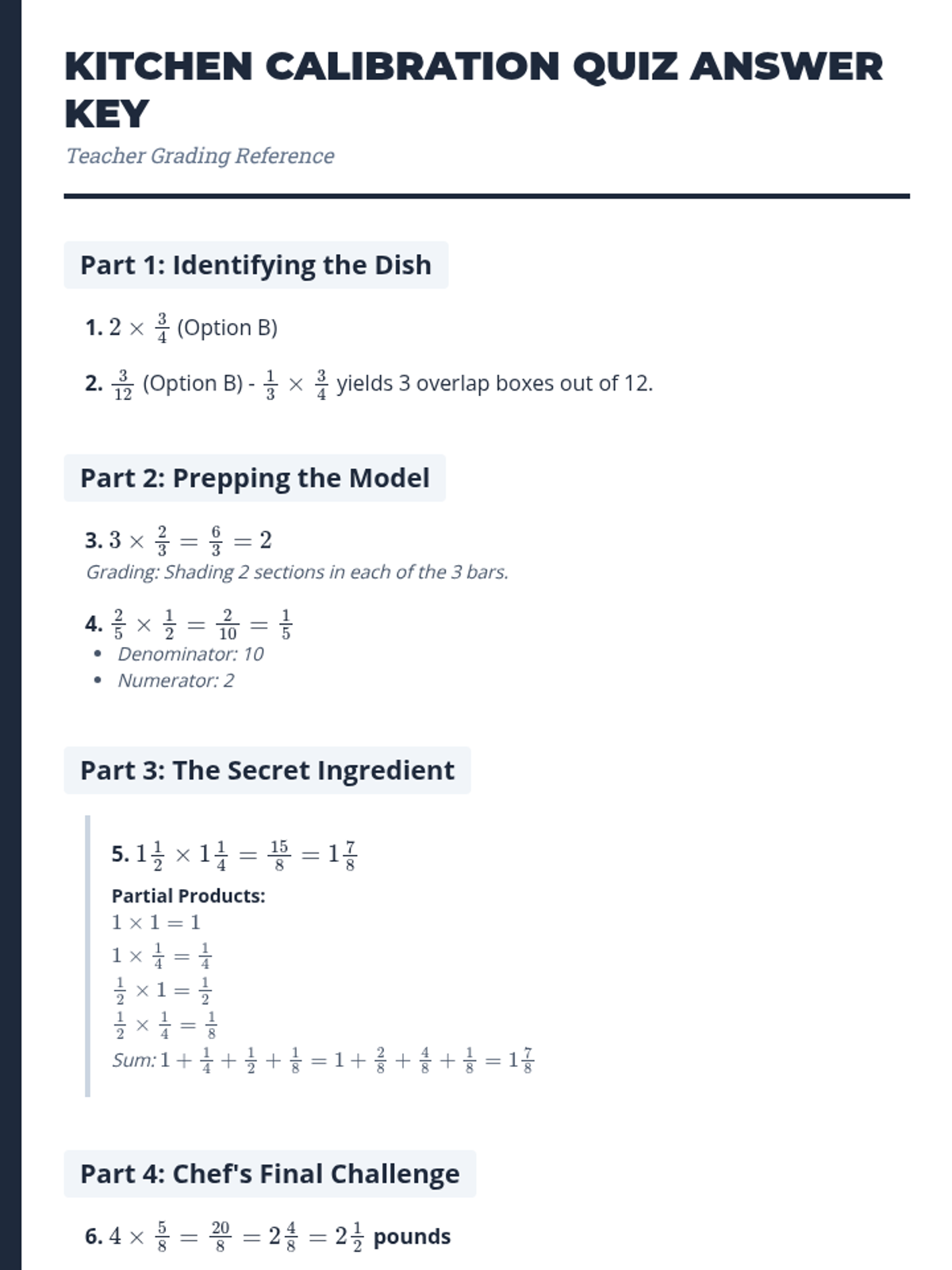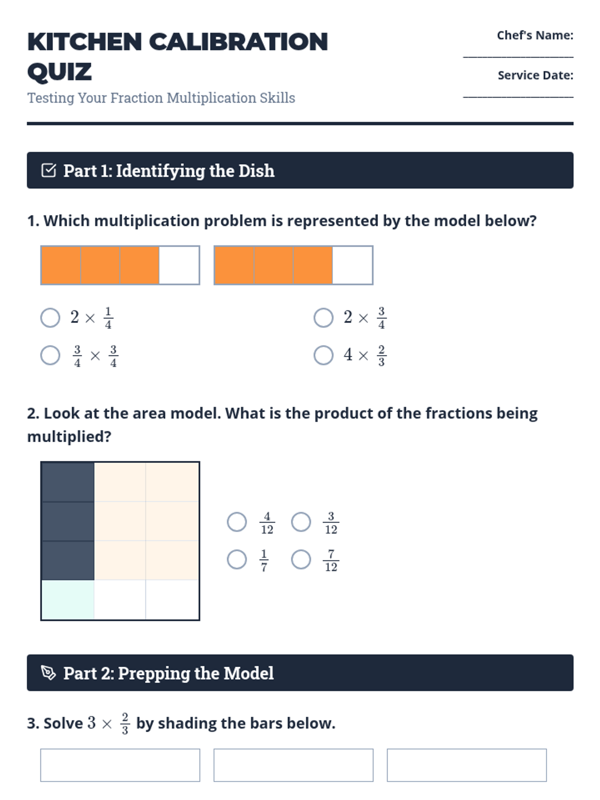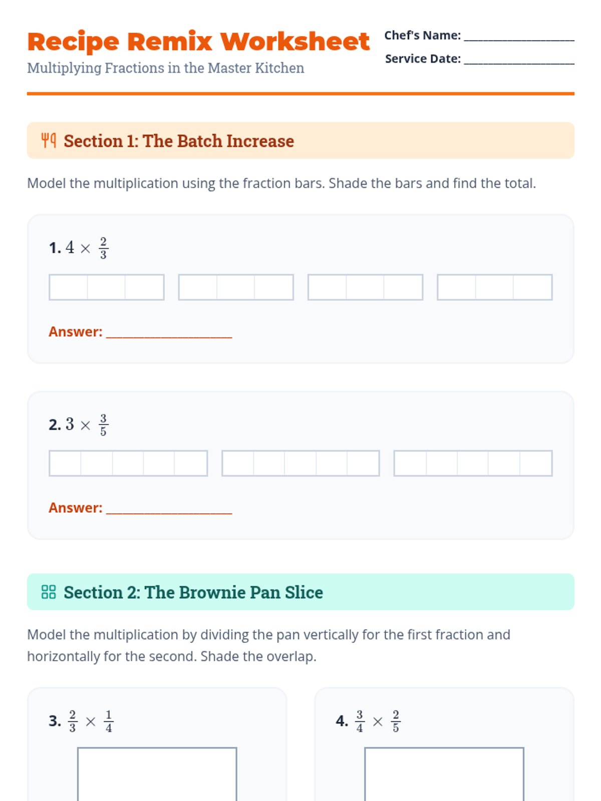 A comprehensive lesson on multiplying fractions using visual models like arrays and fraction bars, themed around a professional kitchen to make the math concrete and engaging.