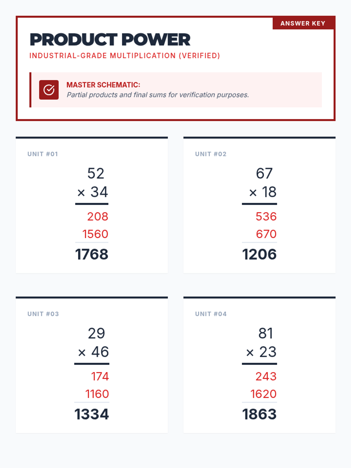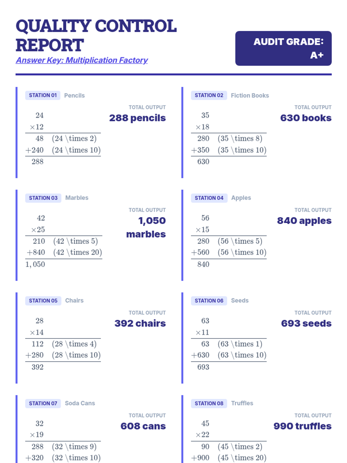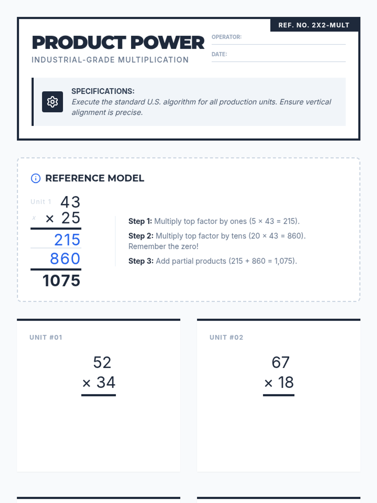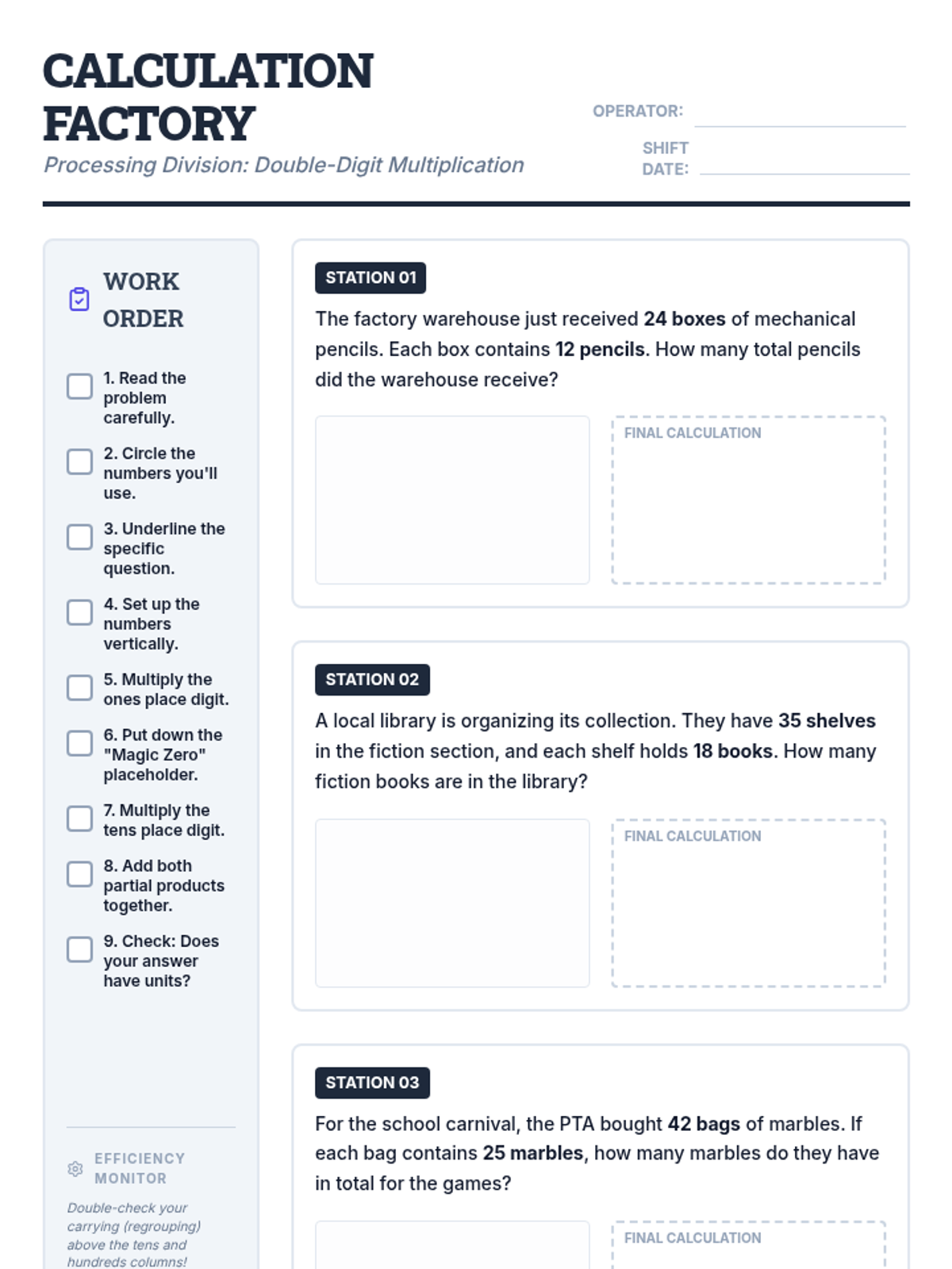 A focused practice session on double-digit by double-digit multiplication using the standard algorithm, set in an industrial blueprint-themed environment.