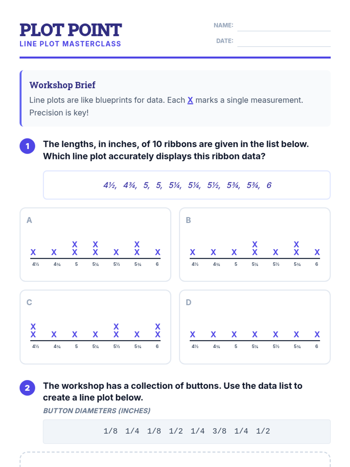 A focused practice session on creating, interpreting, and analyzing line plots with fractional measurements. Students will work through real-world crafting scenarios to master data visualization.