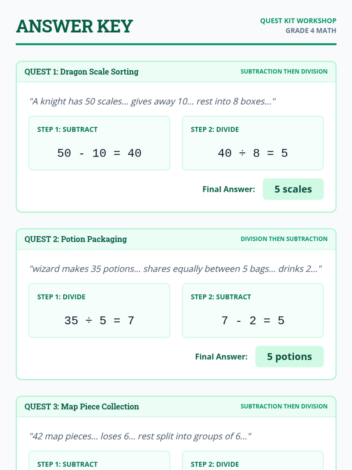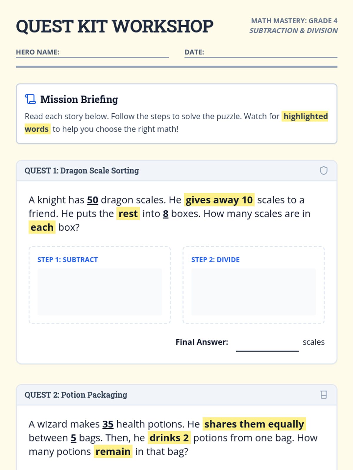 A math lesson focusing on solving two-step word problems using division and subtraction, designed with simplified text and highlighted keywords to support diverse learners.