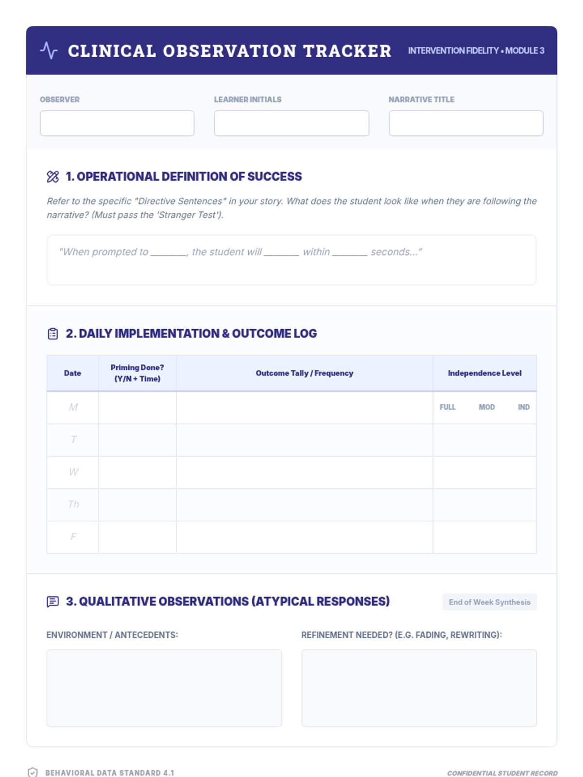 Teaches students how to design and use behavioral data collection sheets specifically aligned with the goals of a social narrative intervention.