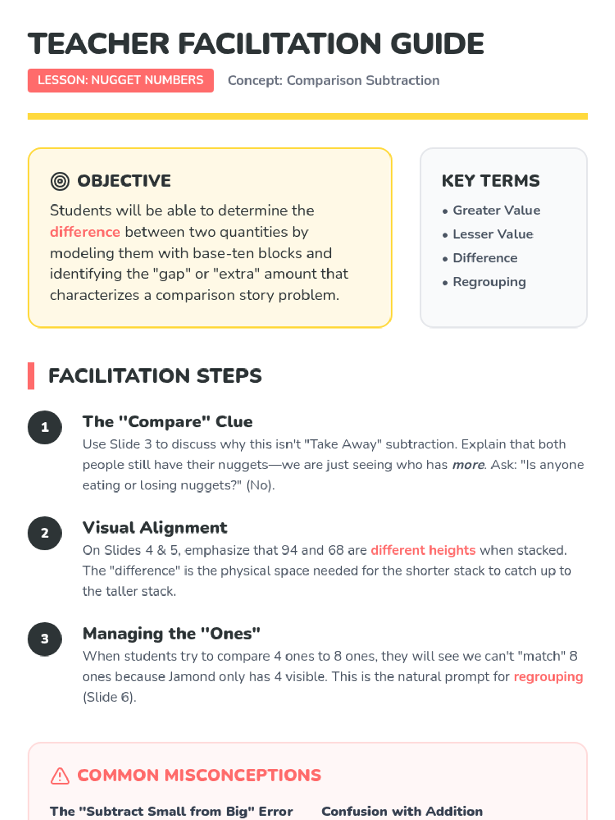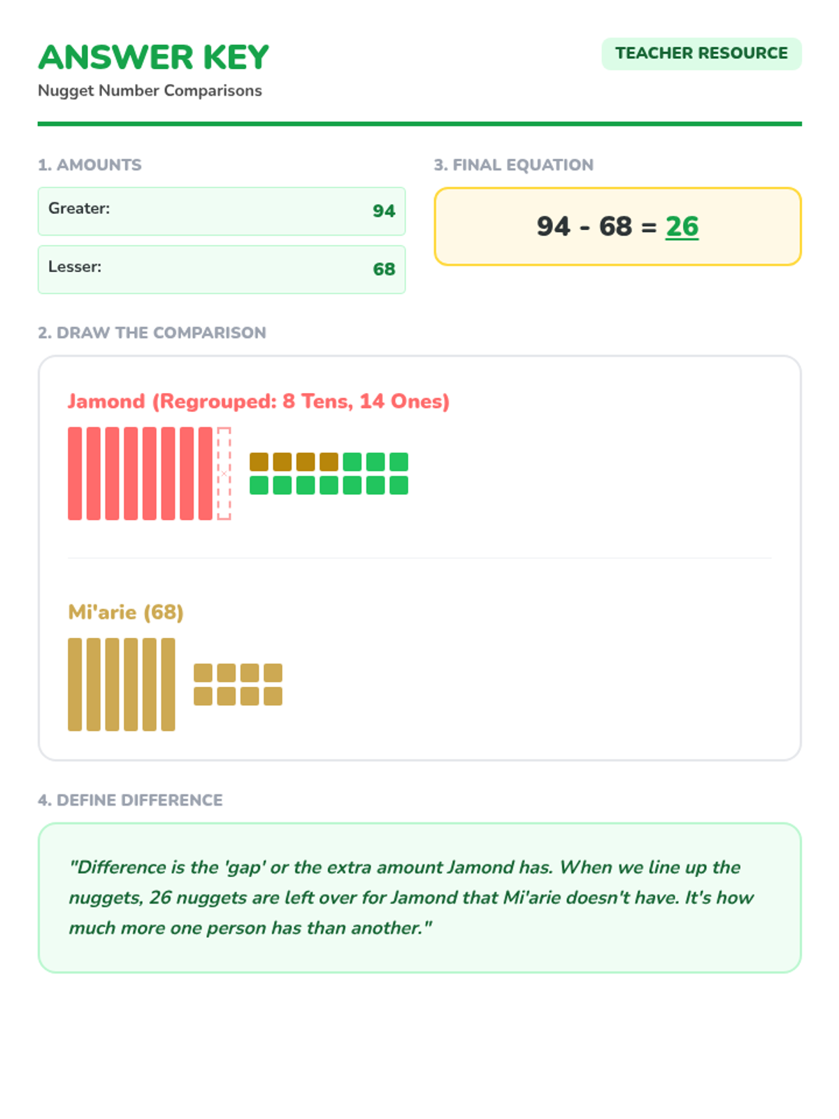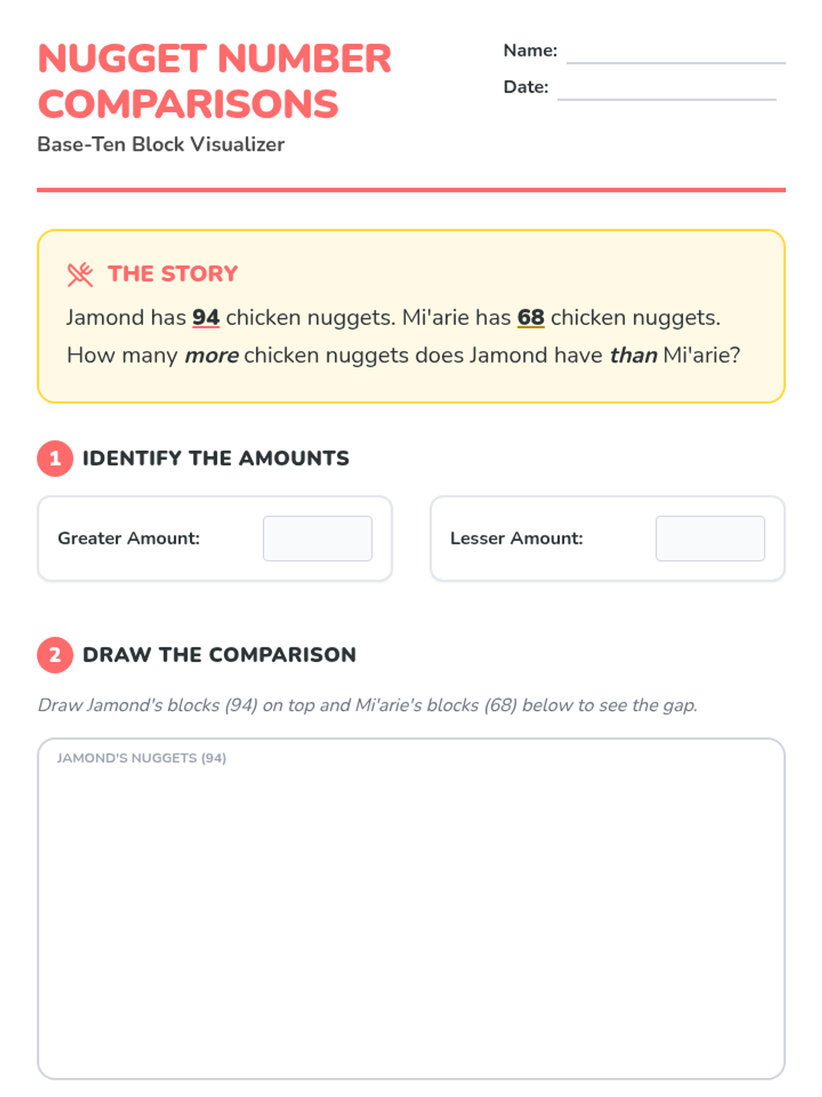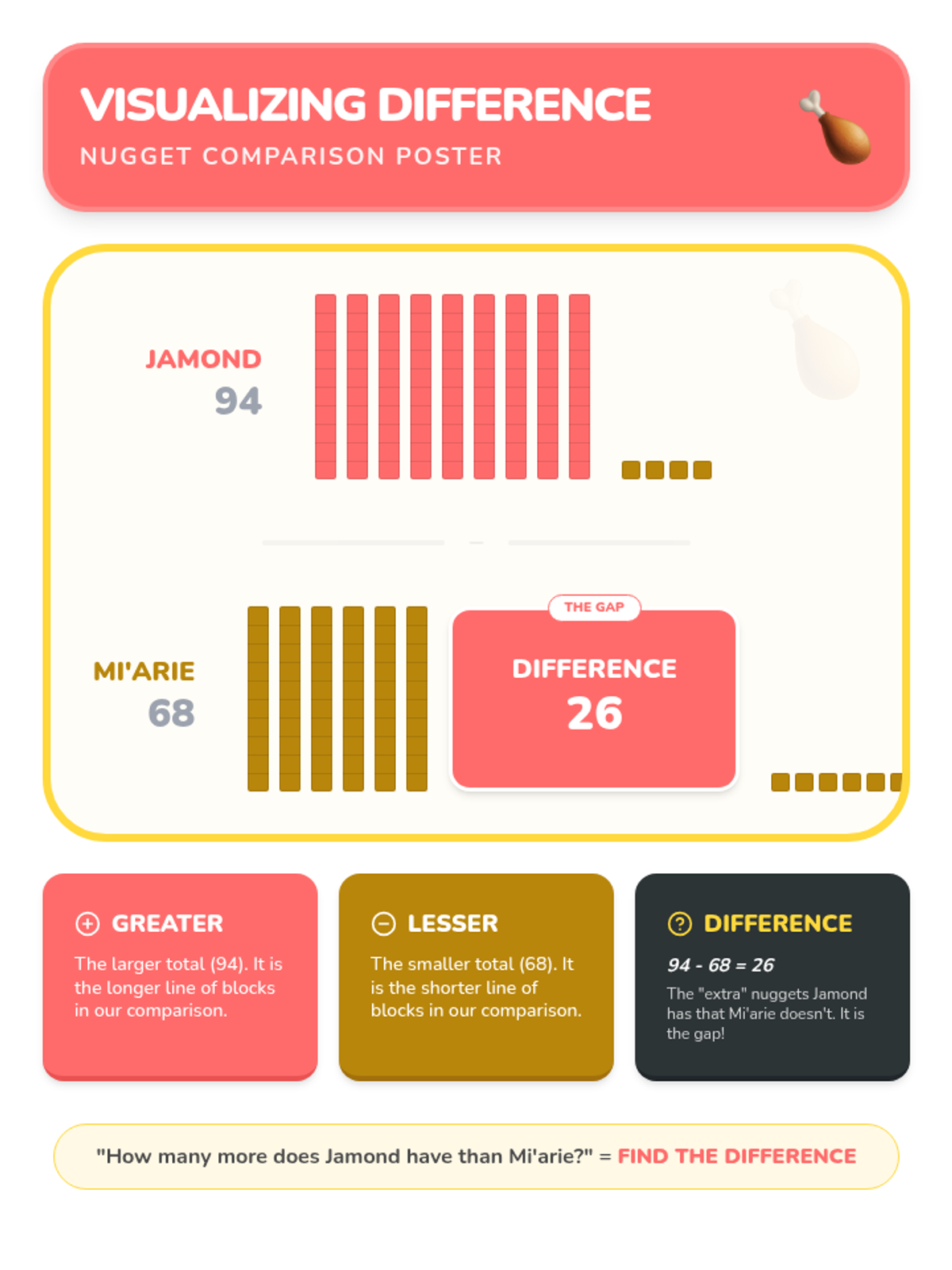 A visual exploration of subtraction using base-ten blocks to compare two quantities. Students learn to identify the greater and lesser values and define 'difference' through a real-world story problem involving chicken nuggets.
