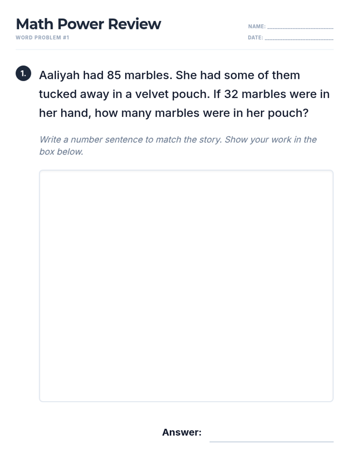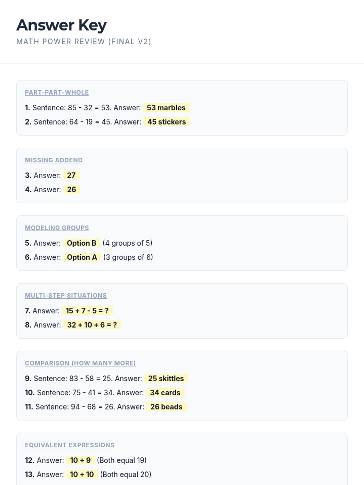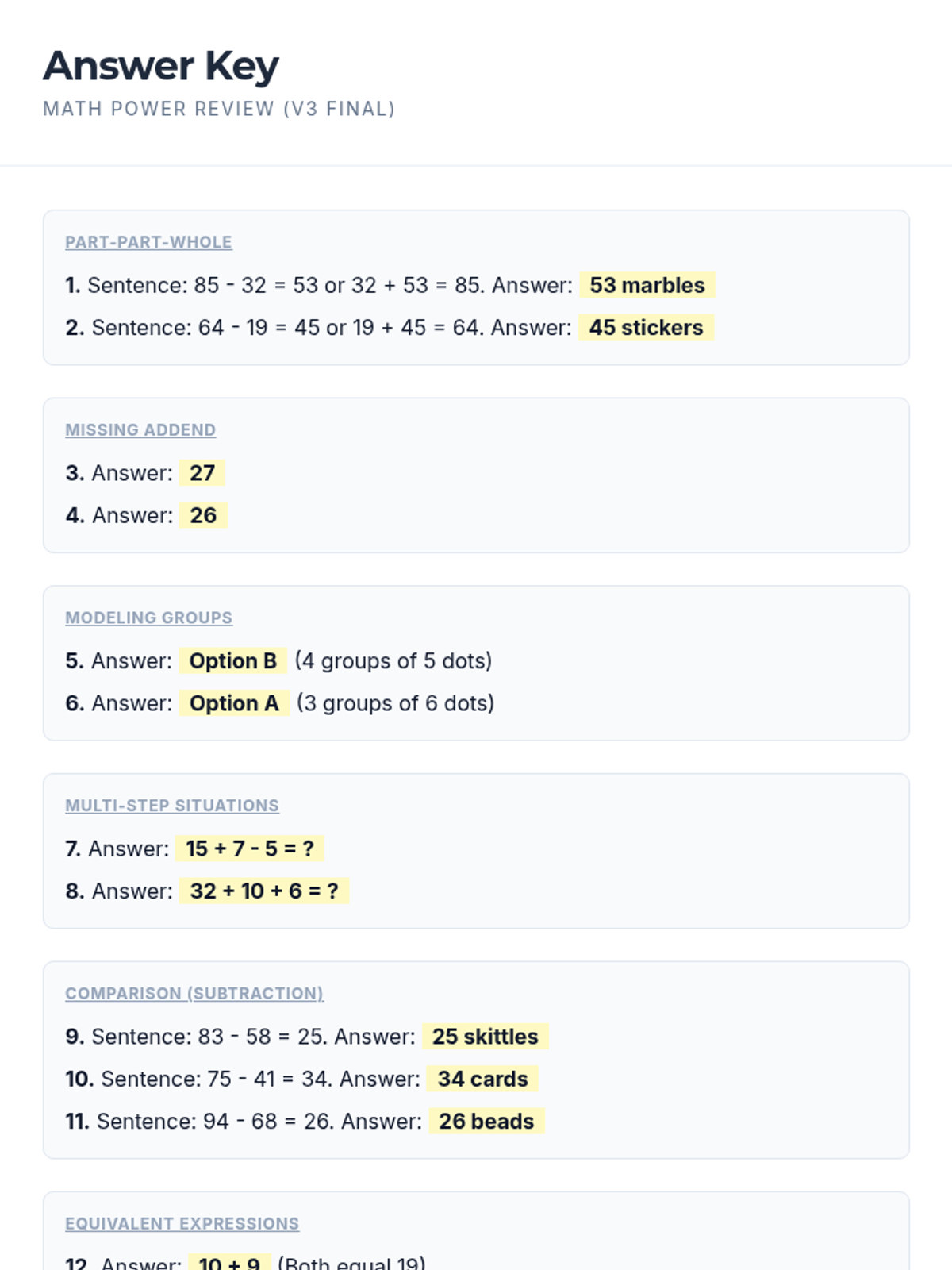 A comprehensive math review packet covering word problems, equations, and fluency, designed for second-grade students to practice key operational skills.