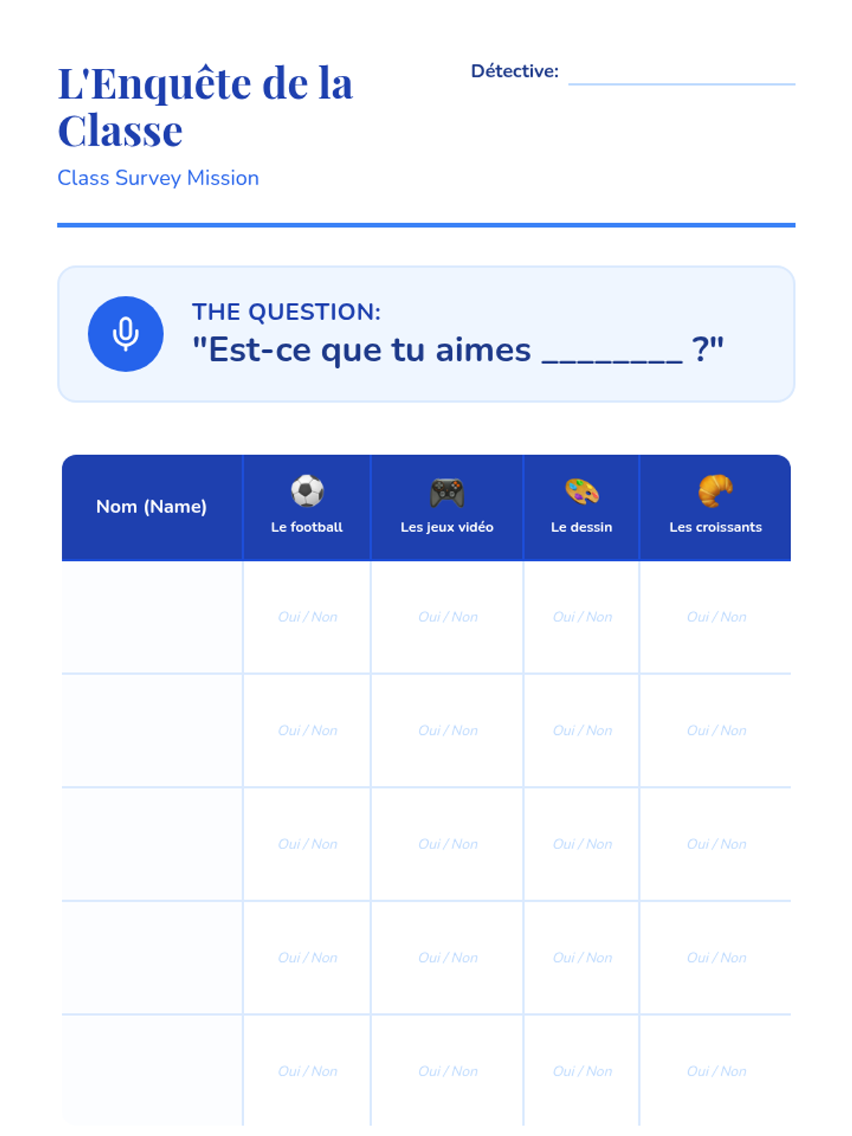 Students conduct a class-wide survey asking 'Est-ce que tu aimes...?' and recording their classmates' responses. They practice listening comprehension and clear spoken production.