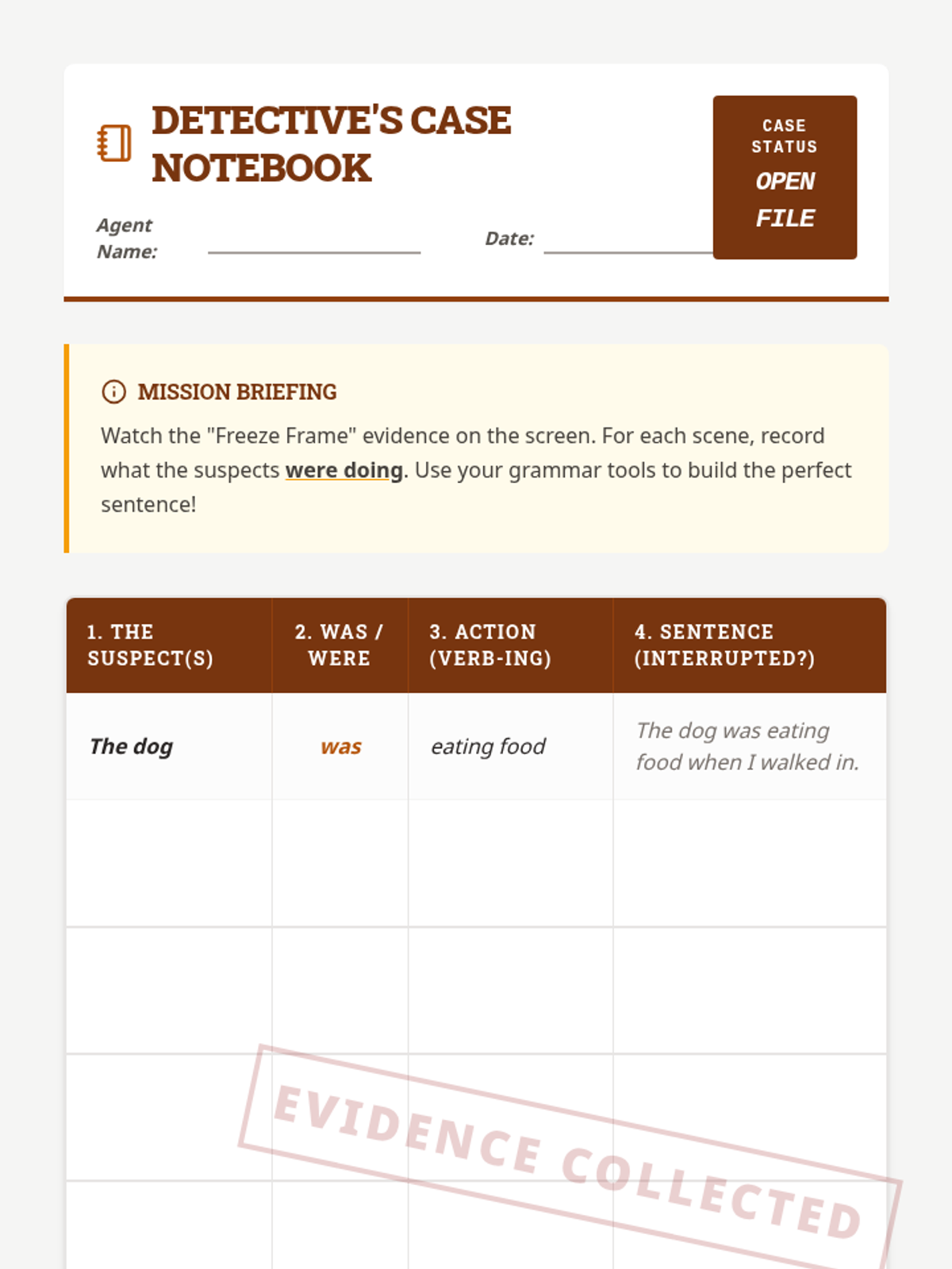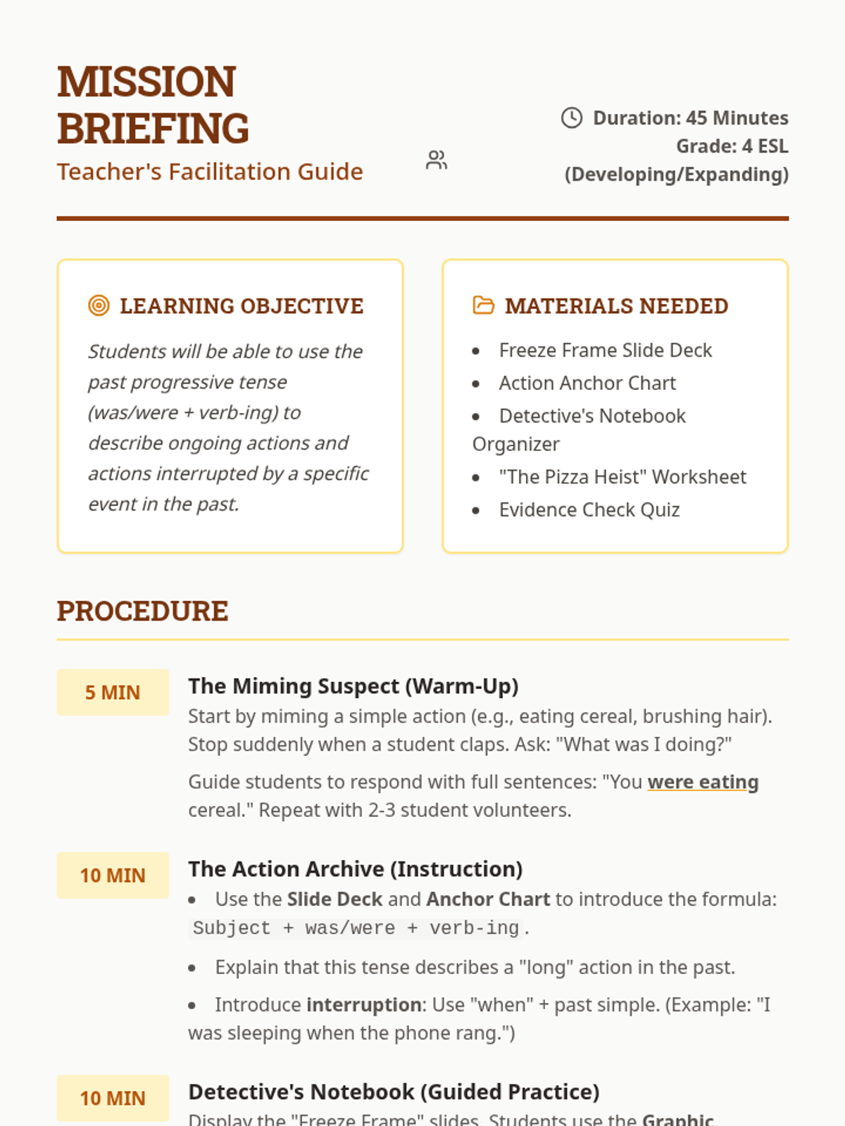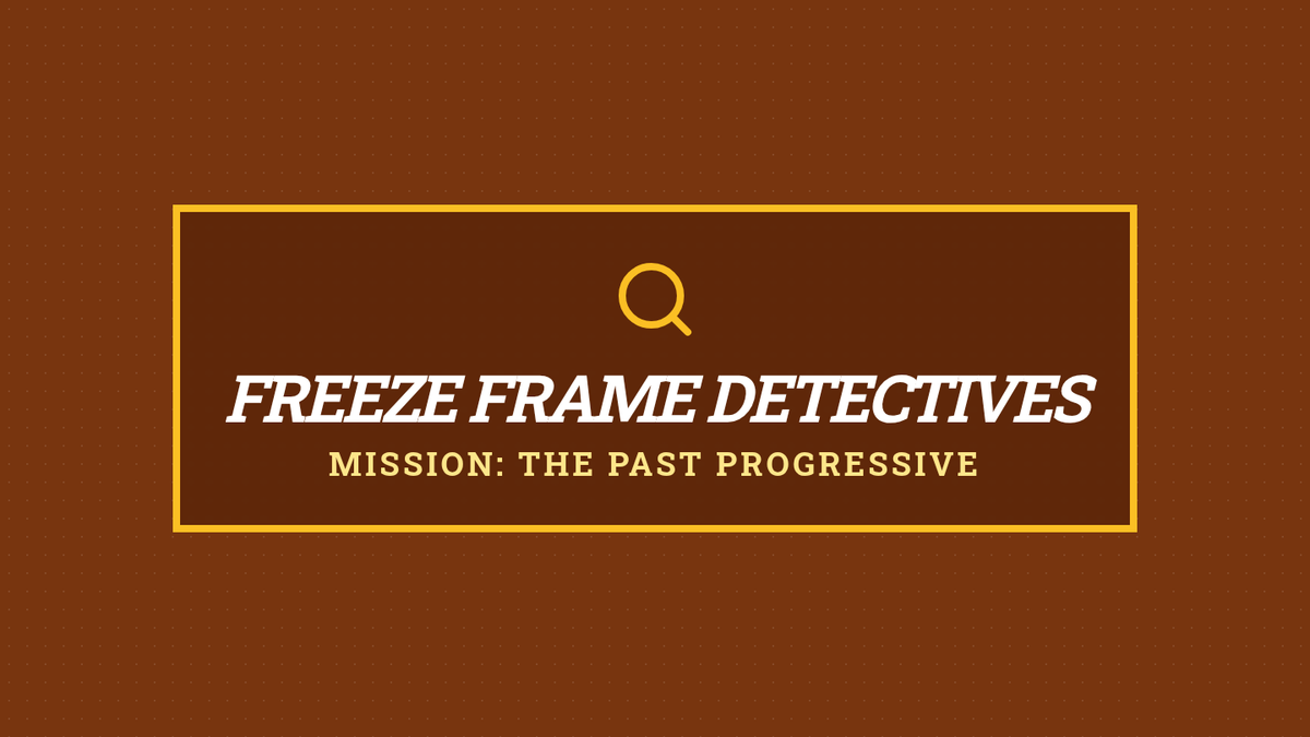 A 45-minute ESL lesson for Grade 4 (Developing/Expanding) focused on using the past progressive tense (was/were + verb-ing) to describe ongoing and interrupted actions in the past. Students take on the role of 'Freeze Frame Detectives' to investigate past events.