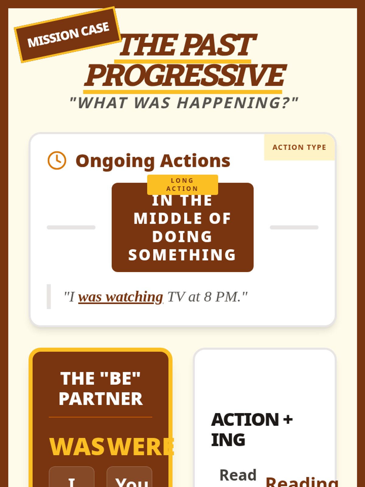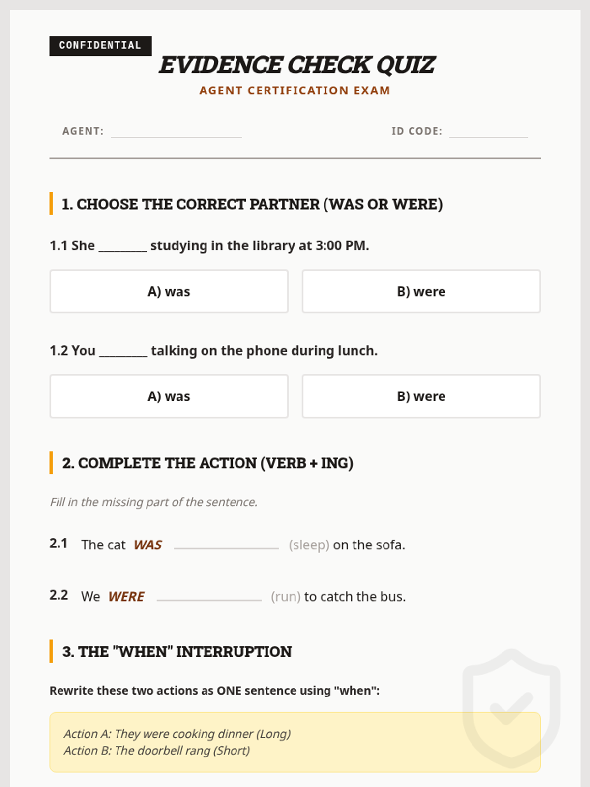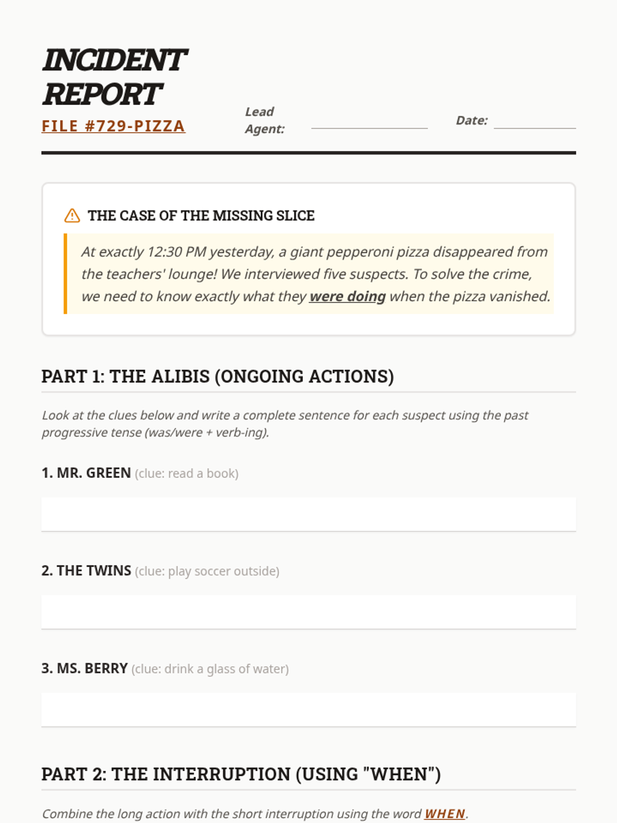 A 45-minute ESL lesson for Grade 4 (Developing/Expanding) focused on using the past progressive tense (was/were + verb-ing) to describe ongoing and interrupted actions in the past. Students take on the role of 'Freeze Frame Detectives' to investigate past events.