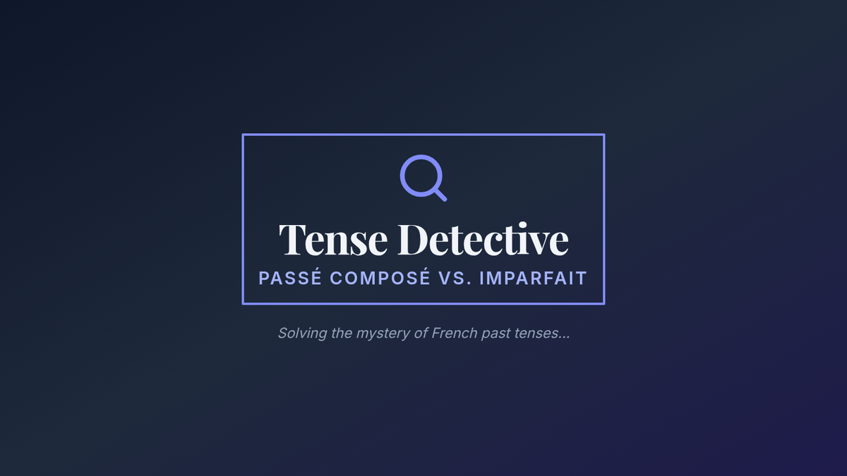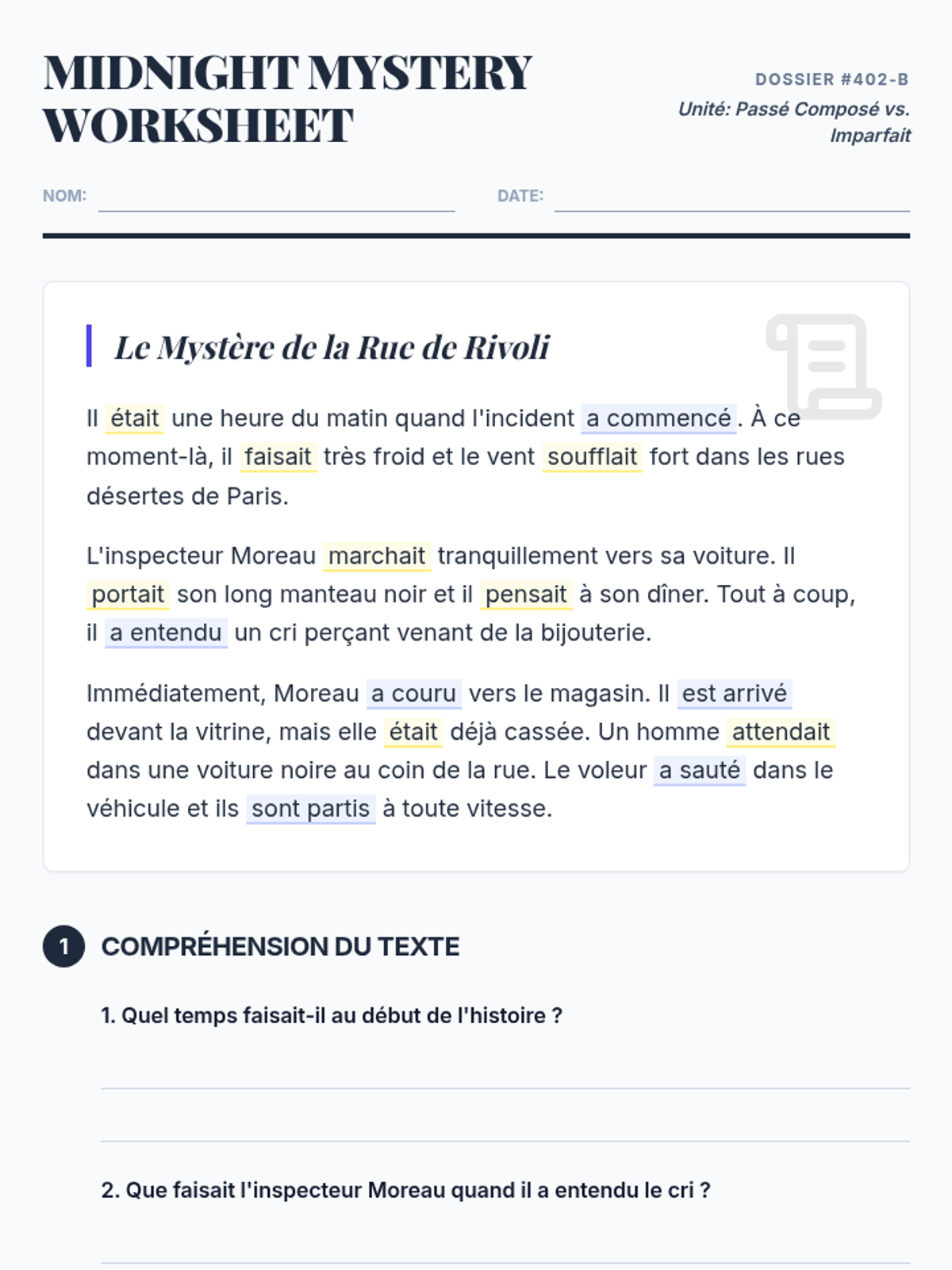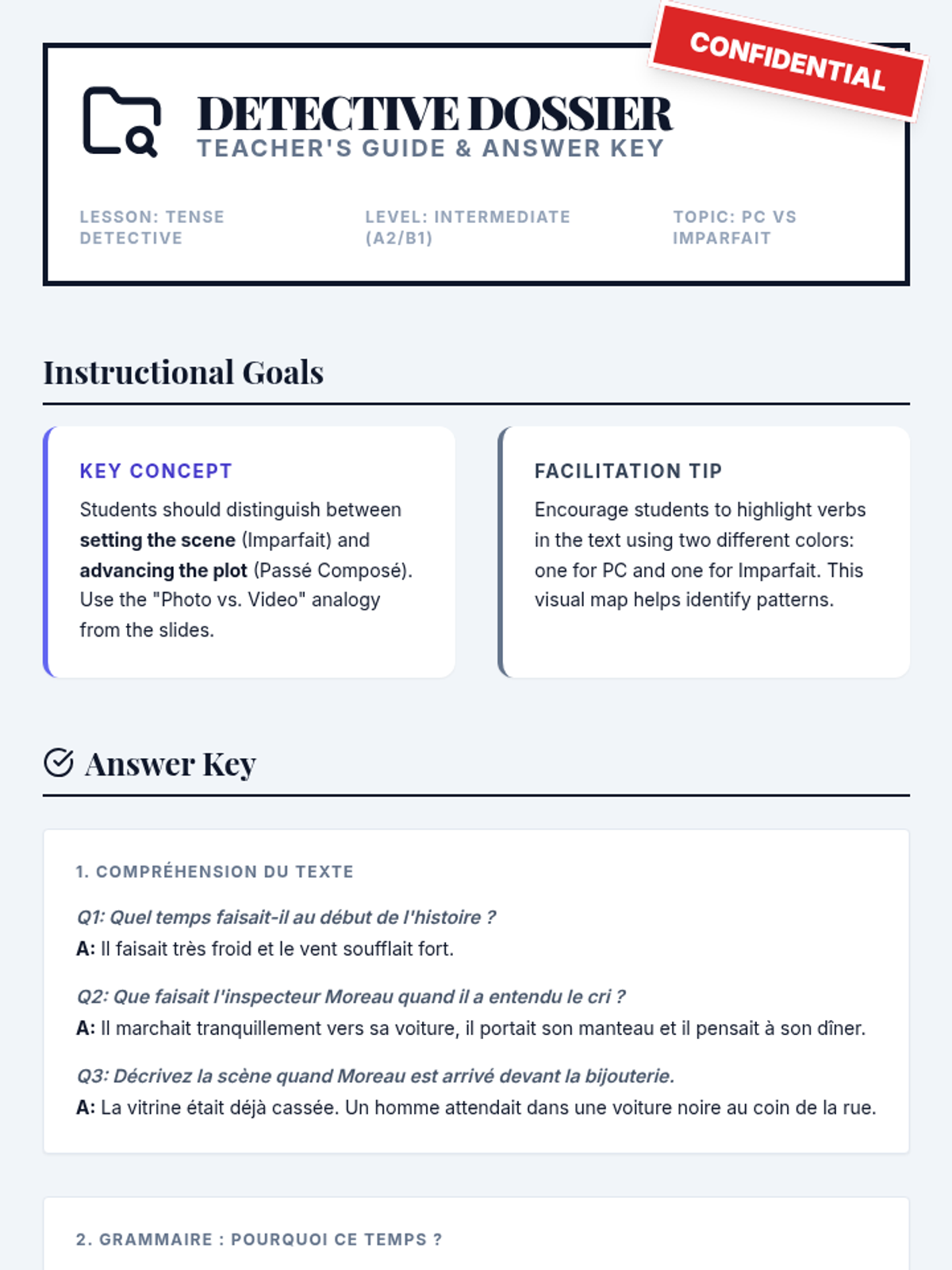 A French grammar lesson focused on distinguishing between the Passé Composé and Imparfait through a mystery narrative. Students learn to set the scene with descriptions (Imparfait) and identify completed actions (Passé Composé).