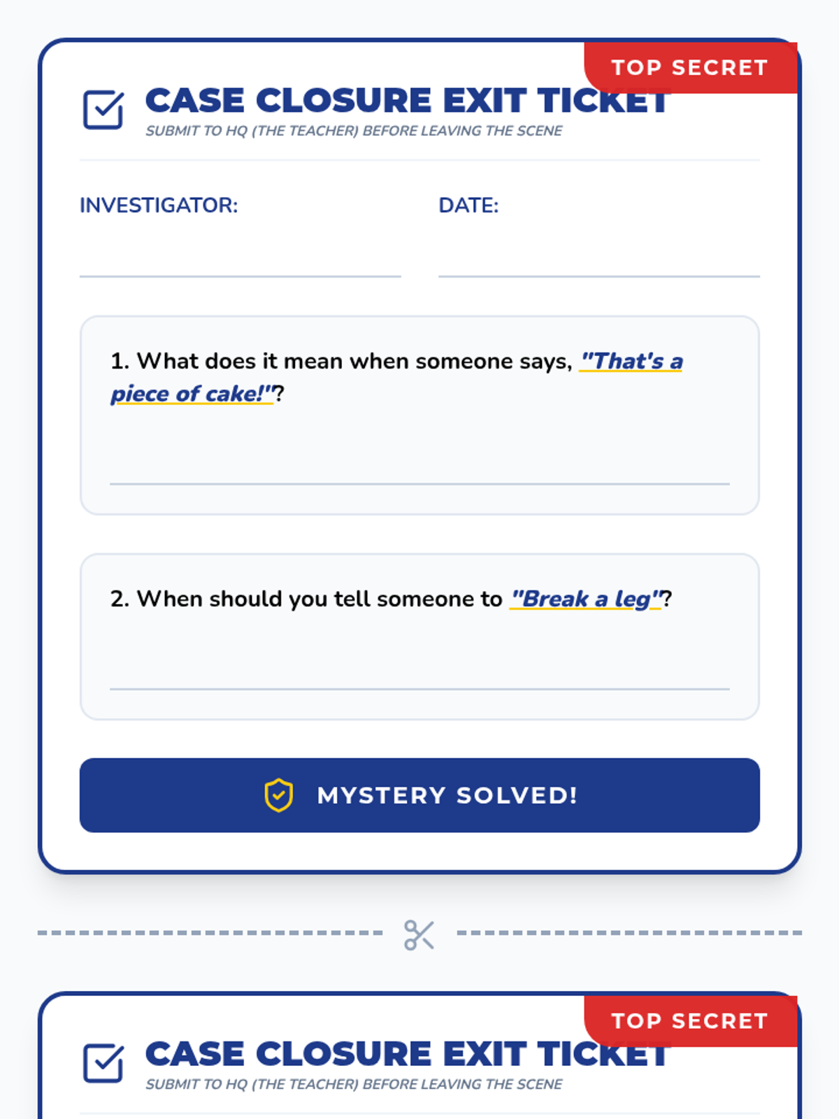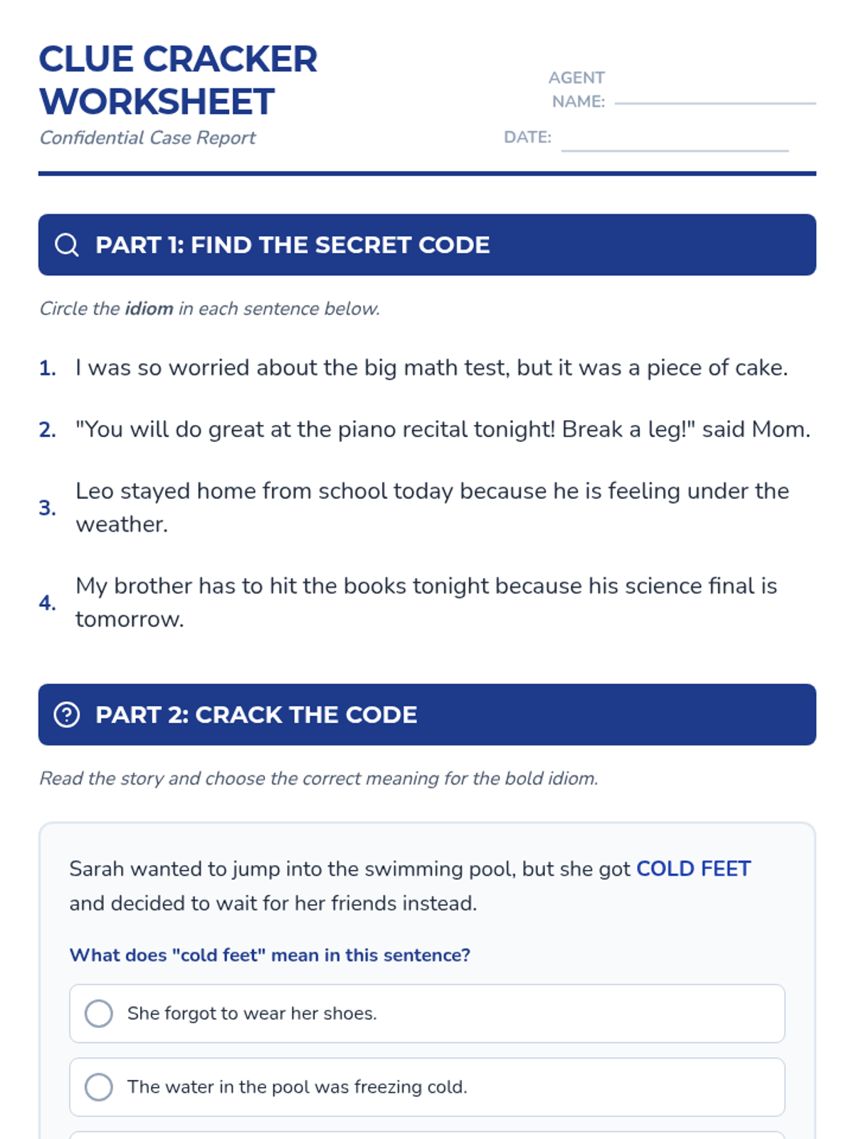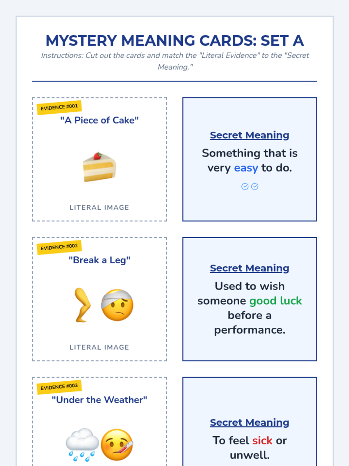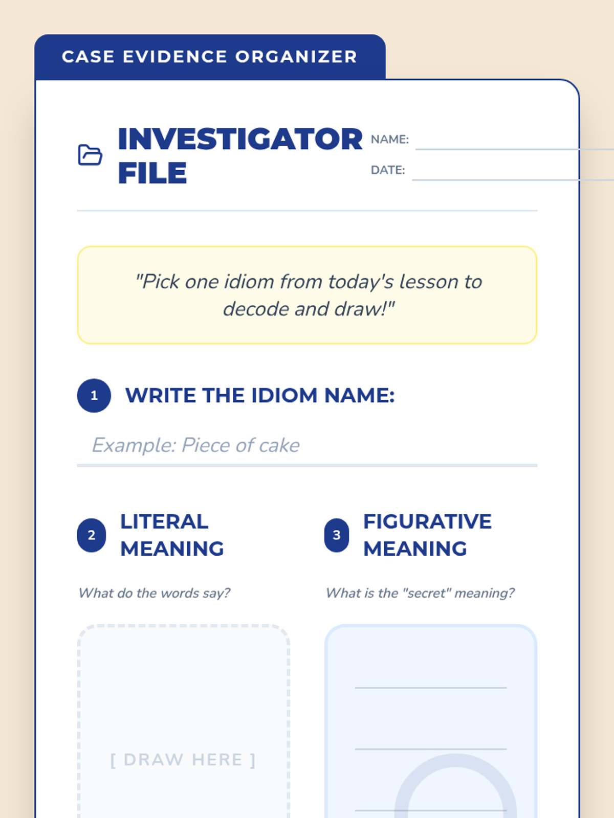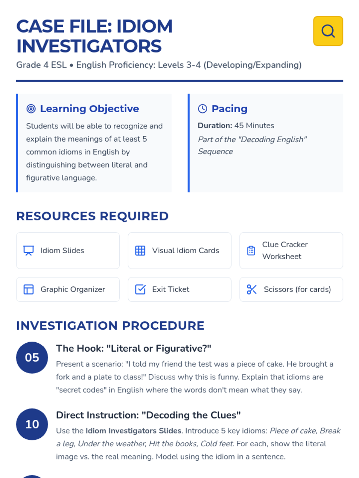 A 45-minute ESL lesson for Grade 4 (Levels 3-4) focusing on recognizing and explaining common idioms through a fun detective theme. Students act as 'Idiom Investigators' to decode hidden meanings in everyday English.