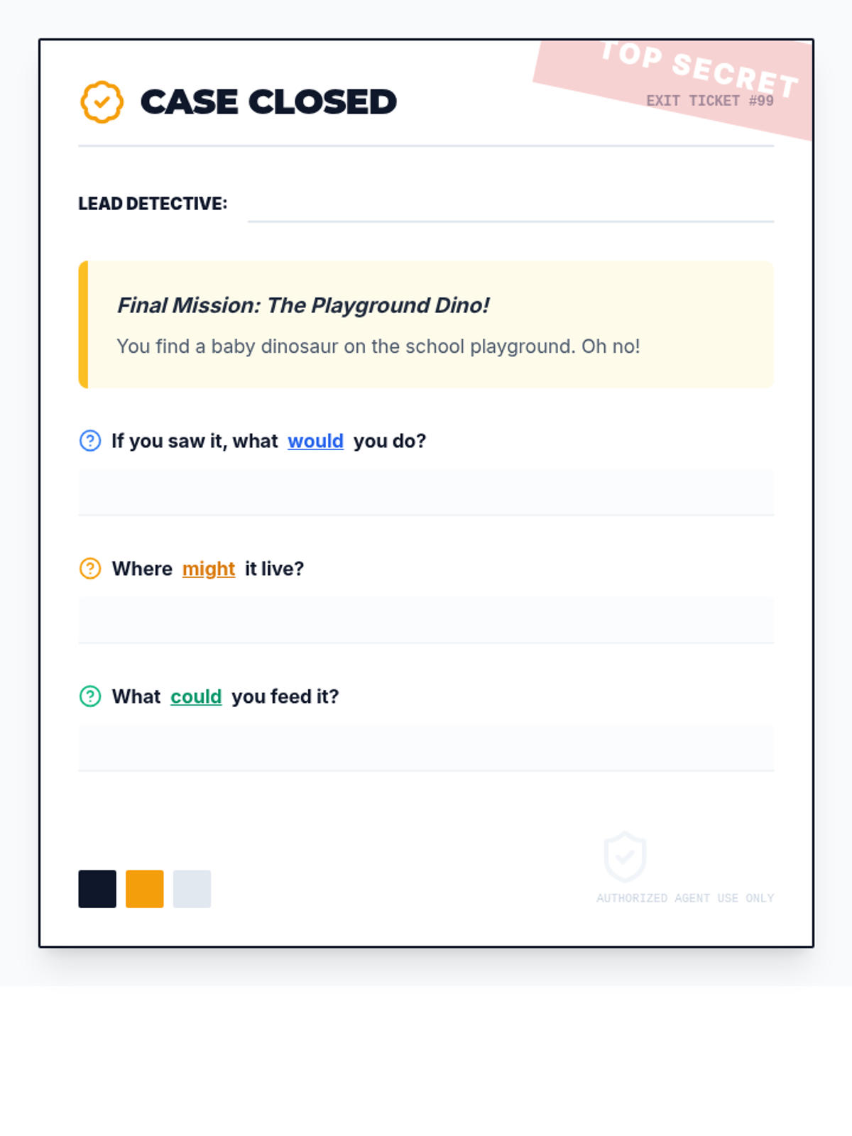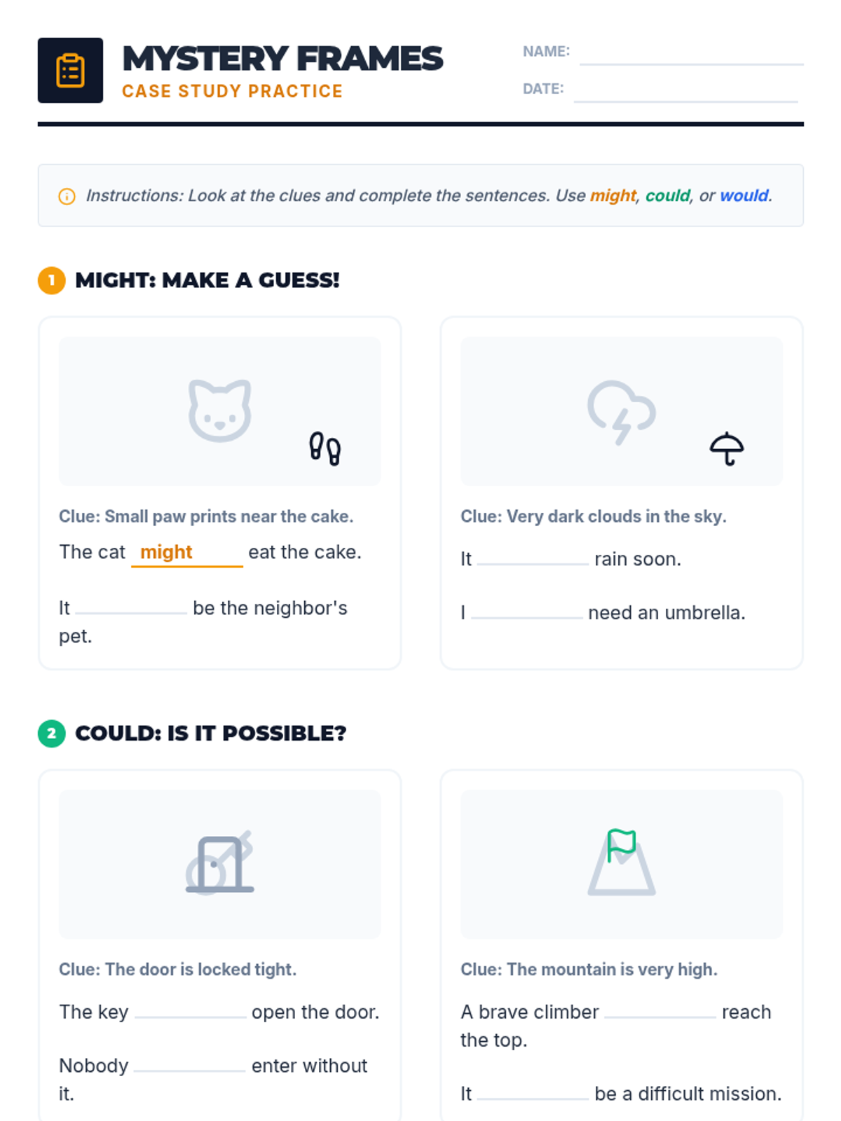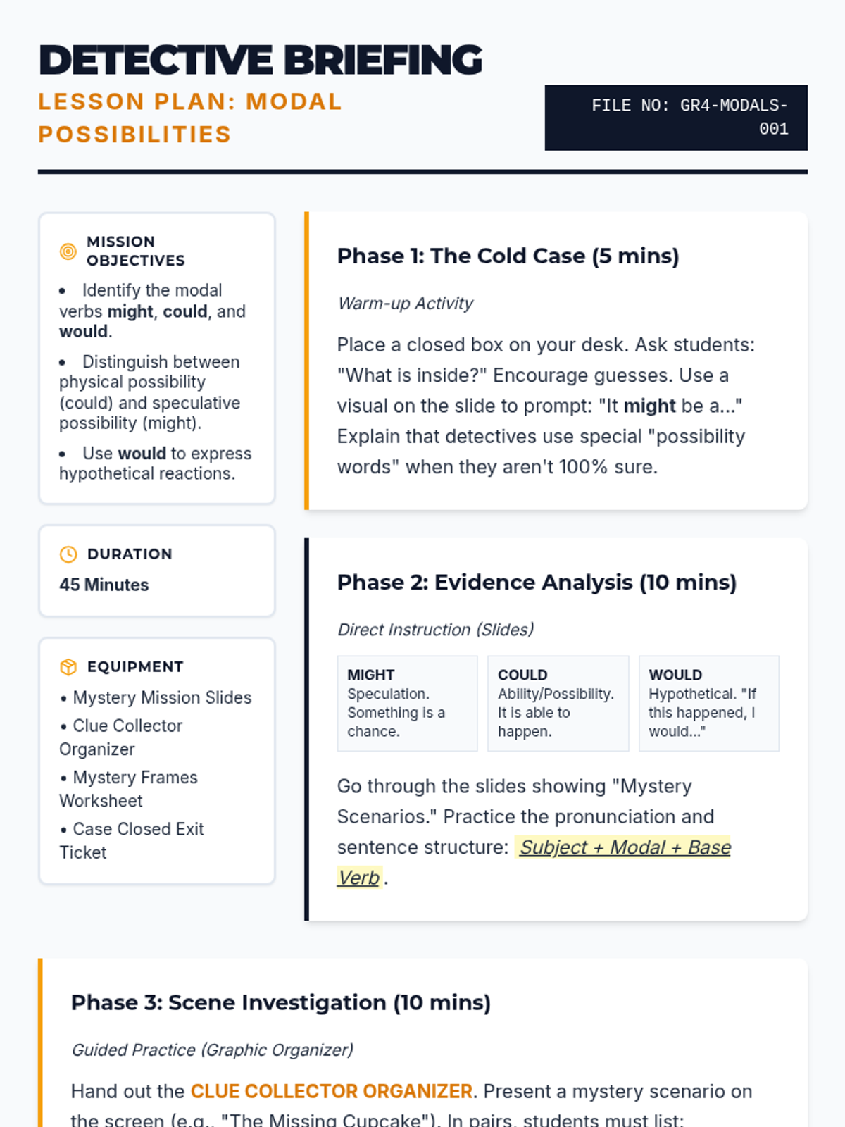 A 45-minute Grade 4 ESL lesson where students become detectives to explore the modal verbs might, could, and would to express possibility and hypothetical situations.