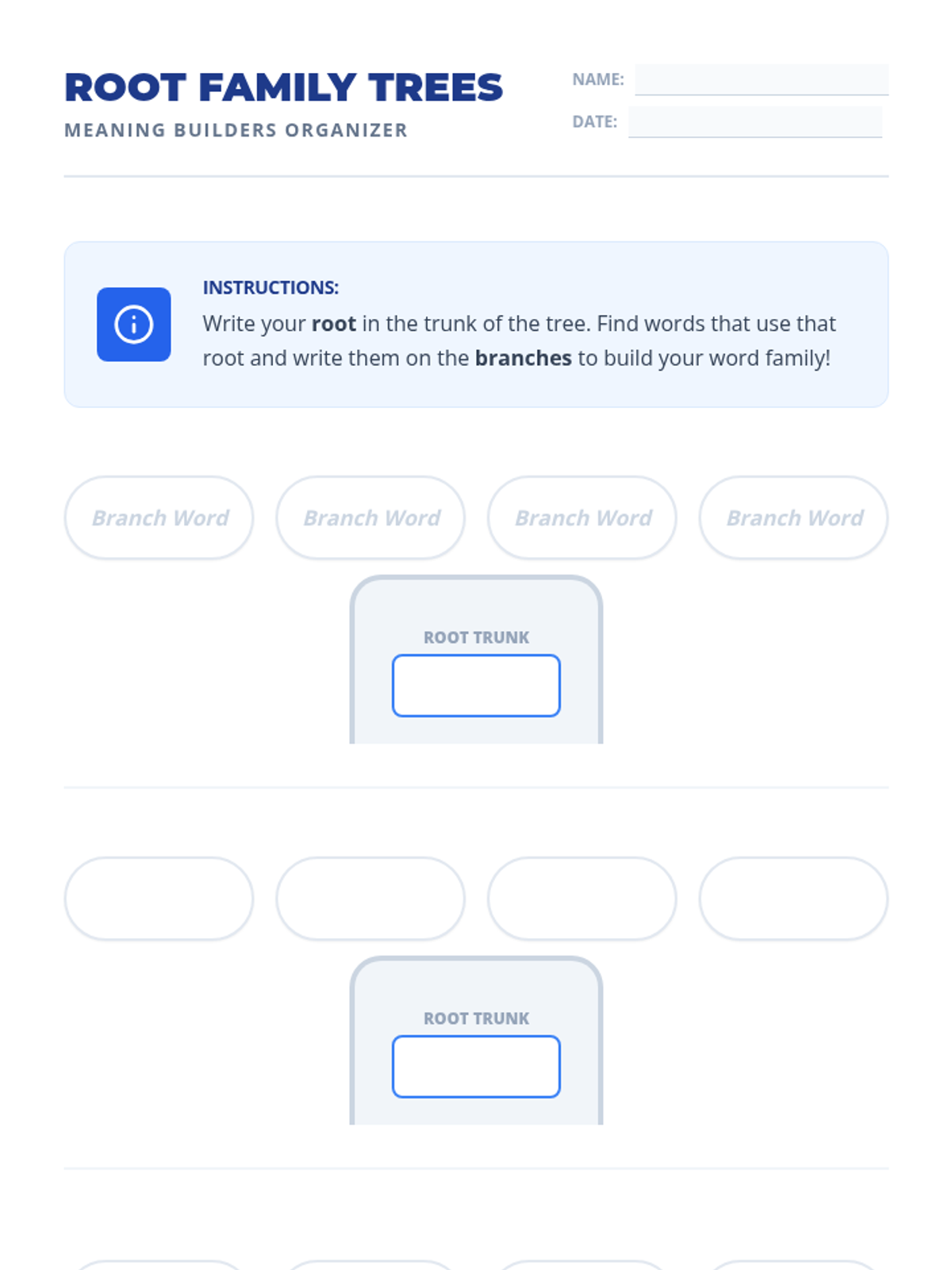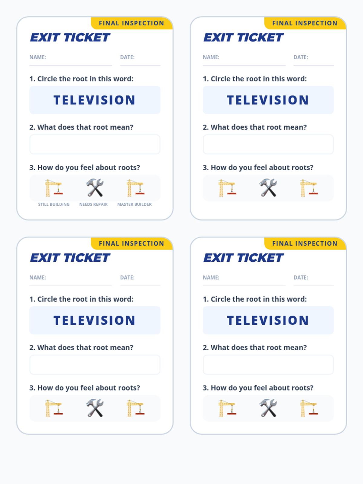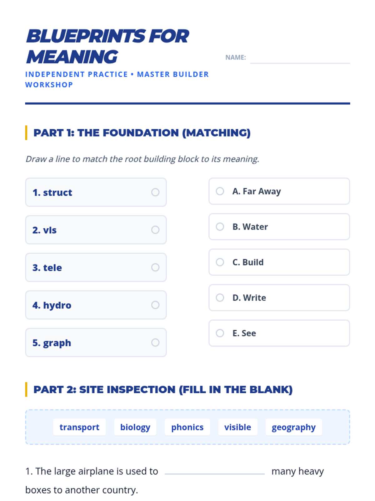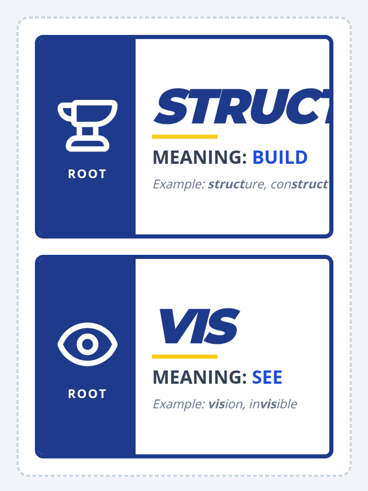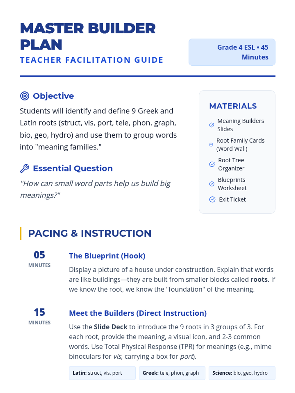 A 45-minute Grade 4 ESL lesson exploring 9 essential Greek and Latin roots (struct, vis, port, tele, phon, graph, bio, geo, hydro) to help students decode complex words and build word families.