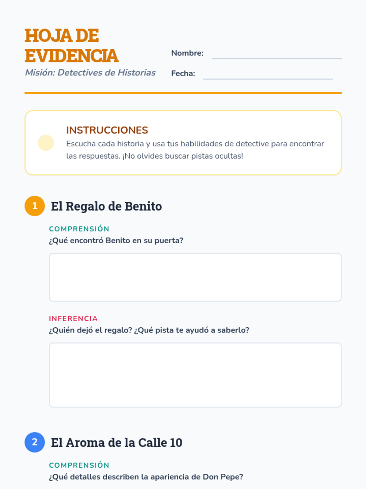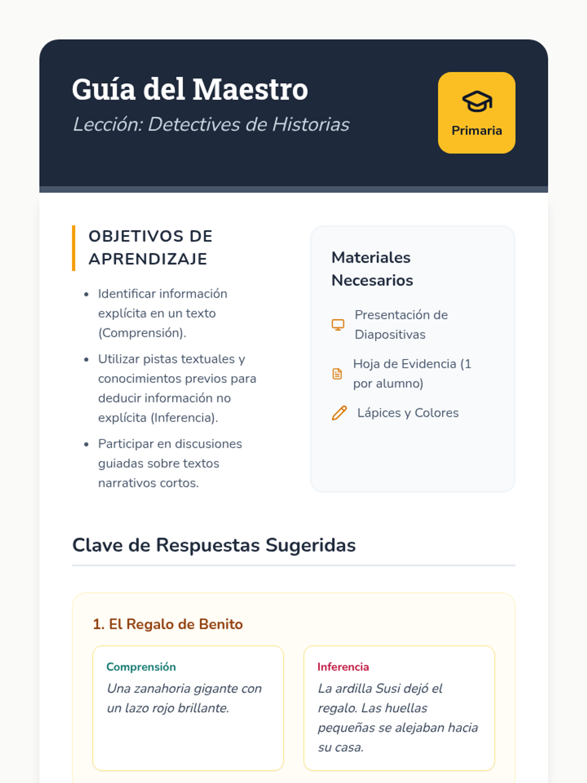 Una lección interactiva diseñada para enseñar a los estudiantes a comprender textos y realizar inferencias a través de tres cuentos cortos y encantadores. Incluye una mini-lección sobre las habilidades de pensamiento crítico necesarias para ser un detective de historias.