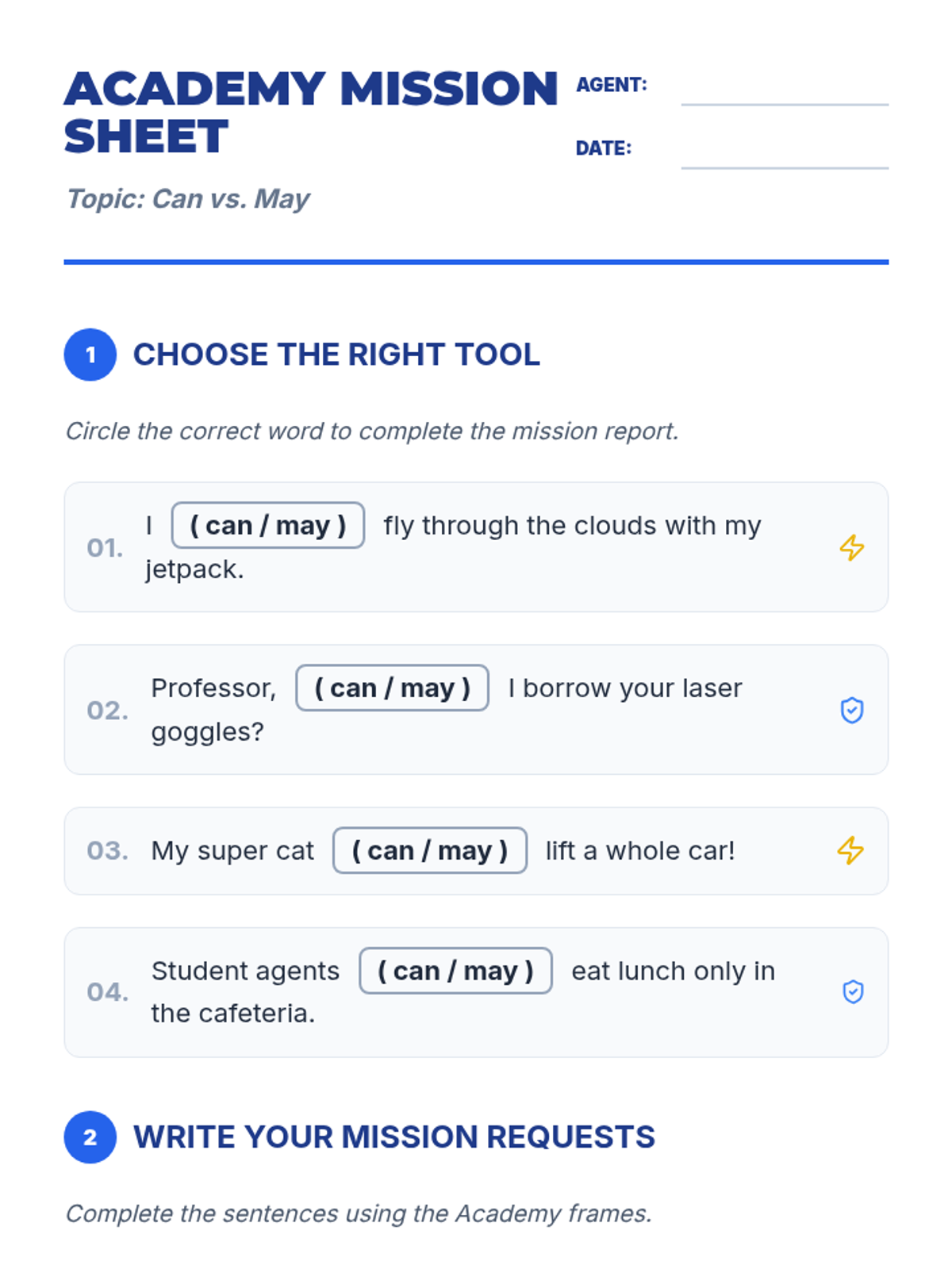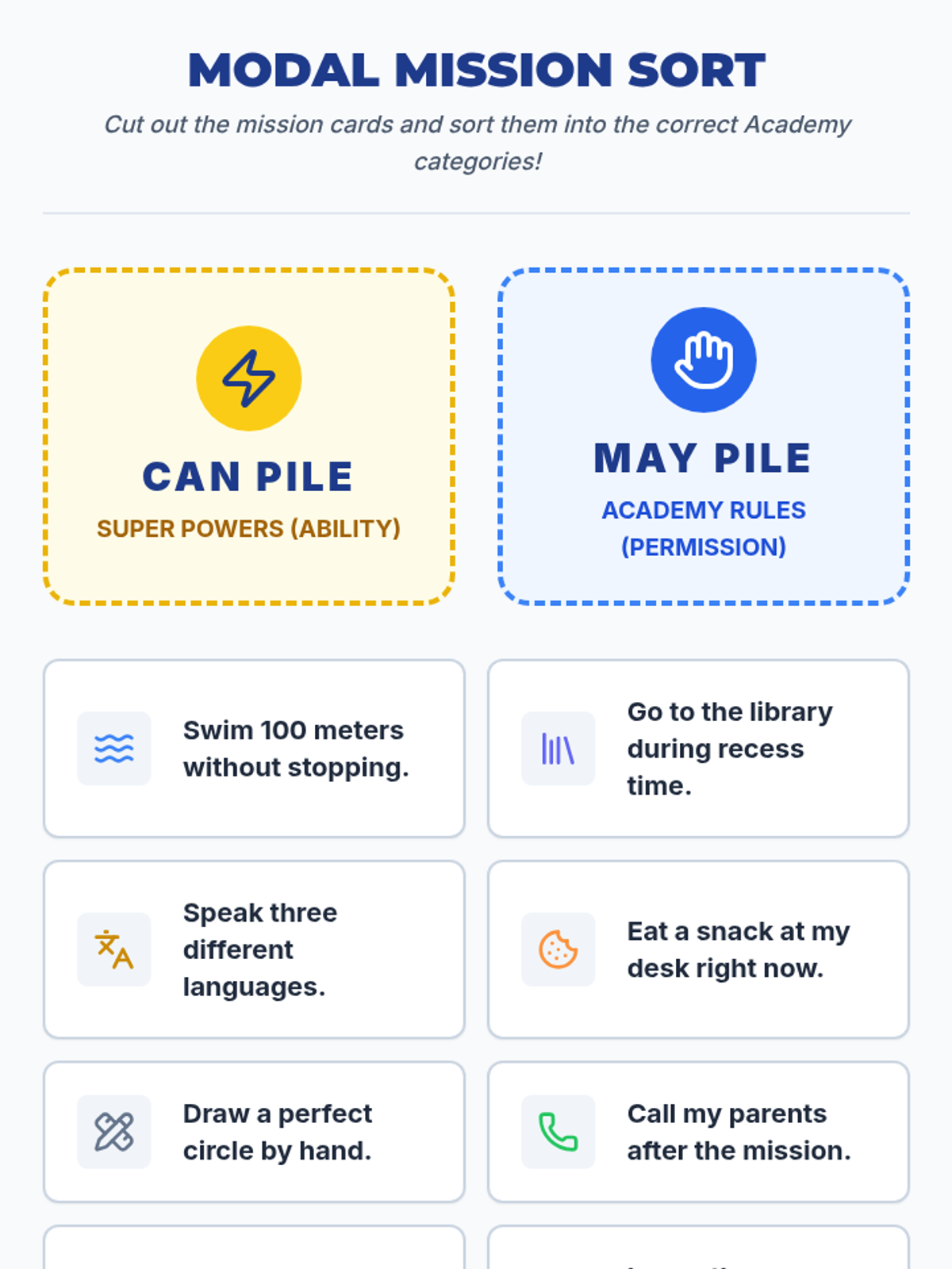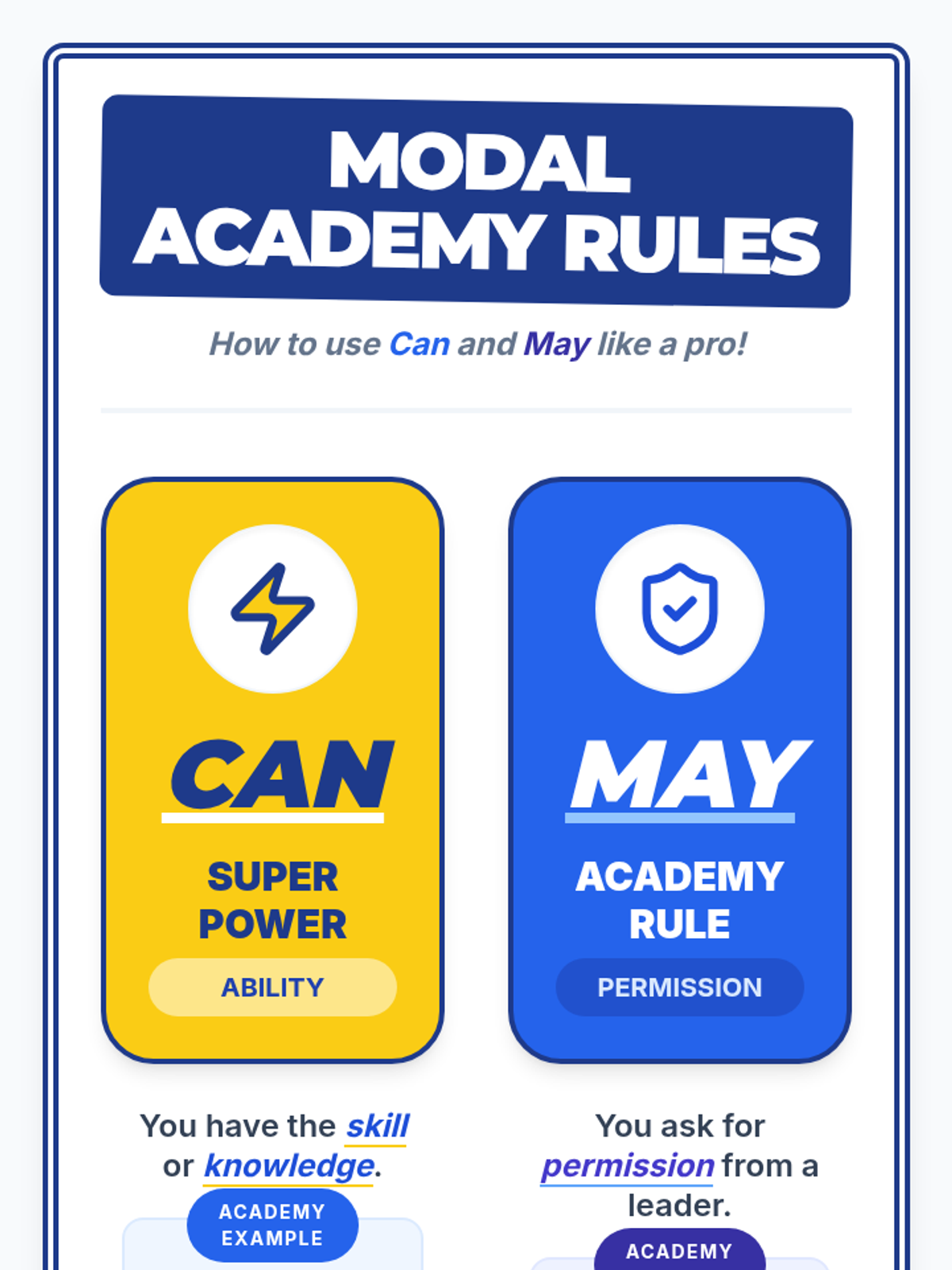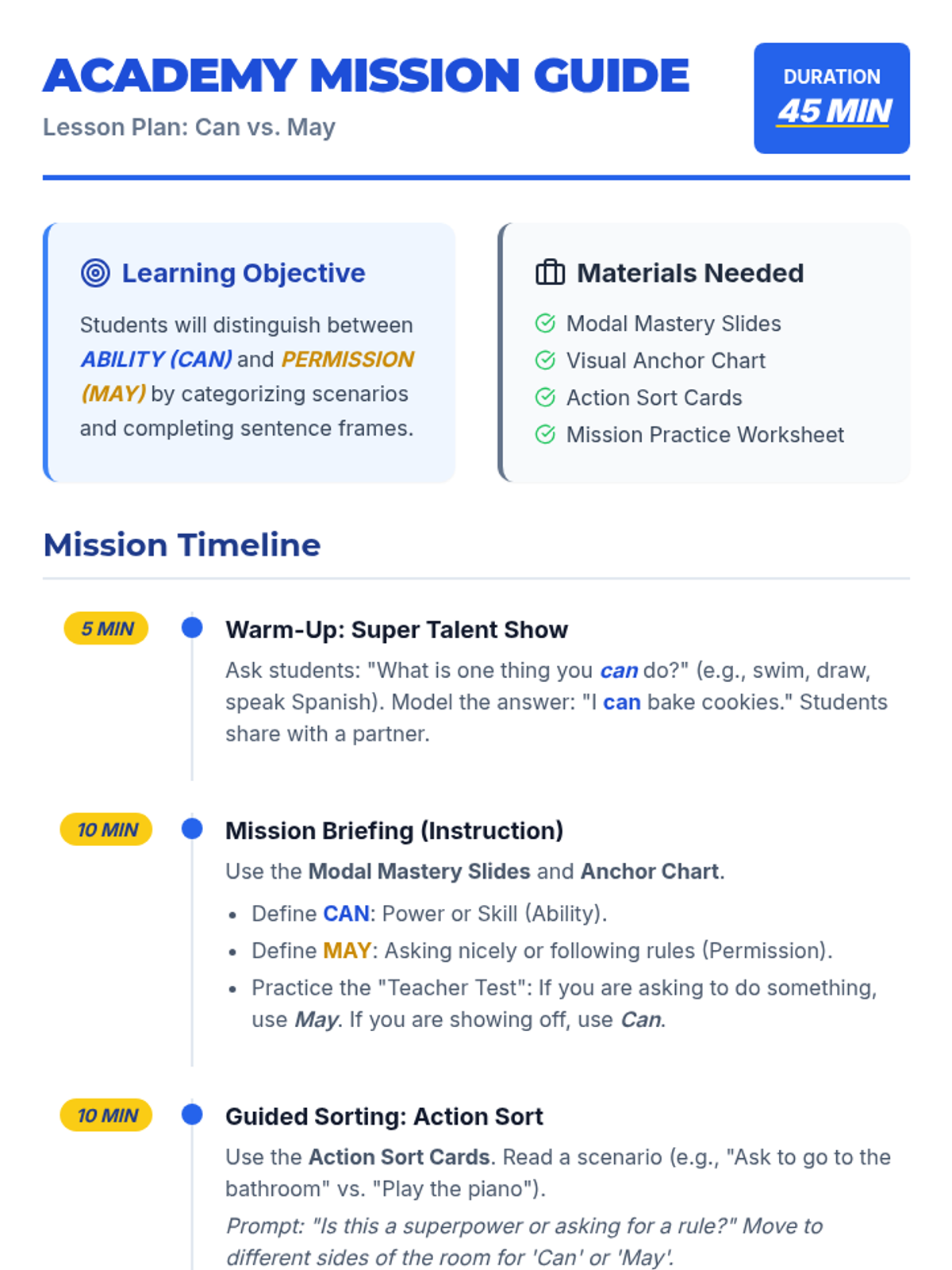 A 45-minute ESL lesson for Grade 4 (Level 3) focused on distinguishing between modal verbs 'can' (ability) and 'may' (permission) using a Super Academy theme.