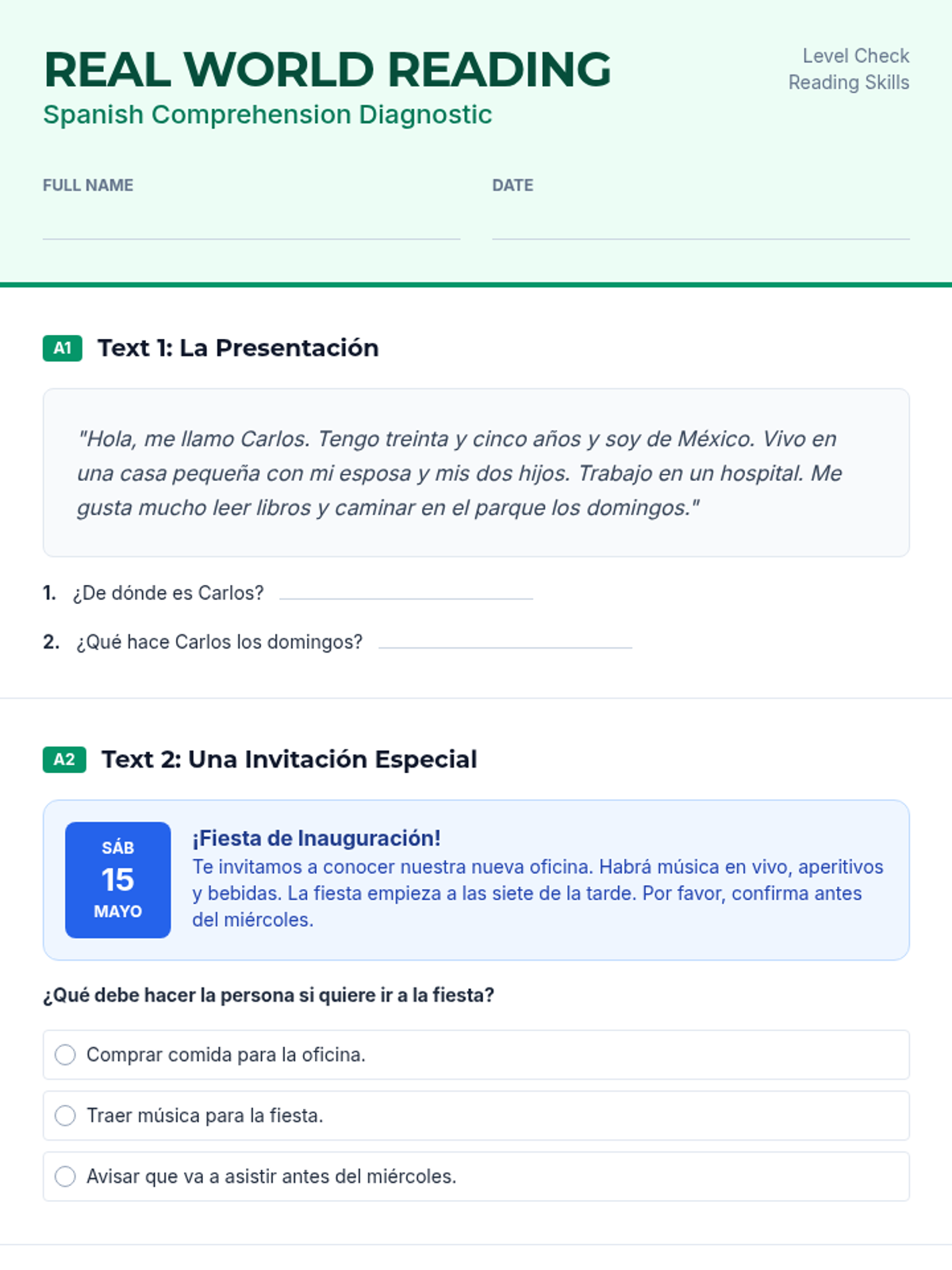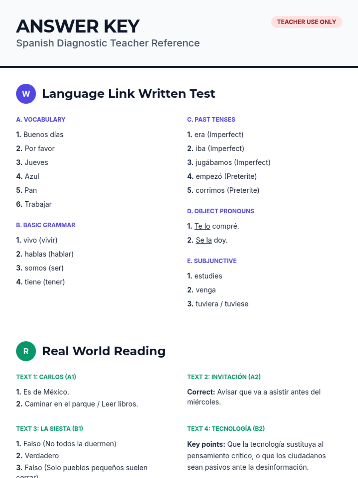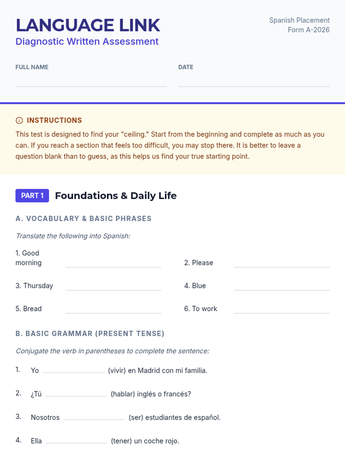A comprehensive diagnostic assessment suite designed for adult learners to determine their current Spanish proficiency level across reading, writing, listening, and speaking. The materials move from foundational basics to advanced structures to provide a clear placement for the learner.