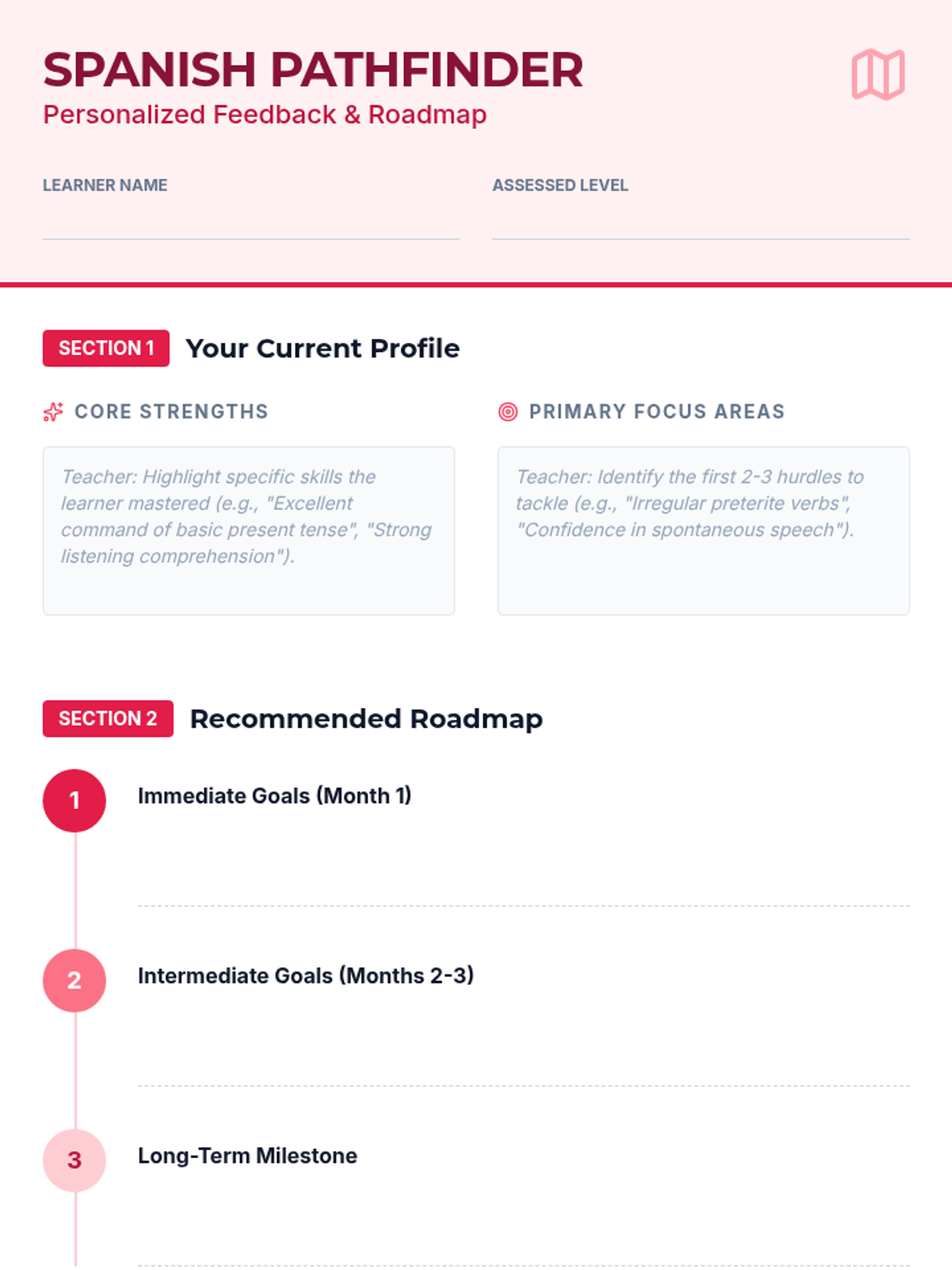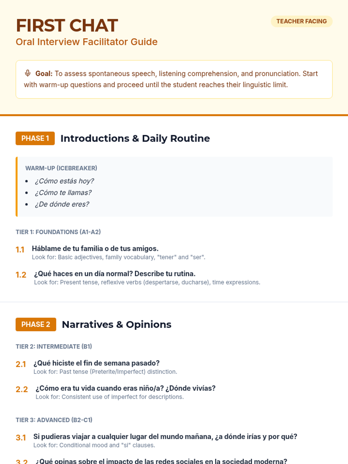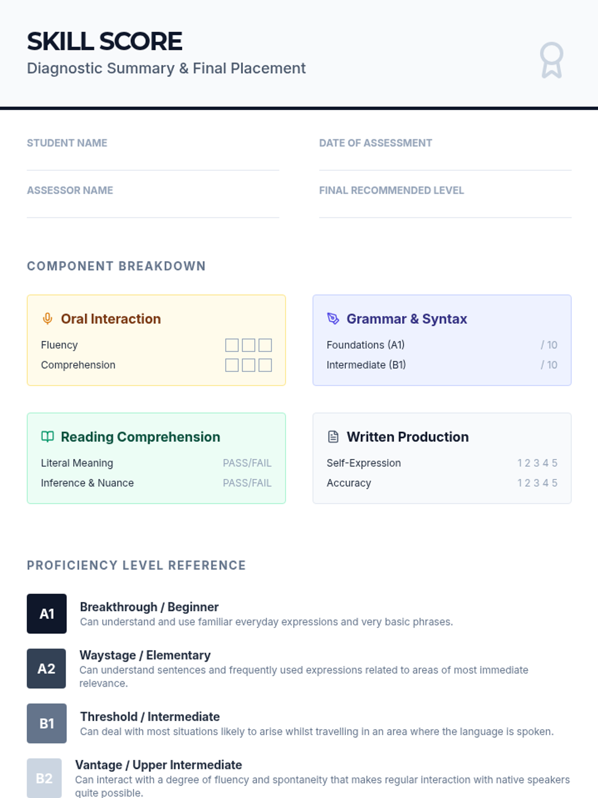 A comprehensive diagnostic assessment suite designed for adult learners to determine their current Spanish proficiency level across reading, writing, listening, and speaking. The materials move from foundational basics to advanced structures to provide a clear placement for the learner.