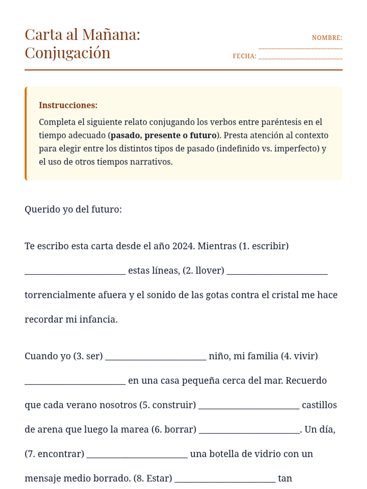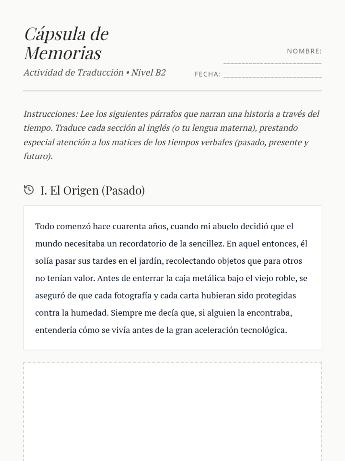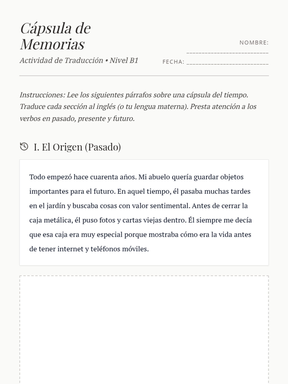 A B1-level Spanish lesson for adults focusing on narrative tenses. Students practice translating a multi-tense text and completing a verb-focused fill-in-the-blanks activity centered around the theme of time and personal history. Includes simplified vocabulary and clearer tense structures.
