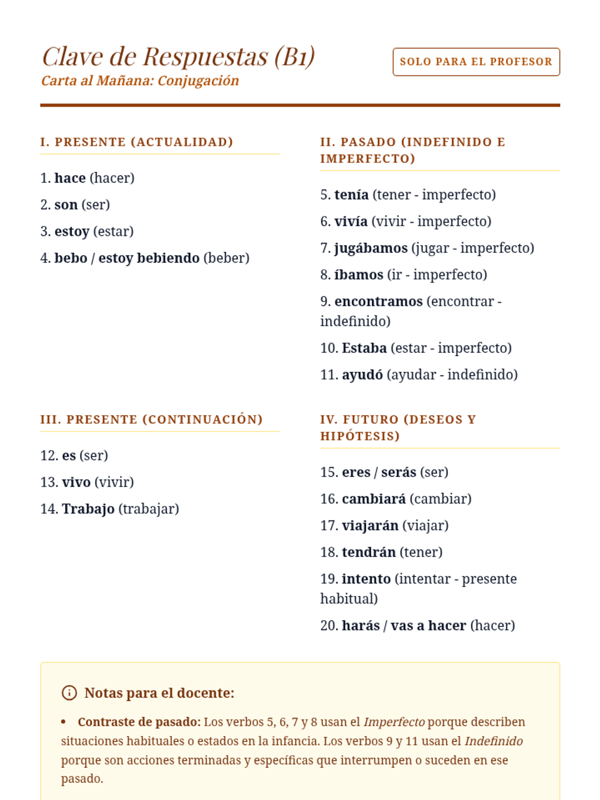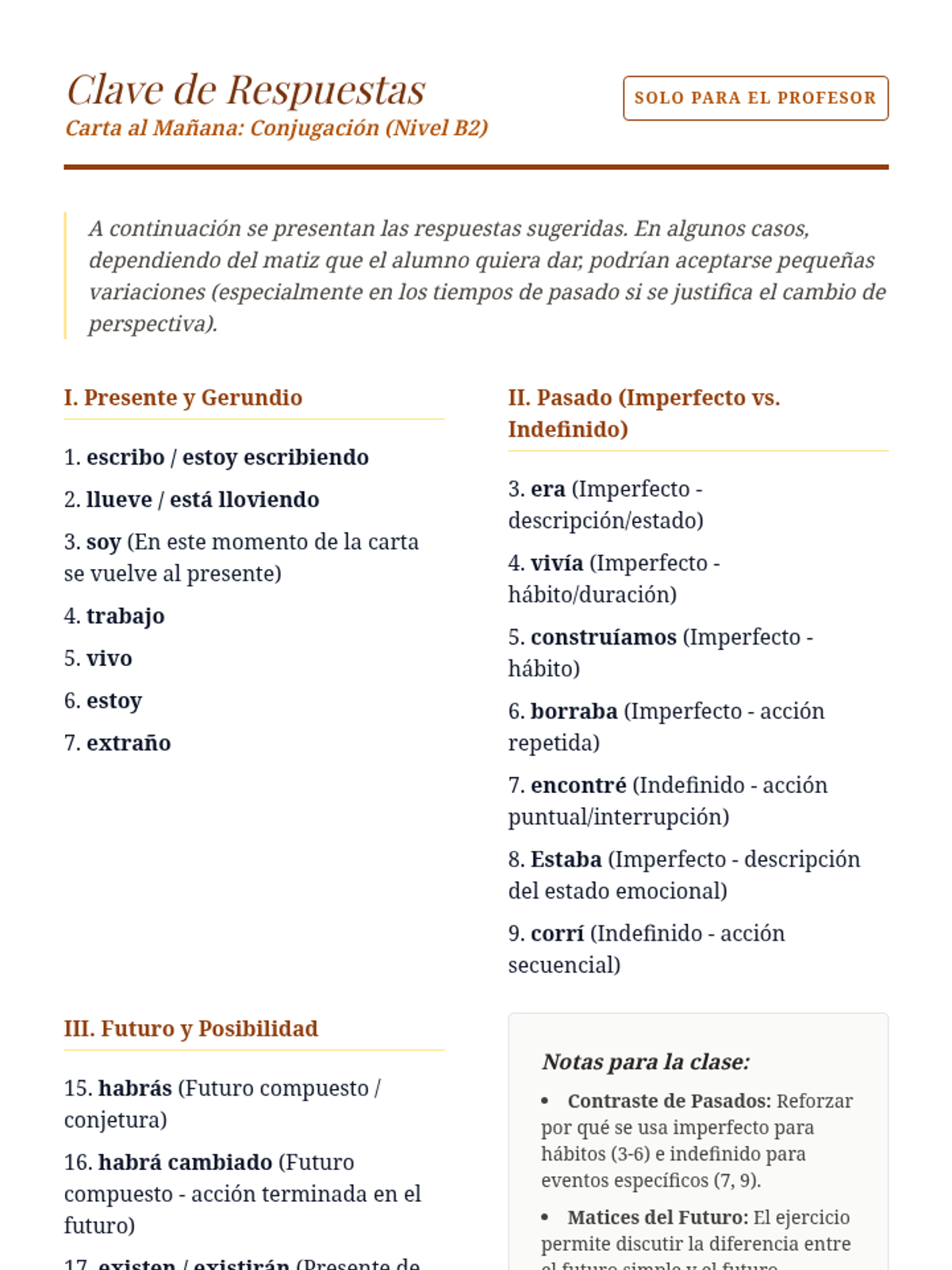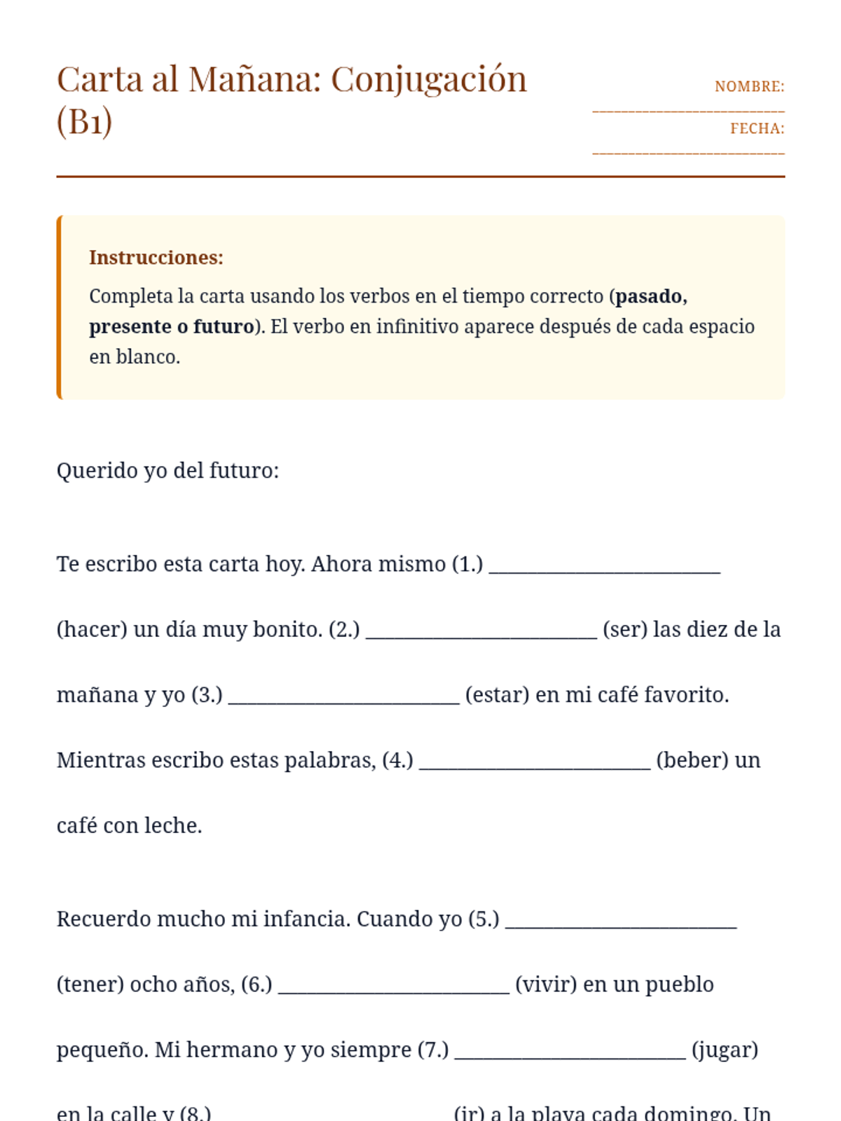 A B1-level Spanish lesson for adults focusing on narrative tenses. Students practice translating a multi-tense text and completing a verb-focused fill-in-the-blanks activity centered around the theme of time and personal history. Includes simplified vocabulary and clearer tense structures.