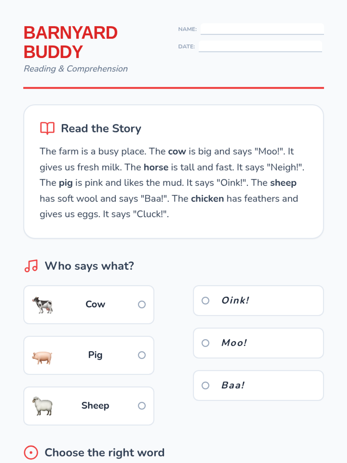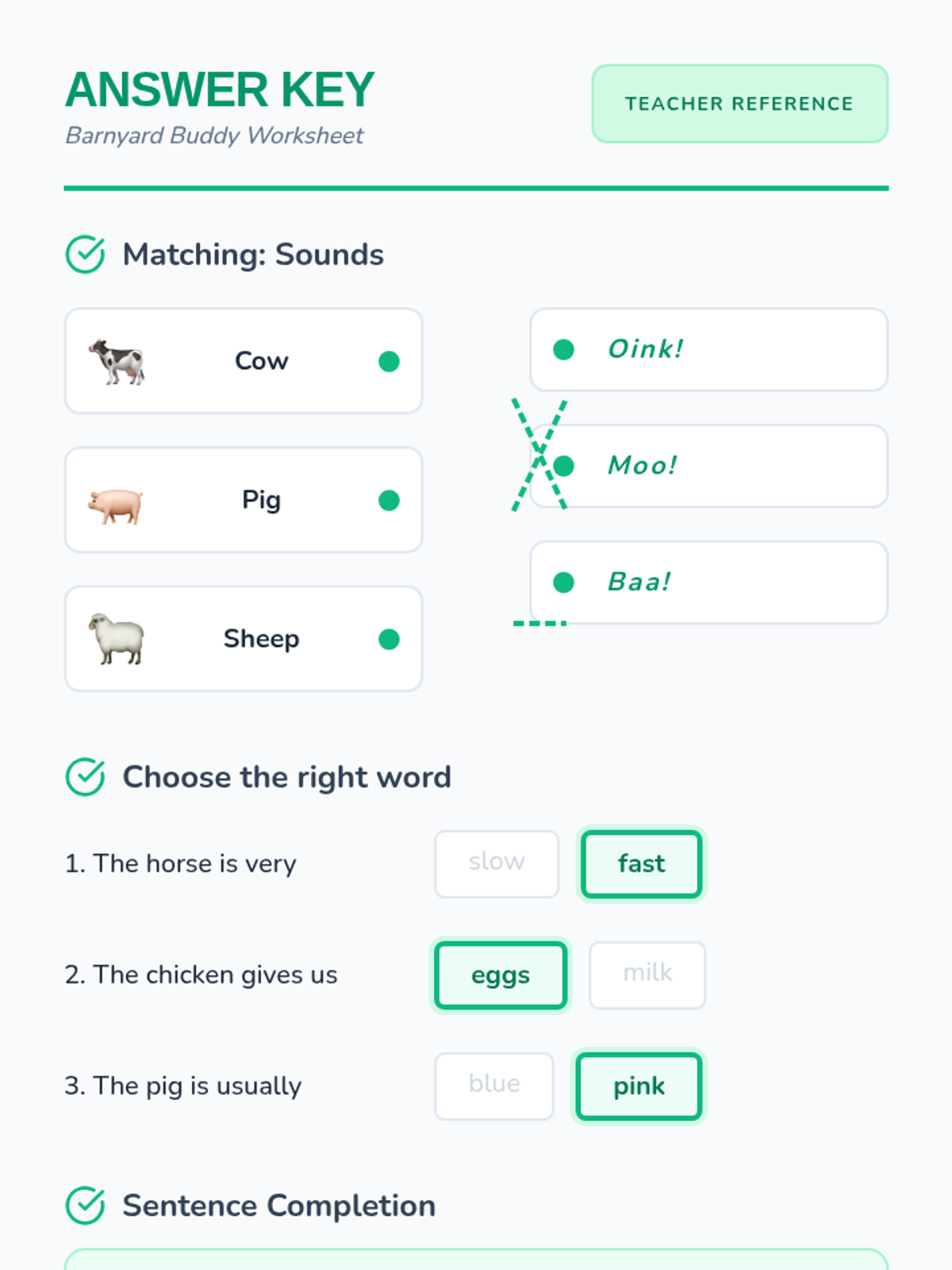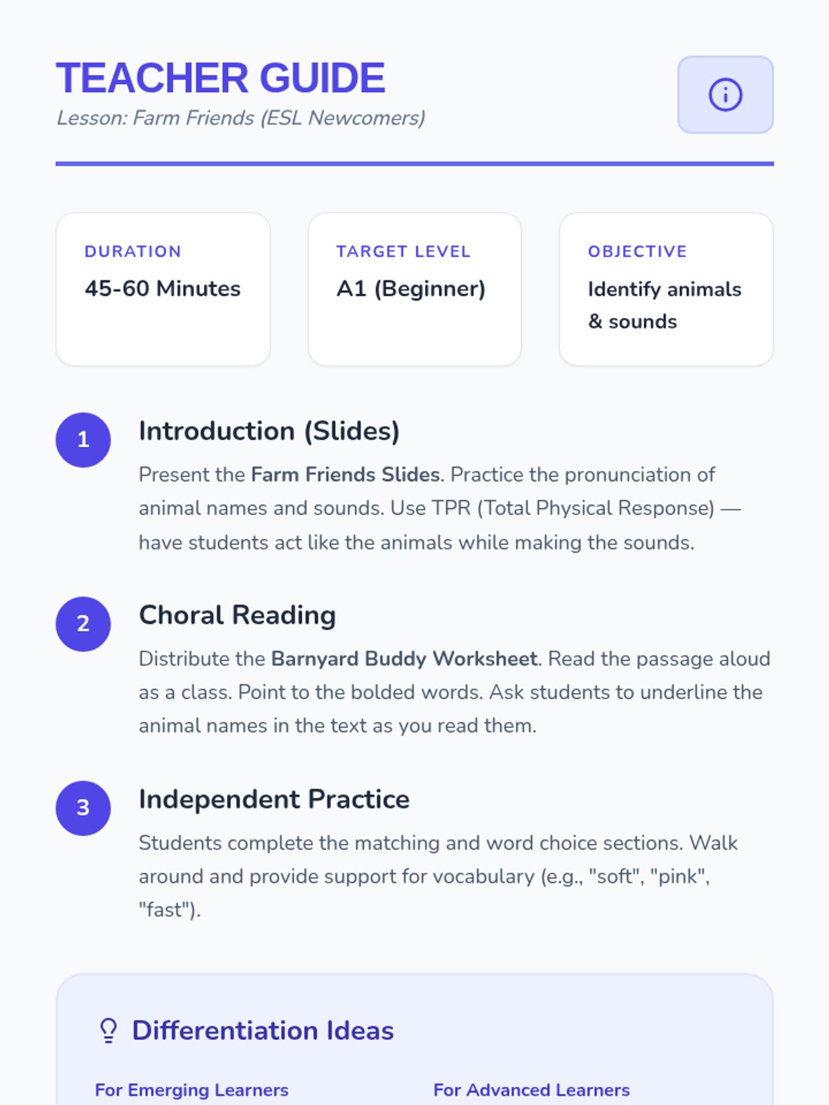 A beginner-friendly lesson introducing common farm animals, their sounds, and basic characteristics for ESL newcomers. Includes a visual slide deck, a reading comprehension worksheet, and an answer key.