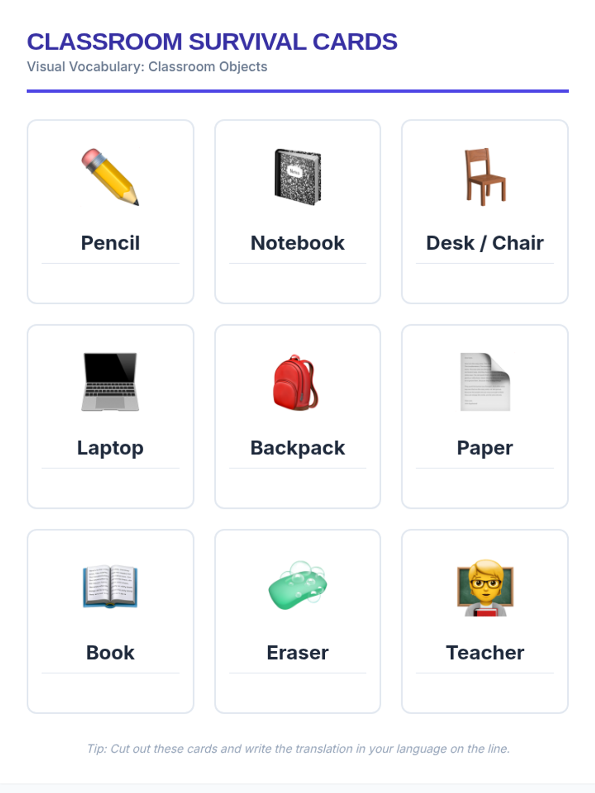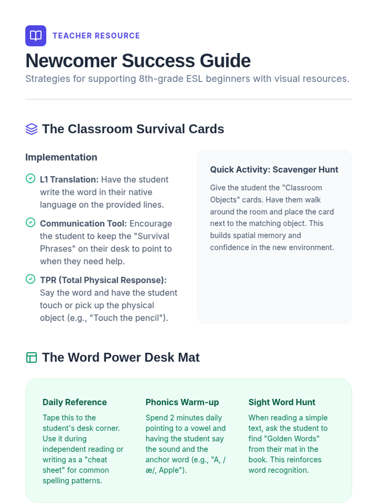 This lesson provides essential visual tools for 8th-grade ESL beginners, focusing on classroom navigation, common objects, and foundational phonics to build immediate confidence and communication skills.