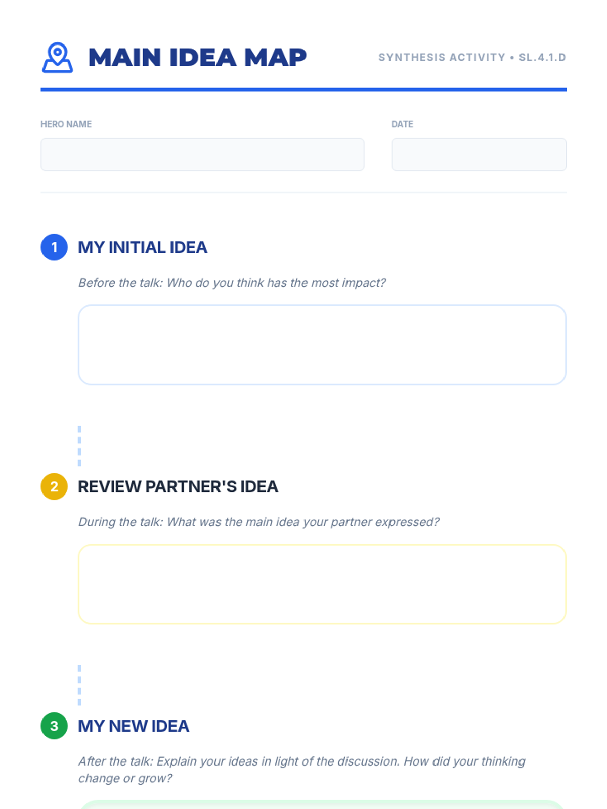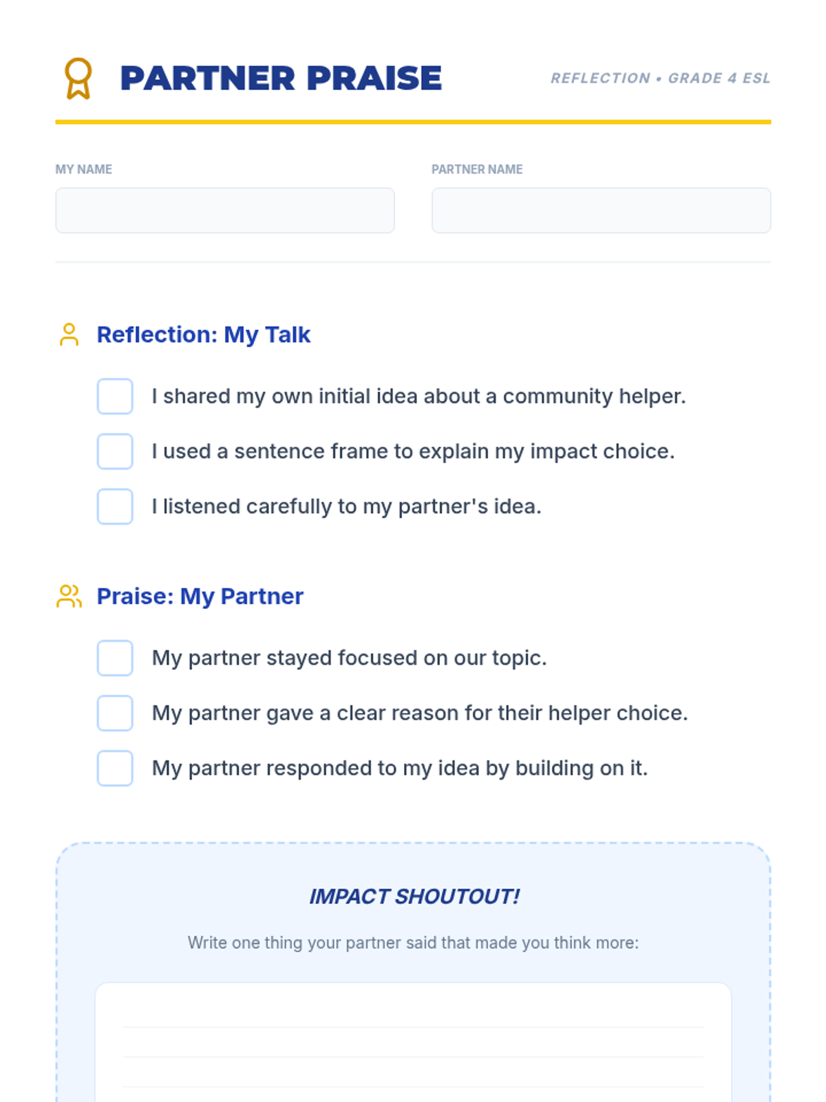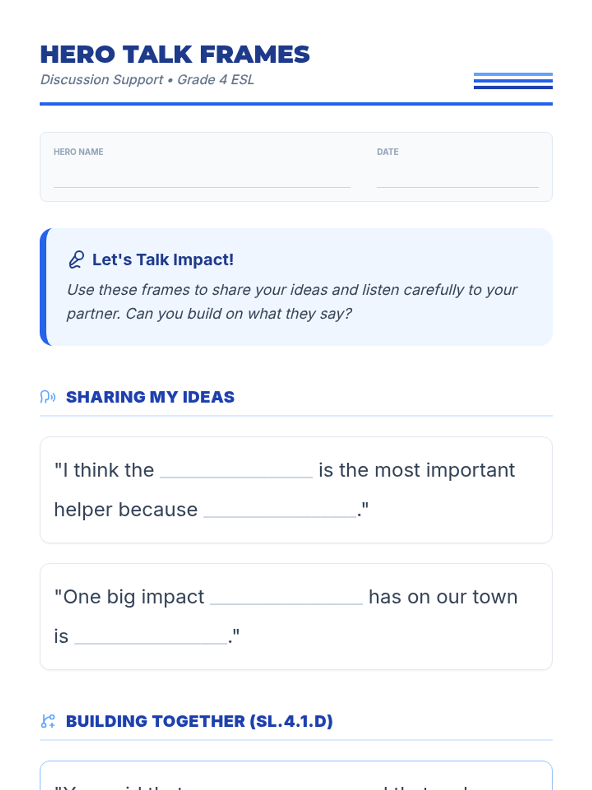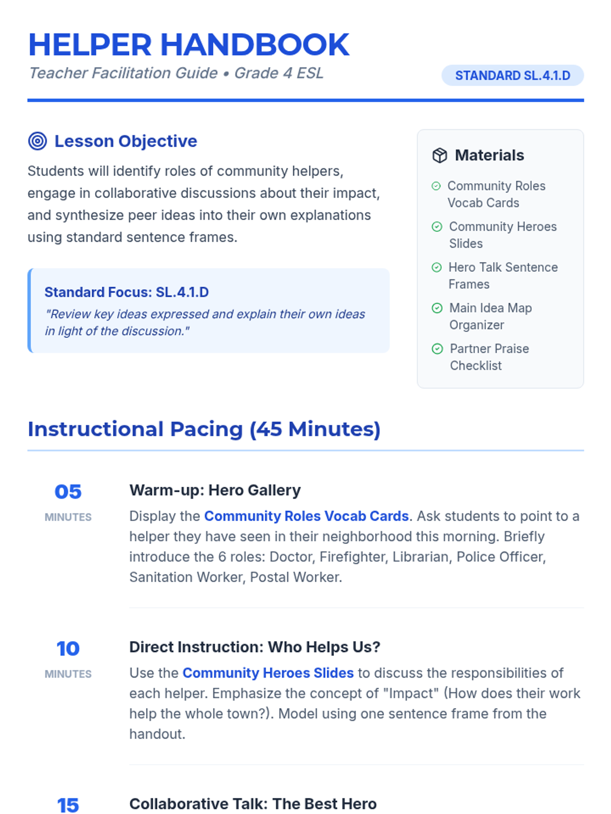A 45-minute ESL lesson for 4th grade focused on discussing community helpers and synthesizing ideas from peer conversations. Students will learn key vocabulary and practice active listening and responding skills.