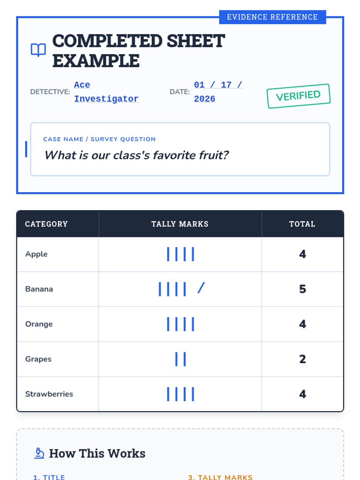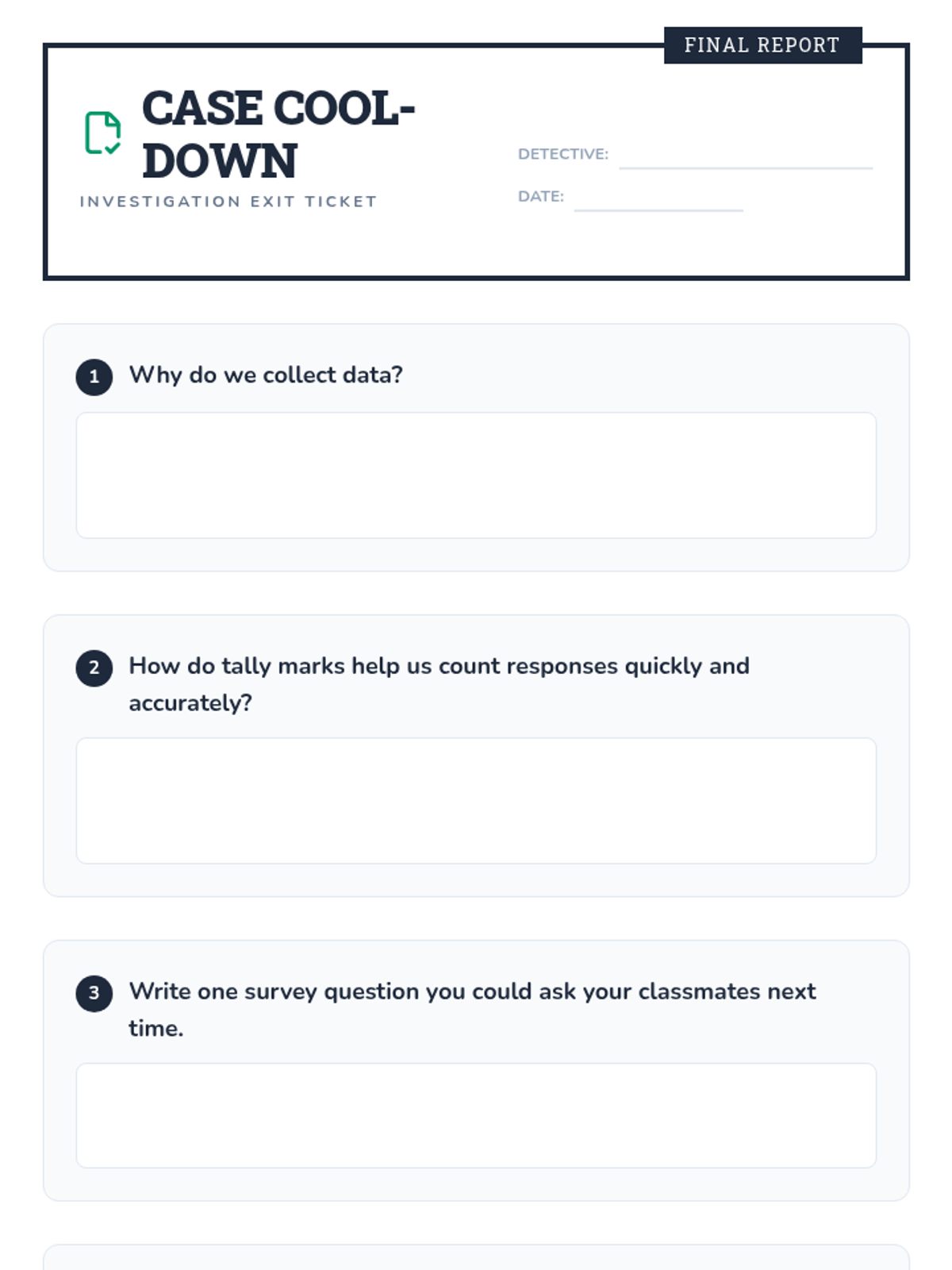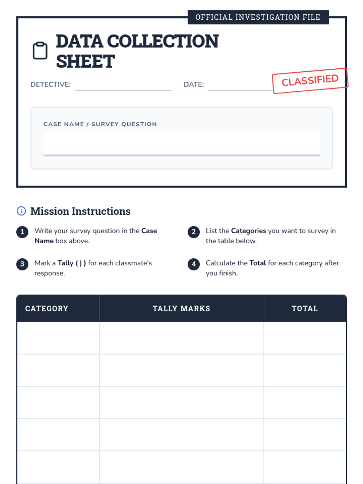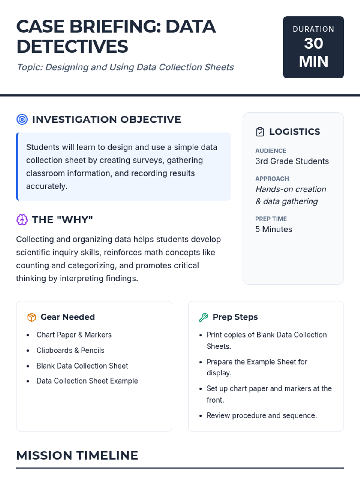 A 30-minute introductory lesson for 3rd graders on designing and using data collection sheets to gather, record, and interpret classroom information through a 'detective' lens.