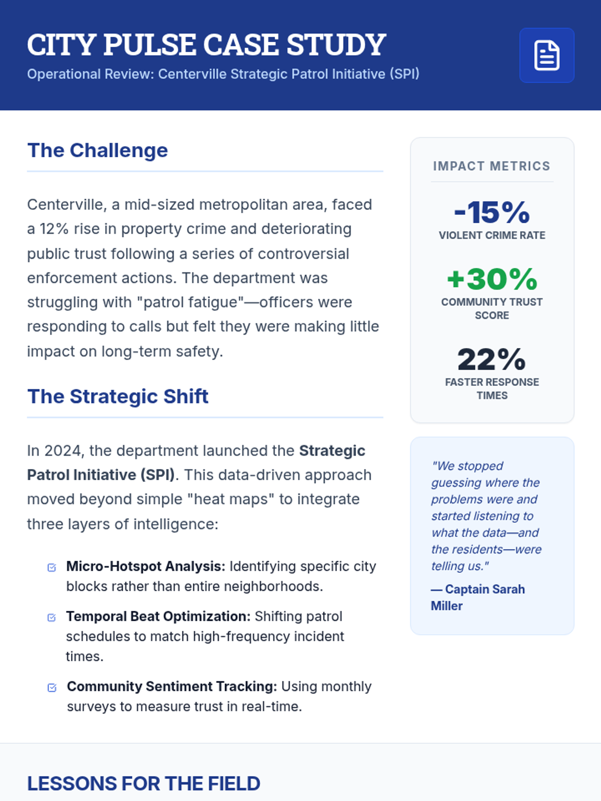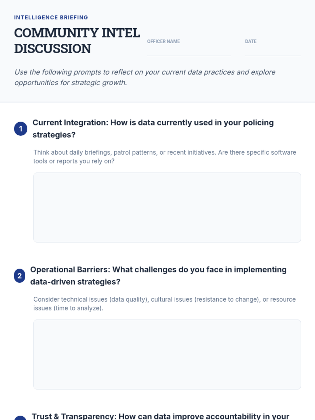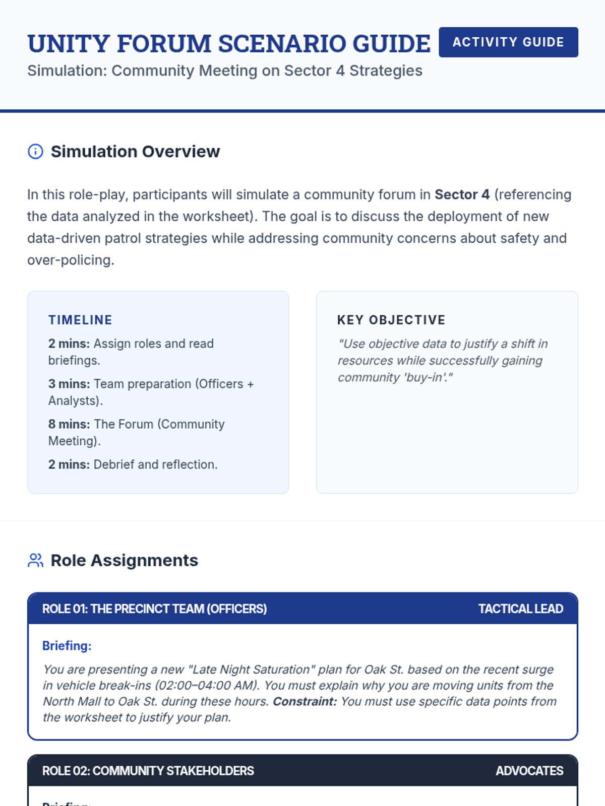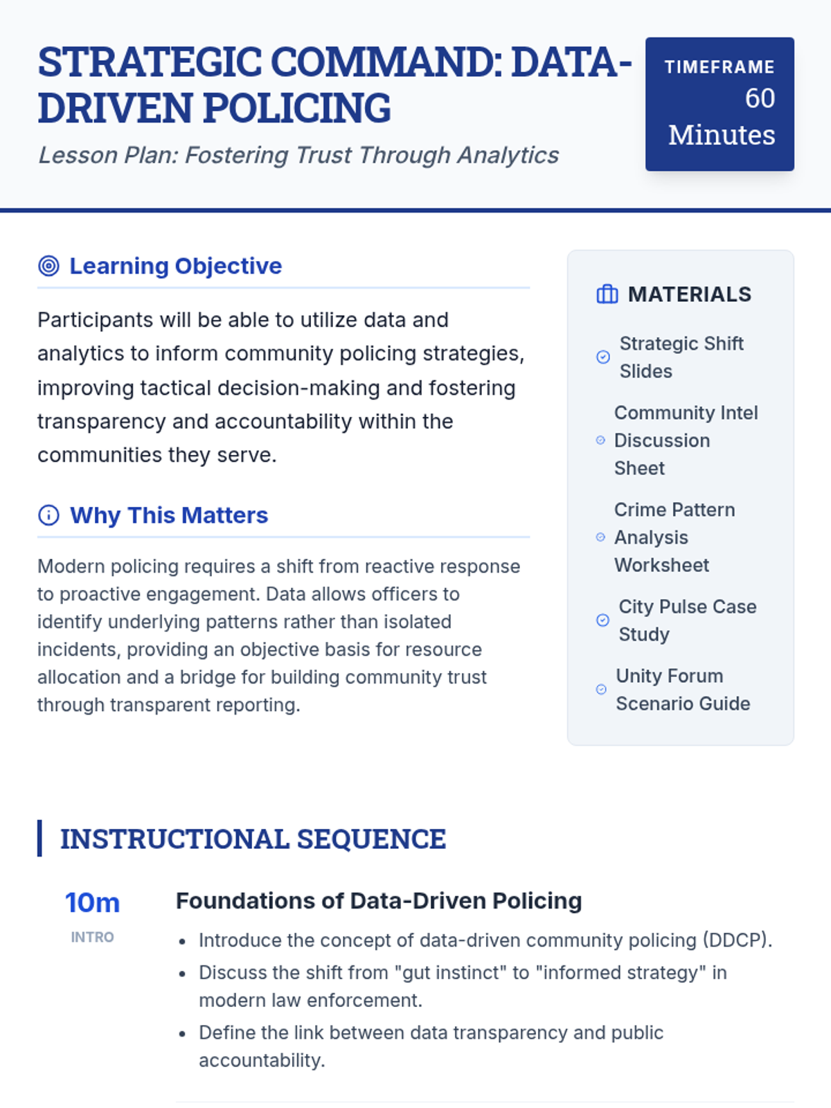 This lesson introduces police officers to the use of data and analytics in community policing, focusing on improving decision-making, accountability, and community trust. Participants will engage in data analysis, role-playing, and case study reviews to practicalize these strategies.