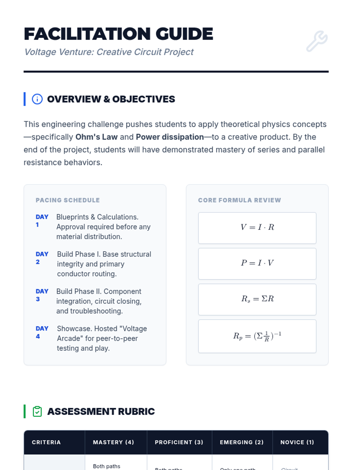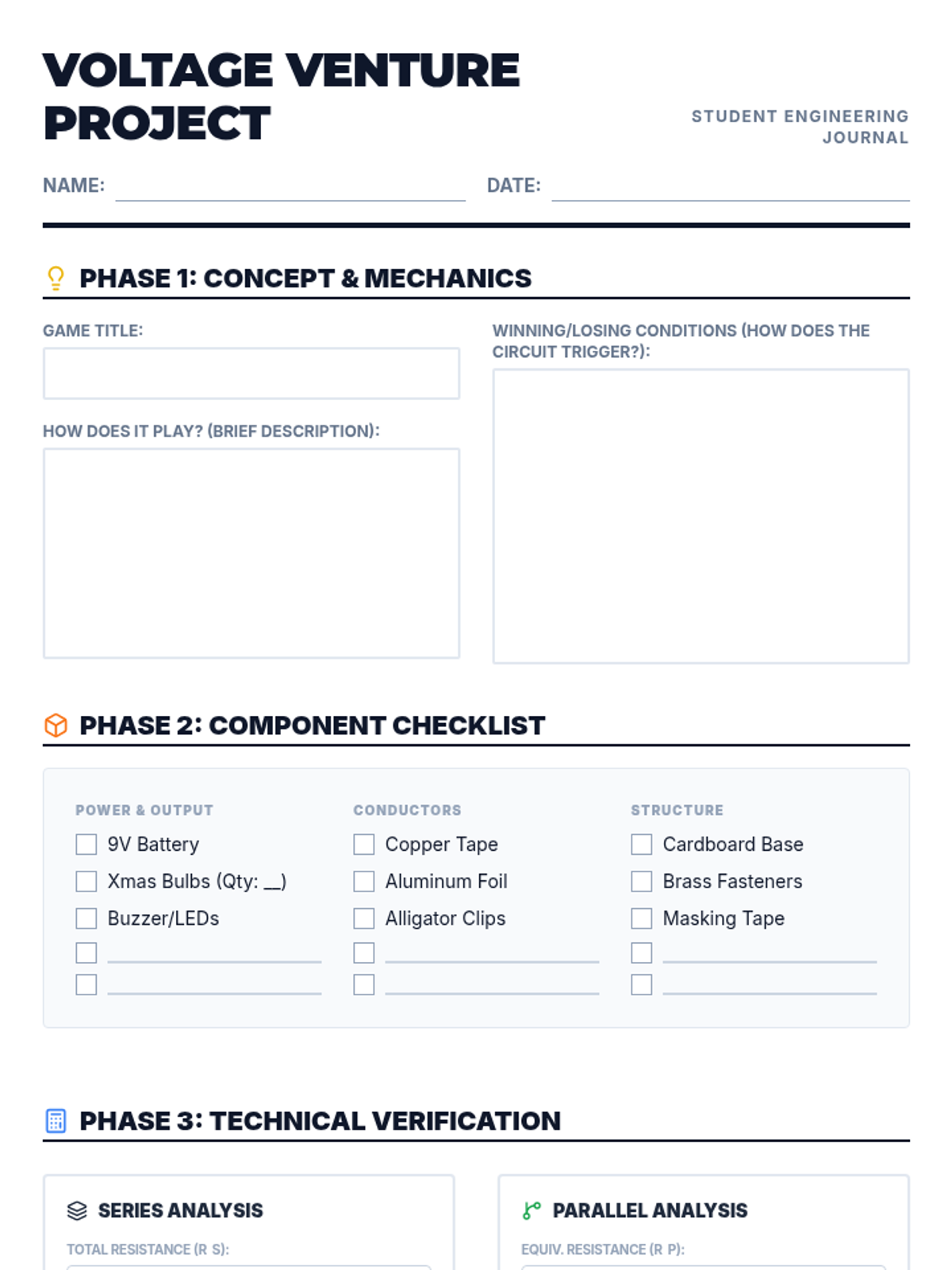 A creative engineering project where students design and build a game that incorporates functional series and parallel circuits, applying principles of Ohm's Law and electric power.