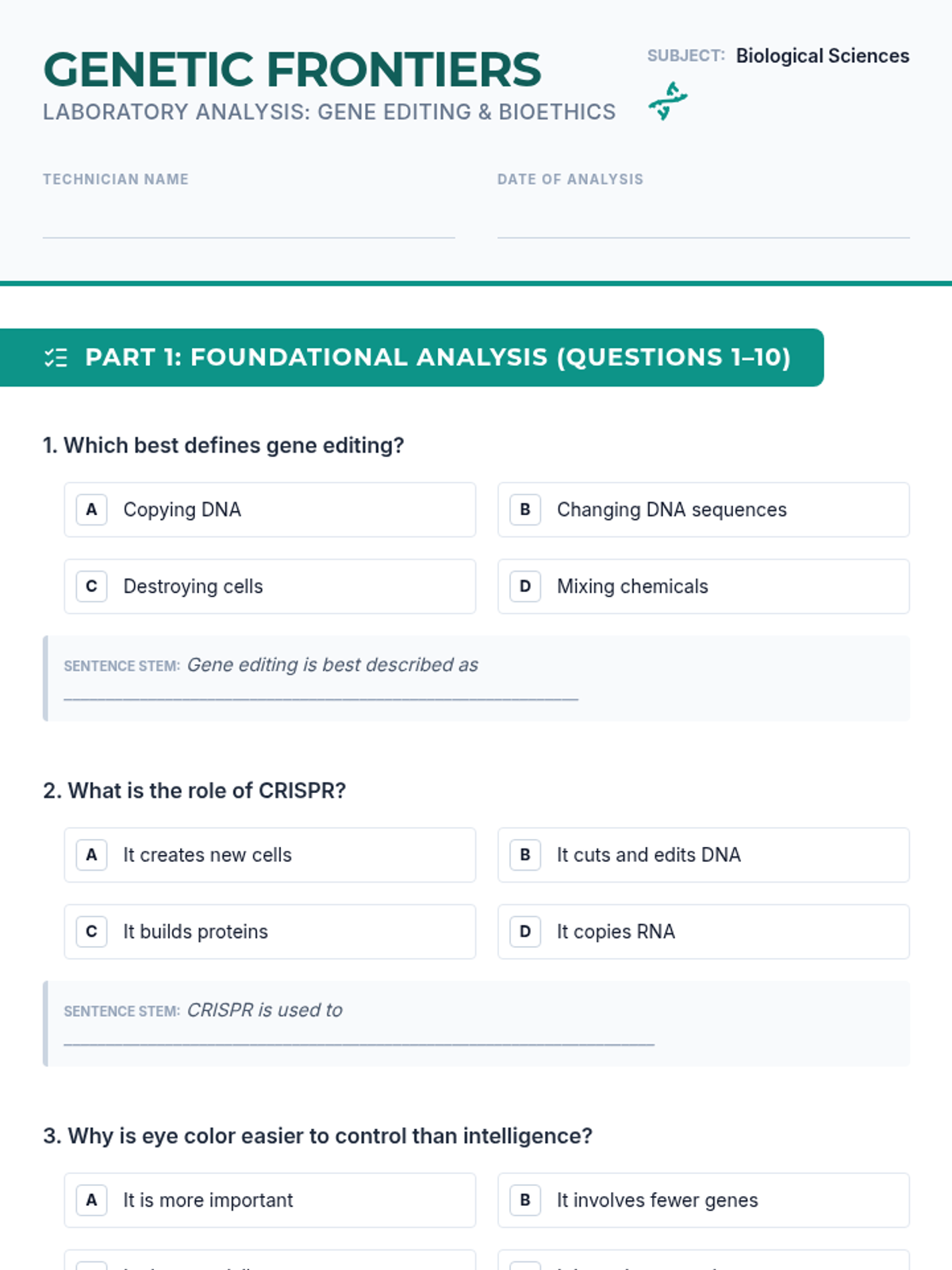 A comprehensive lesson exploring the science, ethics, and consequences of gene editing through the fictional case study of Zion. Students will learn about CRISPR, pleiotropy, and the societal implications of 'designer' traits.
