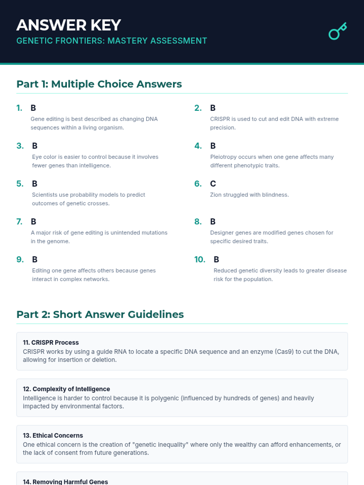 A comprehensive exploration of genetic engineering, focusing on CRISPR technology, the complexities of pleiotropy, and the ethical implications of designer genes. Students analyze the trade-offs between medical advancement and genetic diversity.